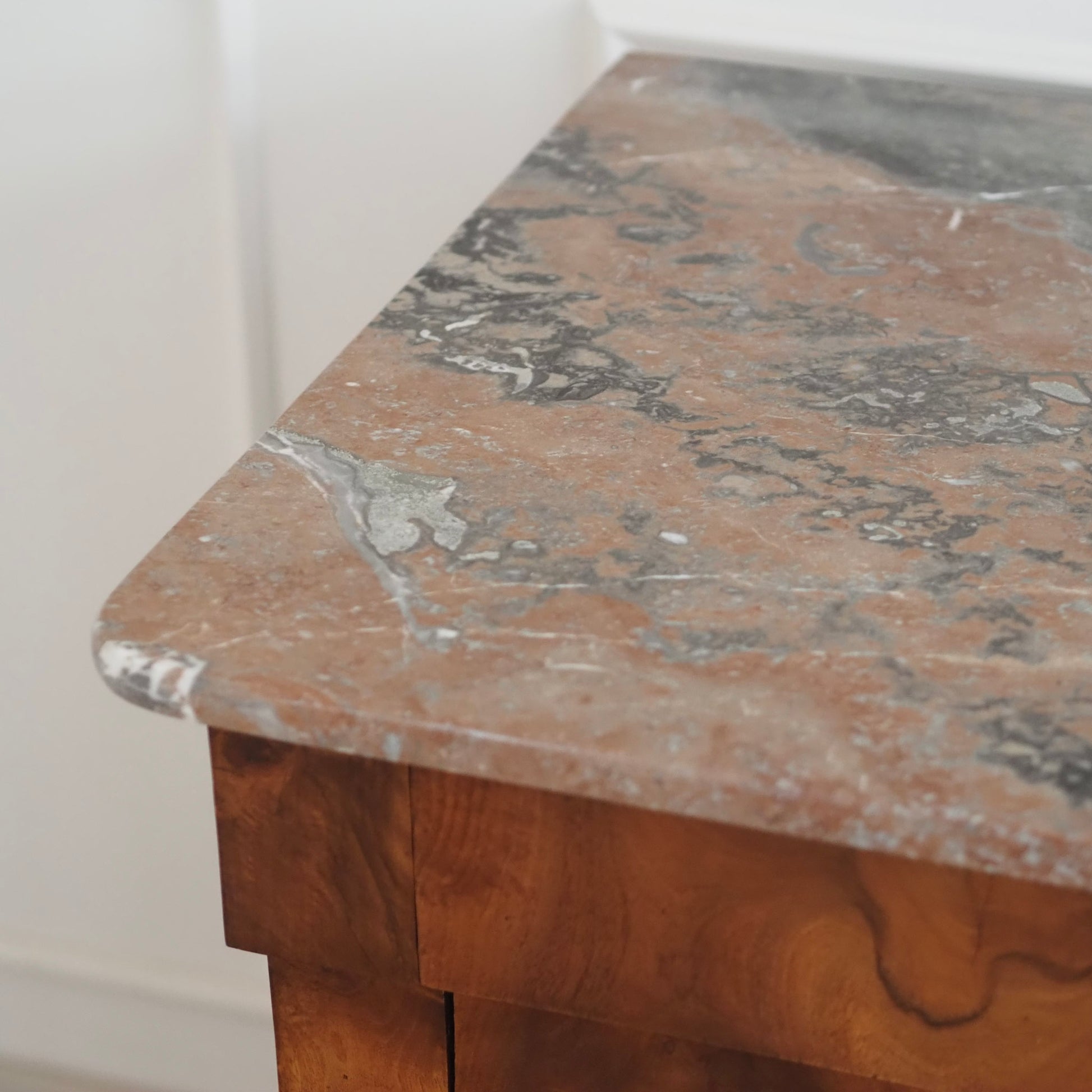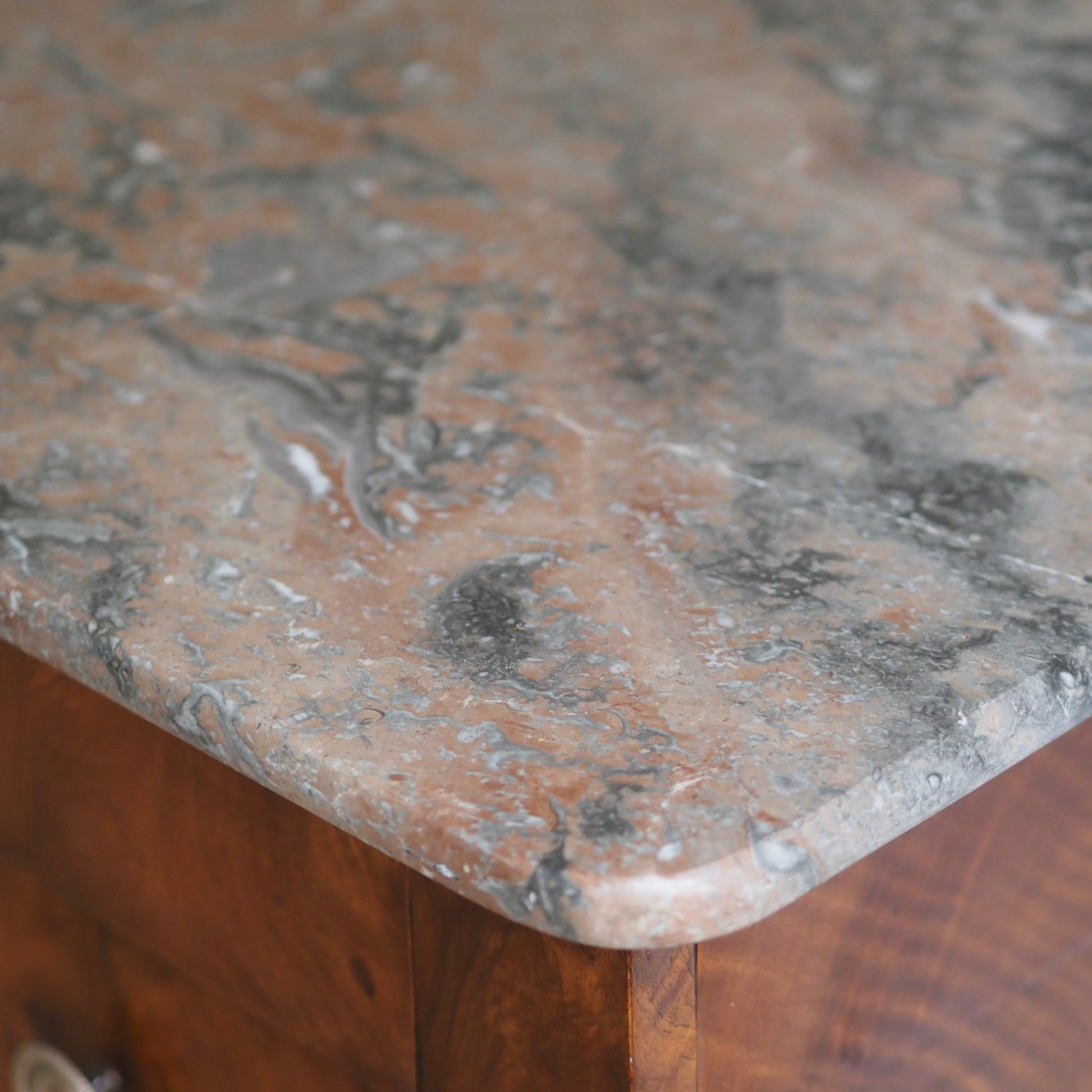Edle und repräsentative Kommode aus der Empirezeit mit drei großen Schubladen und einer grifflosen versteckten Schublade unter der Marmorplatte. Diese ist original und mit einer sehr schönen Maserung in grau-rosa durchzogen. Die klassische Formgebung der Kommode und das Nussbaumwurzelfurnier mit schöner Maserung sowie die originalen Beschläge machen dieses Stück zu einem eleganten und eindrucksvollen Hingucker!