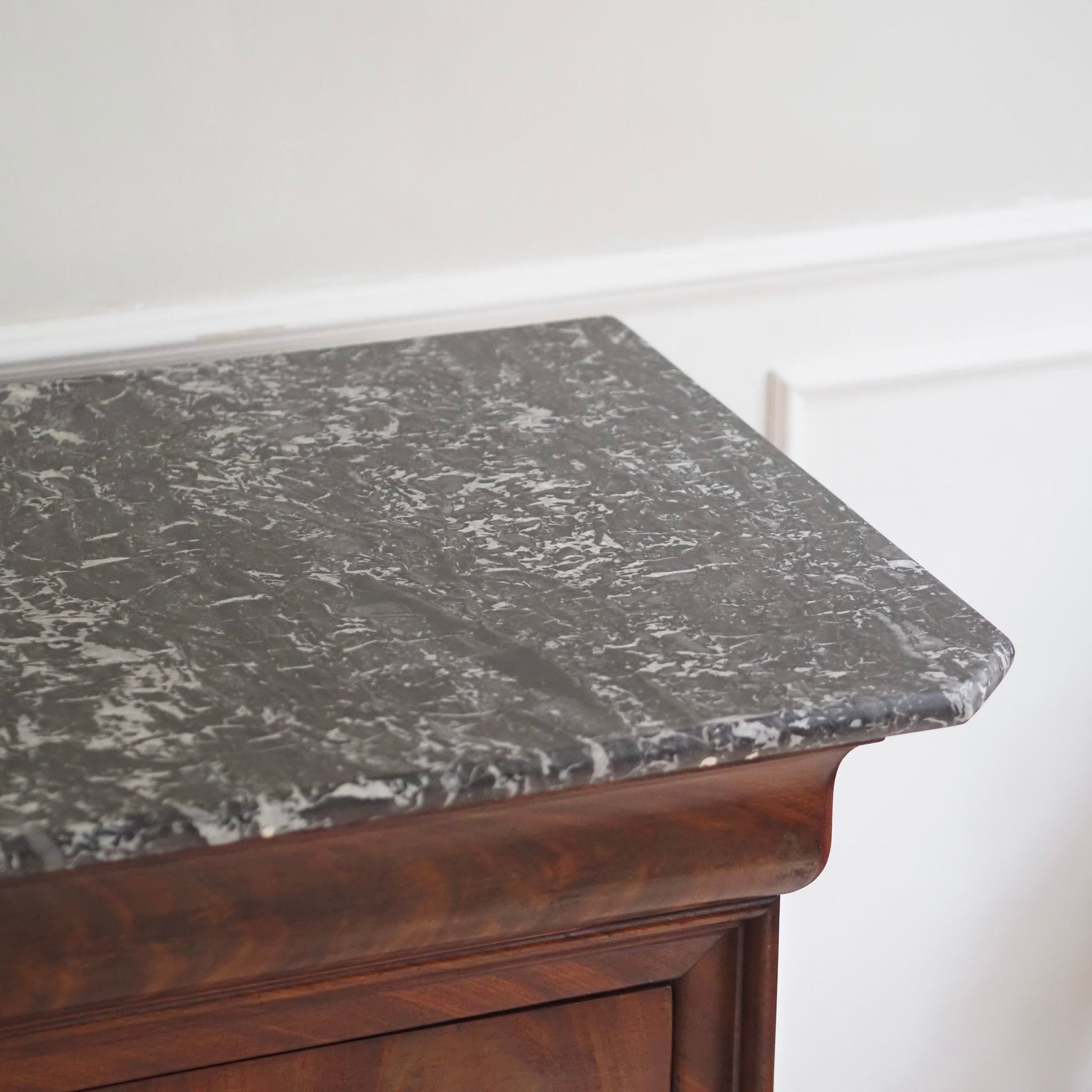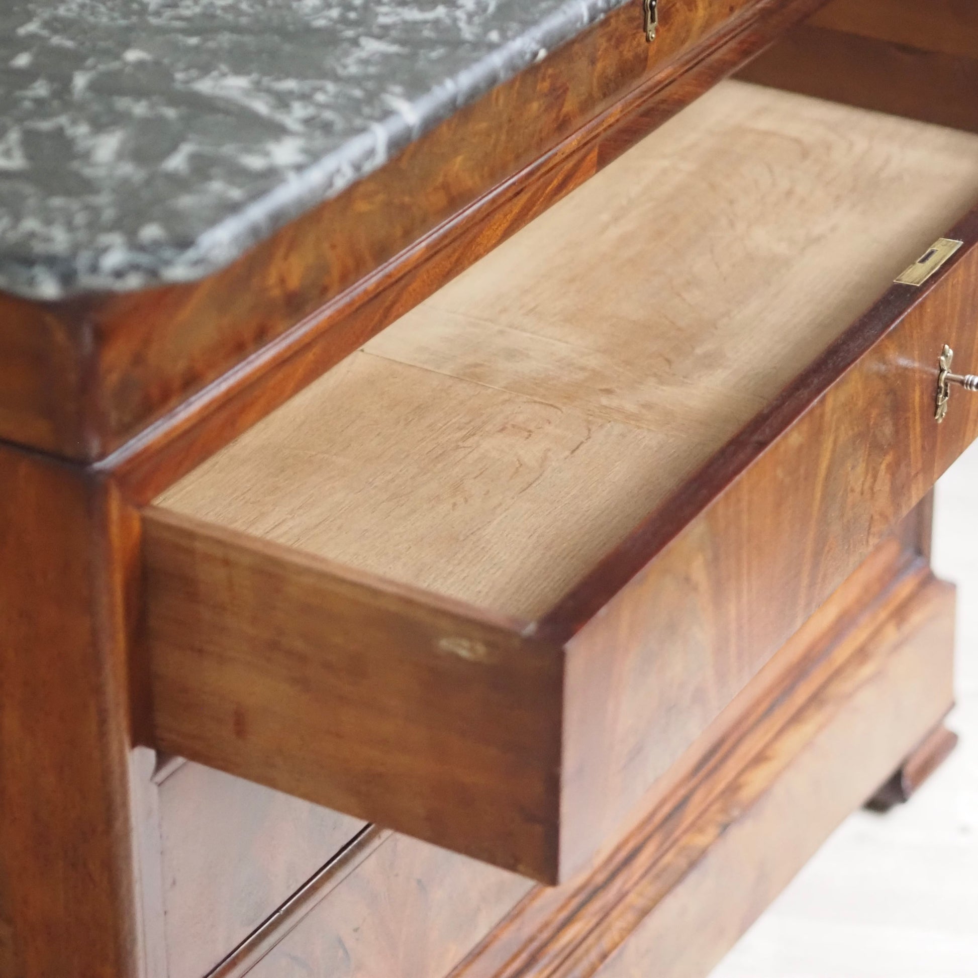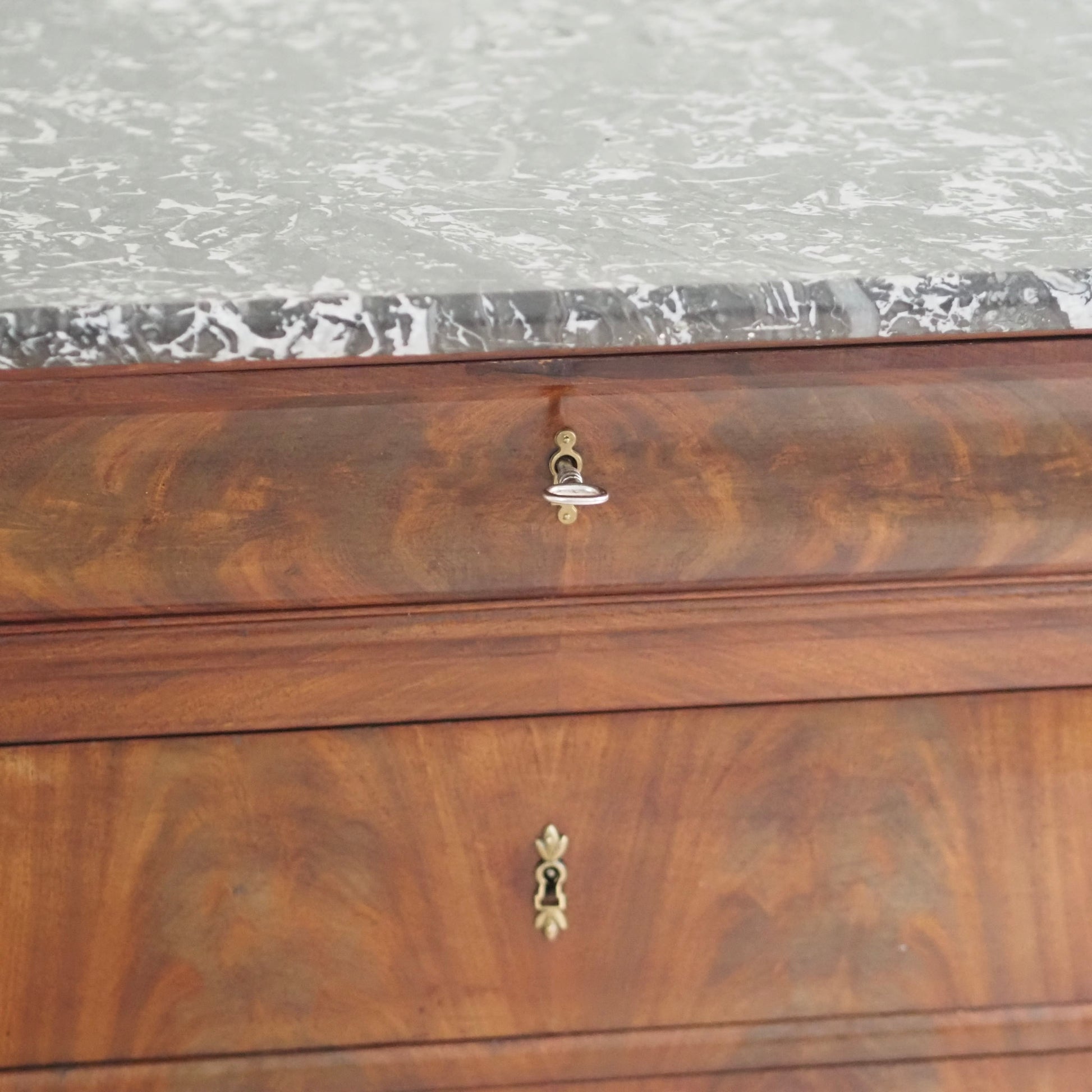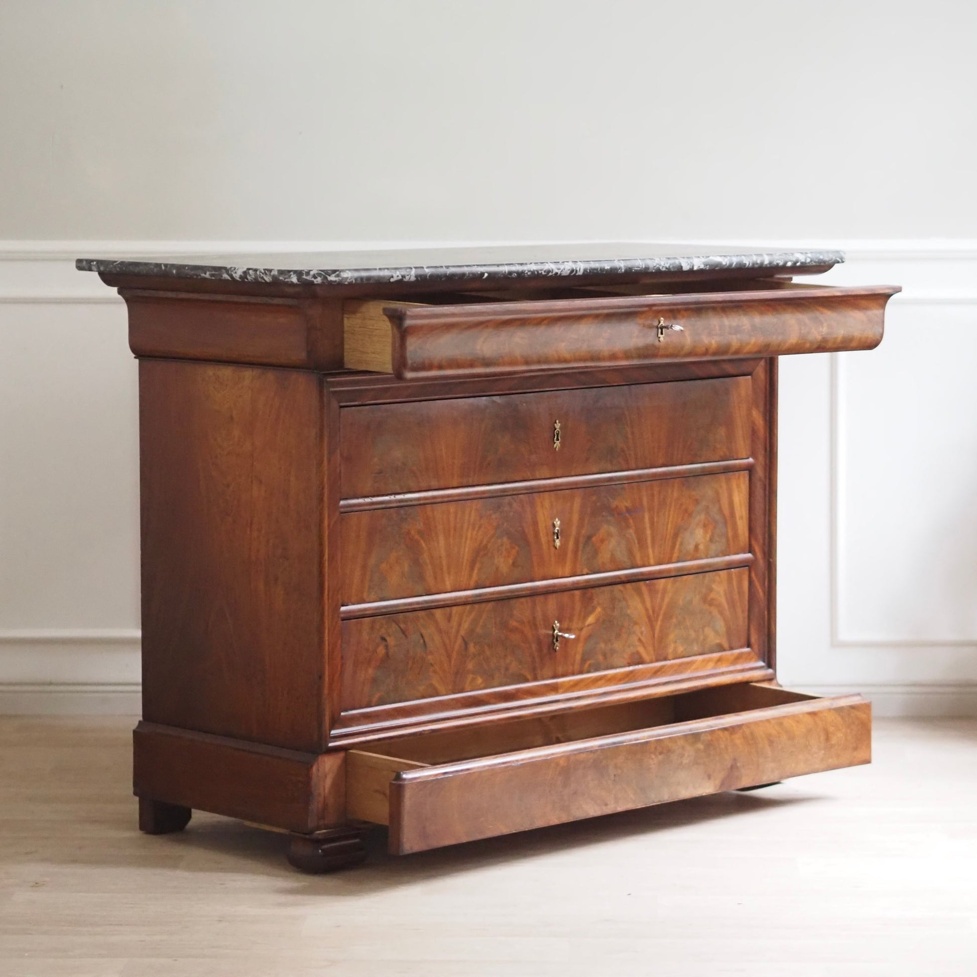 Diese prachtvolle antike Marmorkommode aus Frankreich beeindruckt mit ihrem edel geflammten Mahagoni-Wurzelfurnier, der harmonischen Maserung und einer massiven grau-weiß-schwarzen Marmorplatte. Die schlichte Eleganz des Louis-Philippe-Stils macht sie zu einem zeitlosen Möbelstück mit besonderem Charme. Drei große Schubladen, eine untere bündige geheime und eine obere schmalere sorgen für reichlich Stauraum.