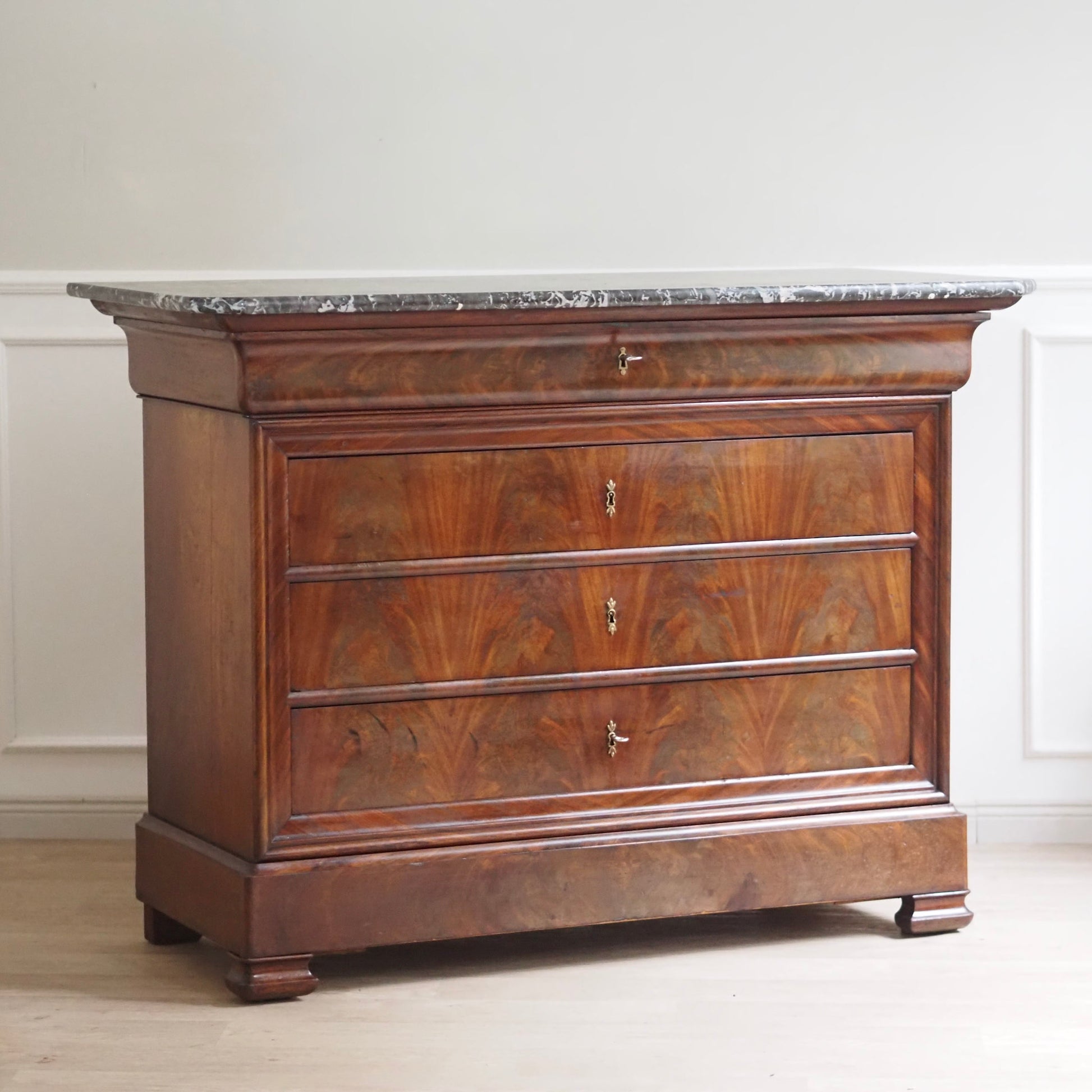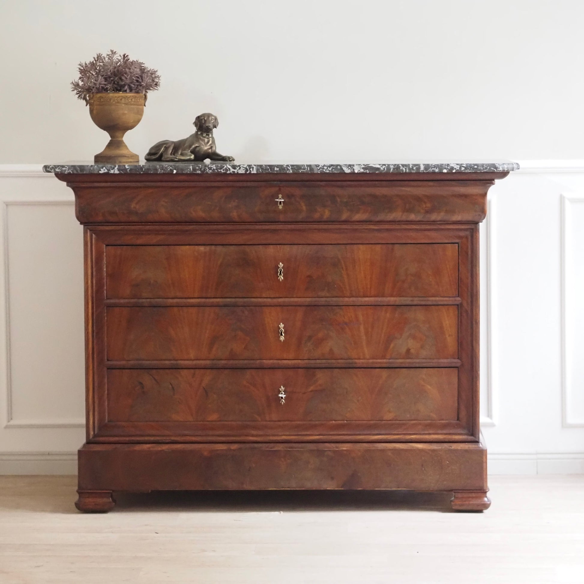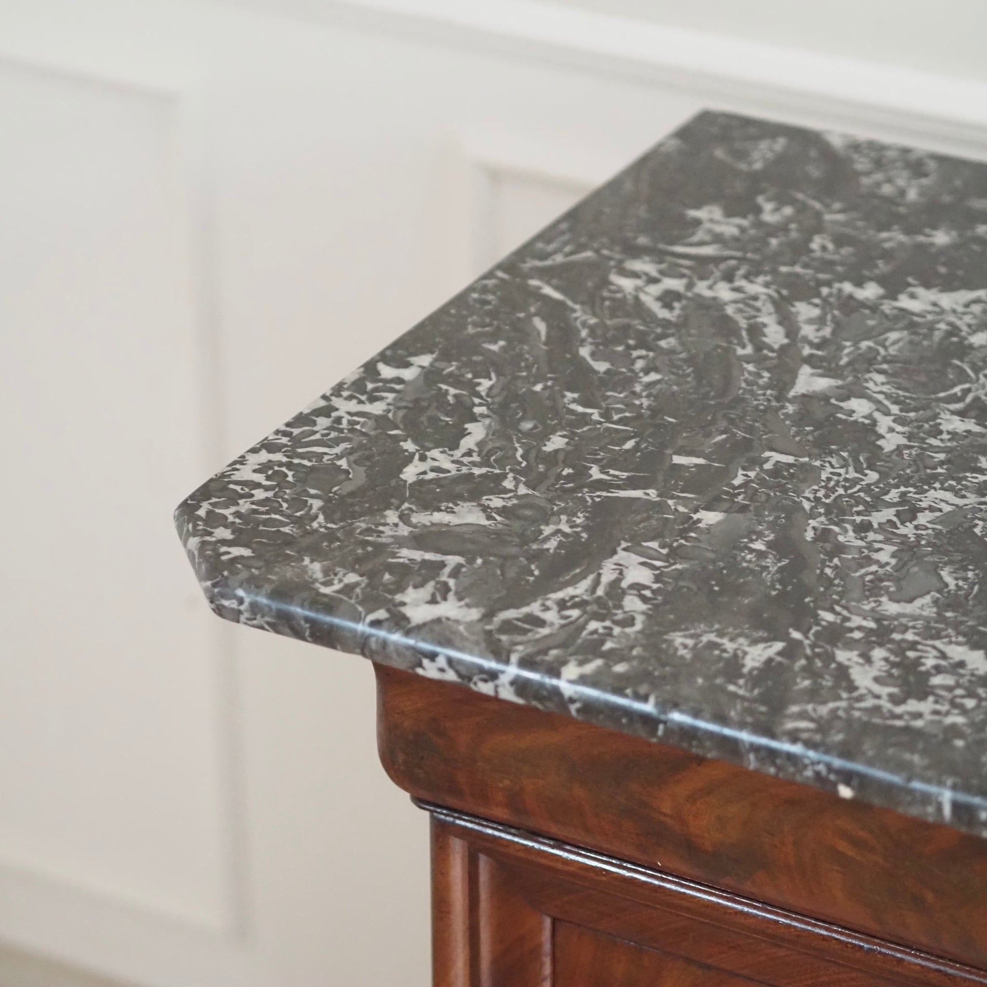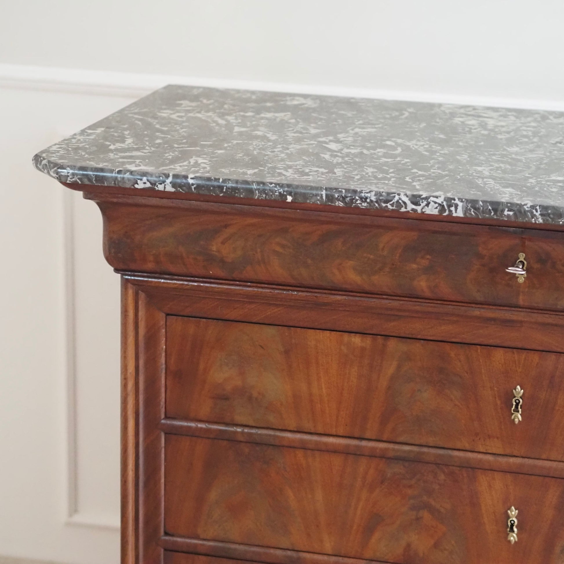 Diese prachtvolle antike Marmorkommode aus Frankreich beeindruckt mit ihrem edel geflammten Mahagoni-Wurzelfurnier, der harmonischen Maserung und einer massiven grau-weiß-schwarzen Marmorplatte. Die schlichte Eleganz des Louis-Philippe-Stils macht sie zu einem zeitlosen Möbelstück mit besonderem Charme. Drei große Schubladen, eine untere bündige geheime und eine obere schmalere sorgen für reichlich Stauraum.