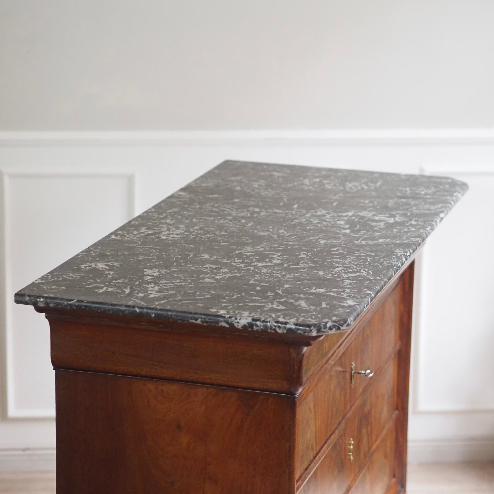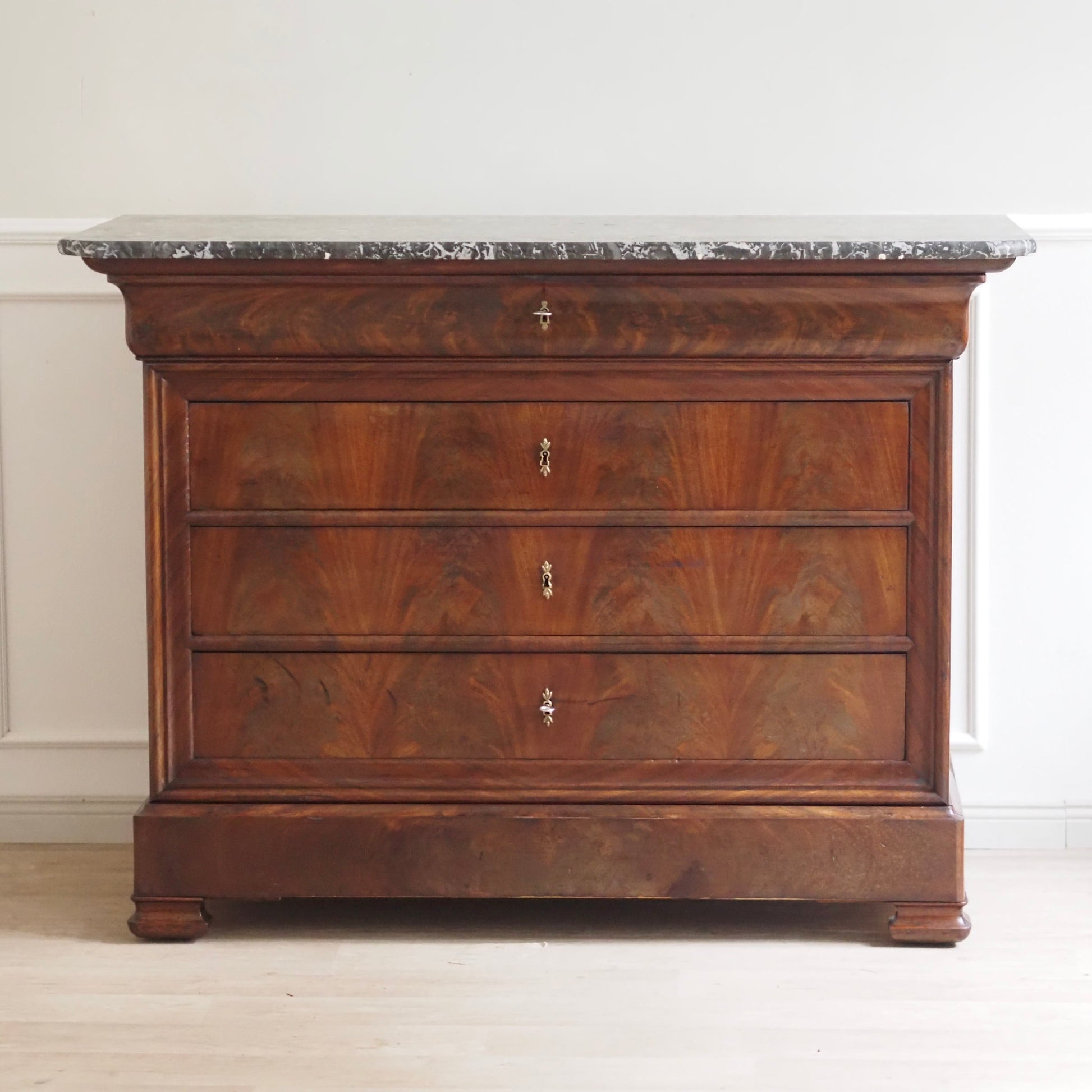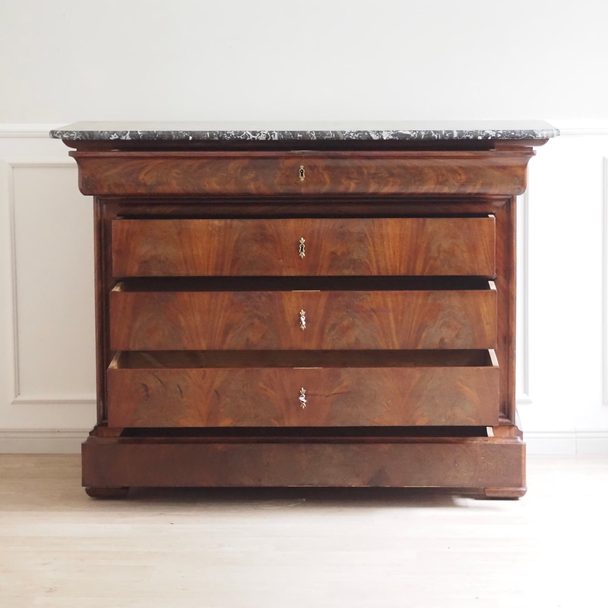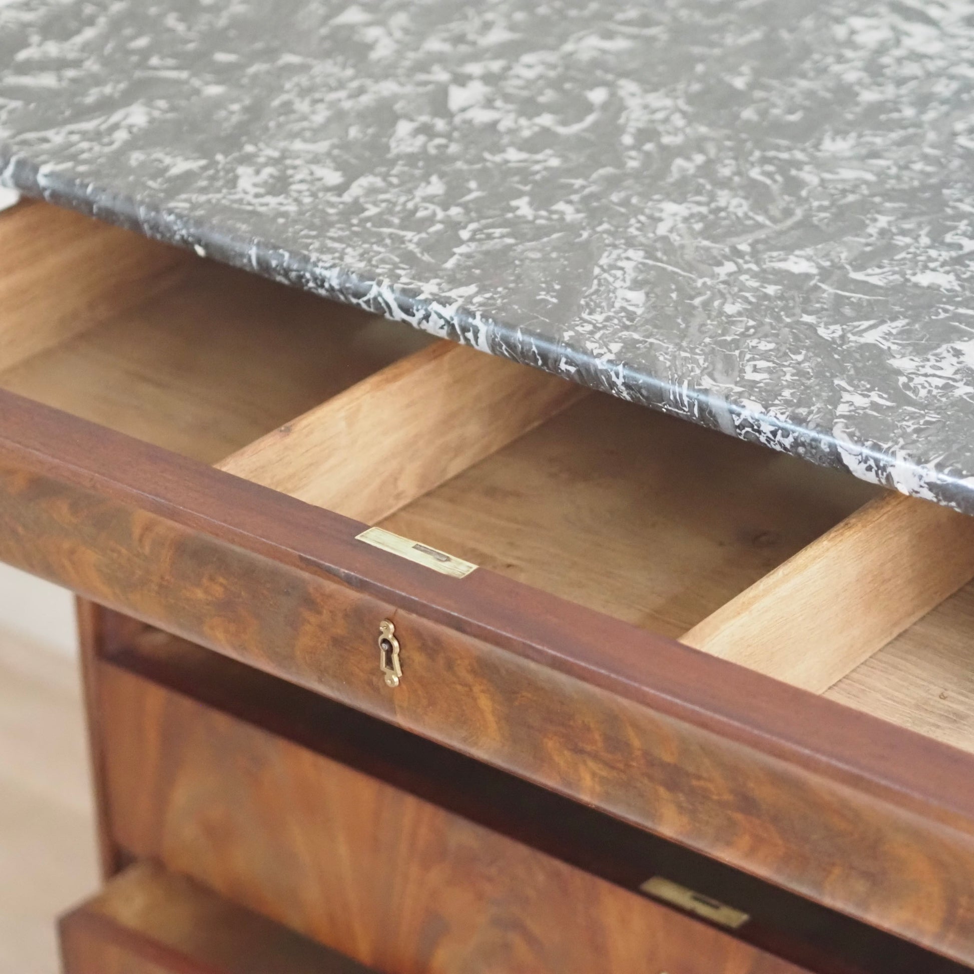 Diese prachtvolle antike Marmorkommode aus Frankreich beeindruckt mit ihrem edel geflammten Mahagoni-Wurzelfurnier, der harmonischen Maserung und einer massiven grau-weiß-schwarzen Marmorplatte. Die schlichte Eleganz des Louis-Philippe-Stils macht sie zu einem zeitlosen Möbelstück mit besonderem Charme. Drei große Schubladen, eine untere bündige geheime und eine obere schmalere sorgen für reichlich Stauraum.