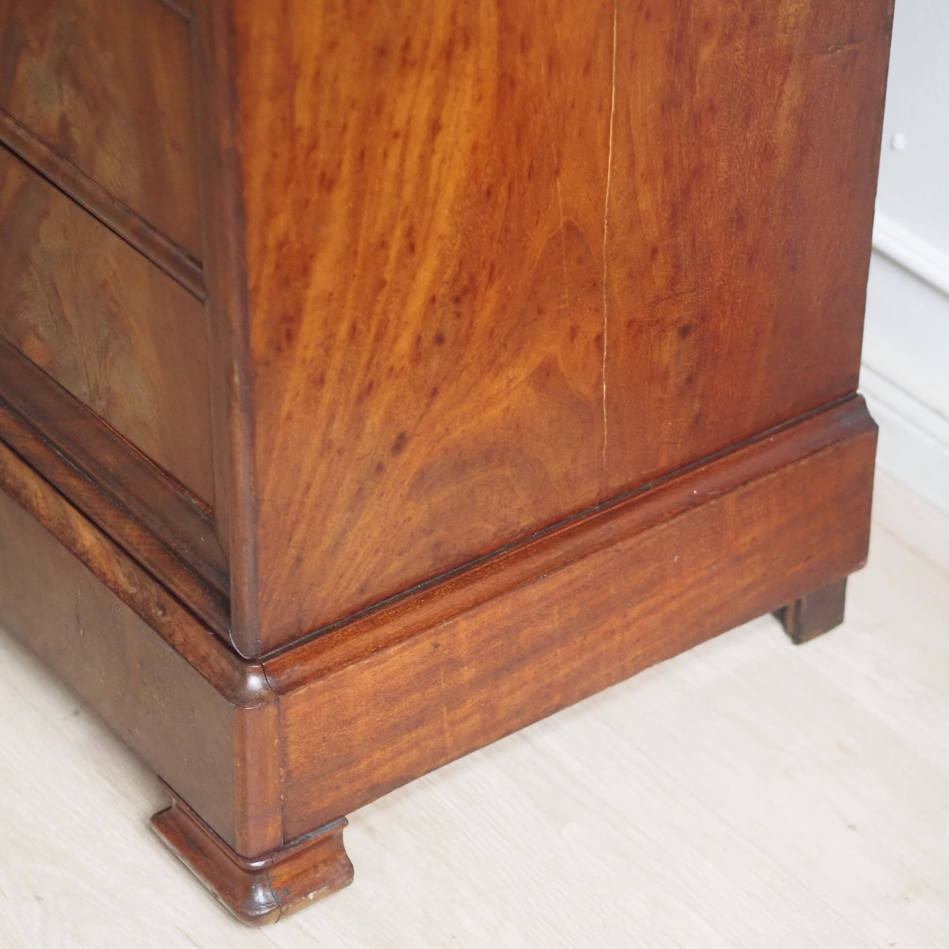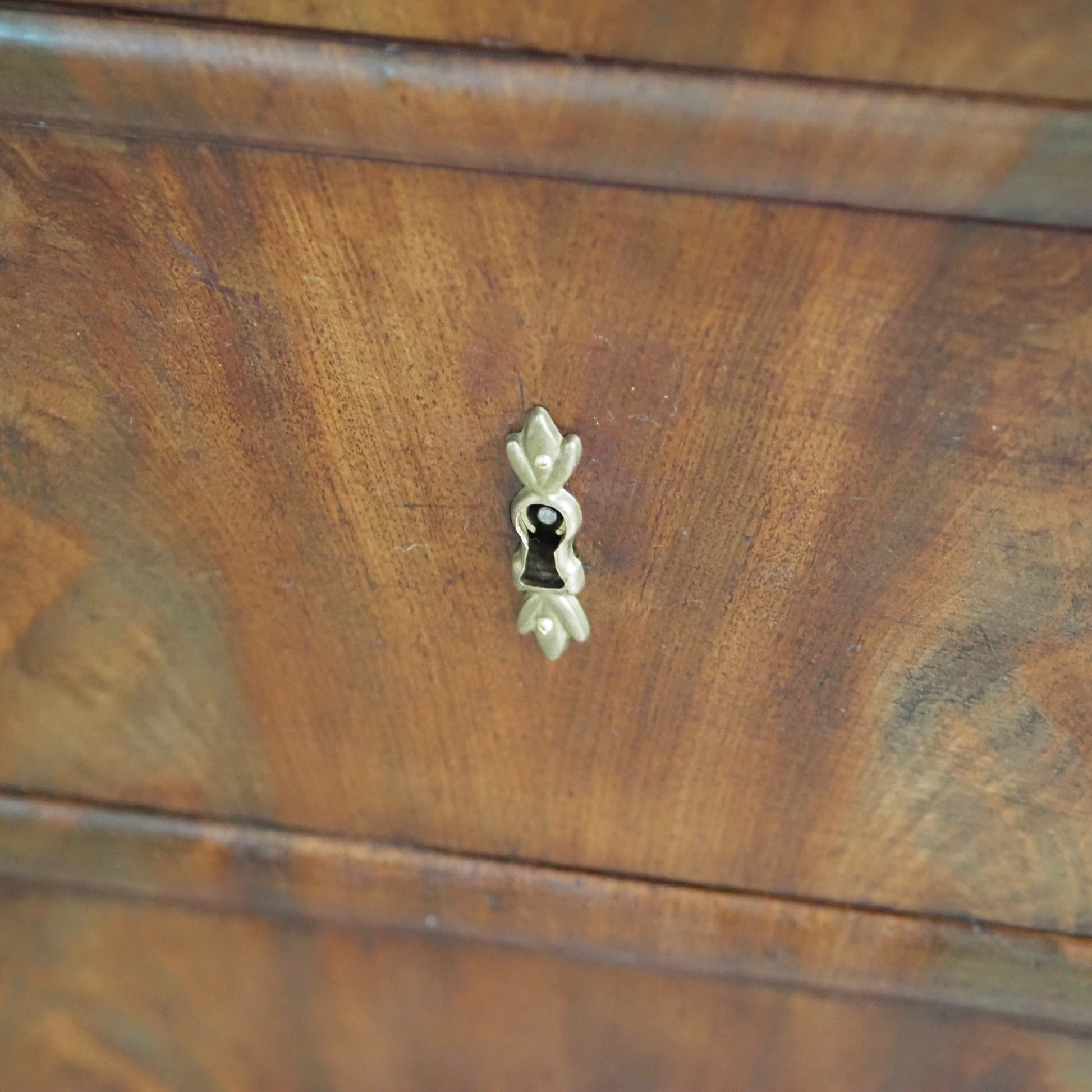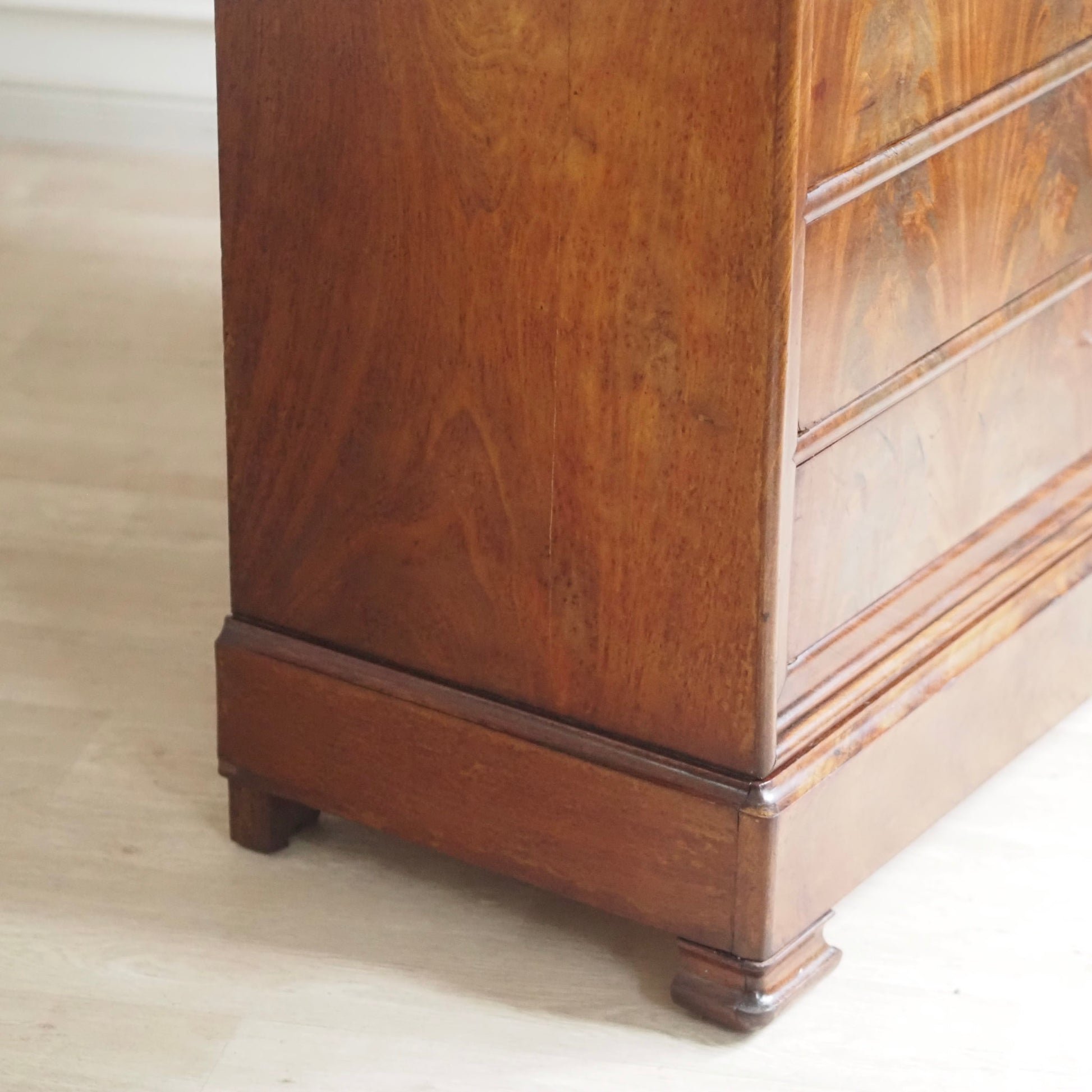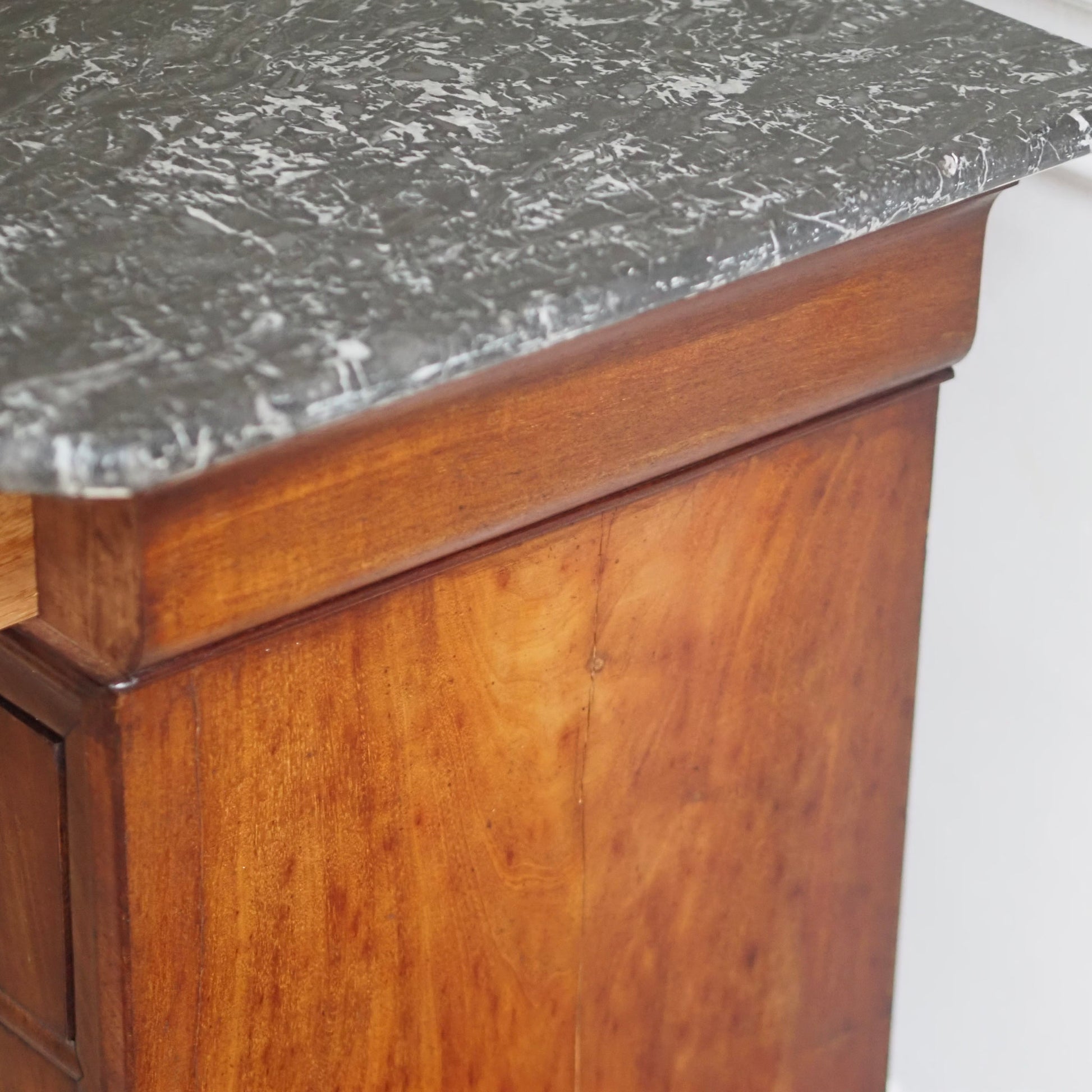 Diese prachtvolle antike Marmorkommode aus Frankreich beeindruckt mit ihrem edel geflammten Mahagoni-Wurzelfurnier, der harmonischen Maserung und einer massiven grau-weiß-schwarzen Marmorplatte. Die schlichte Eleganz des Louis-Philippe-Stils macht sie zu einem zeitlosen Möbelstück mit besonderem Charme. Drei große Schubladen, eine untere bündige geheime und eine obere schmalere sorgen für reichlich Stauraum.
