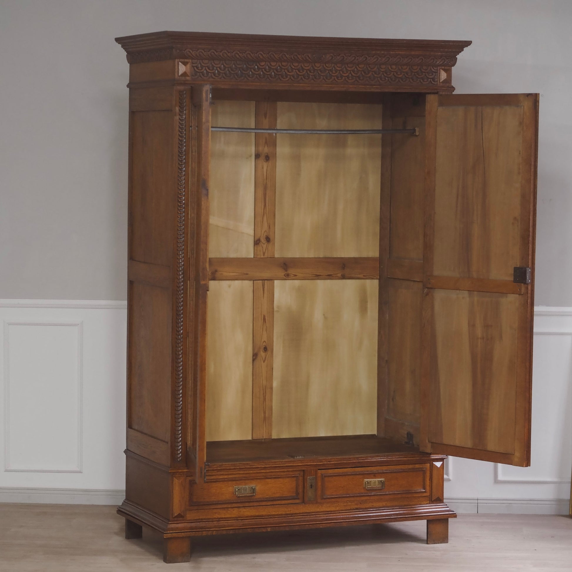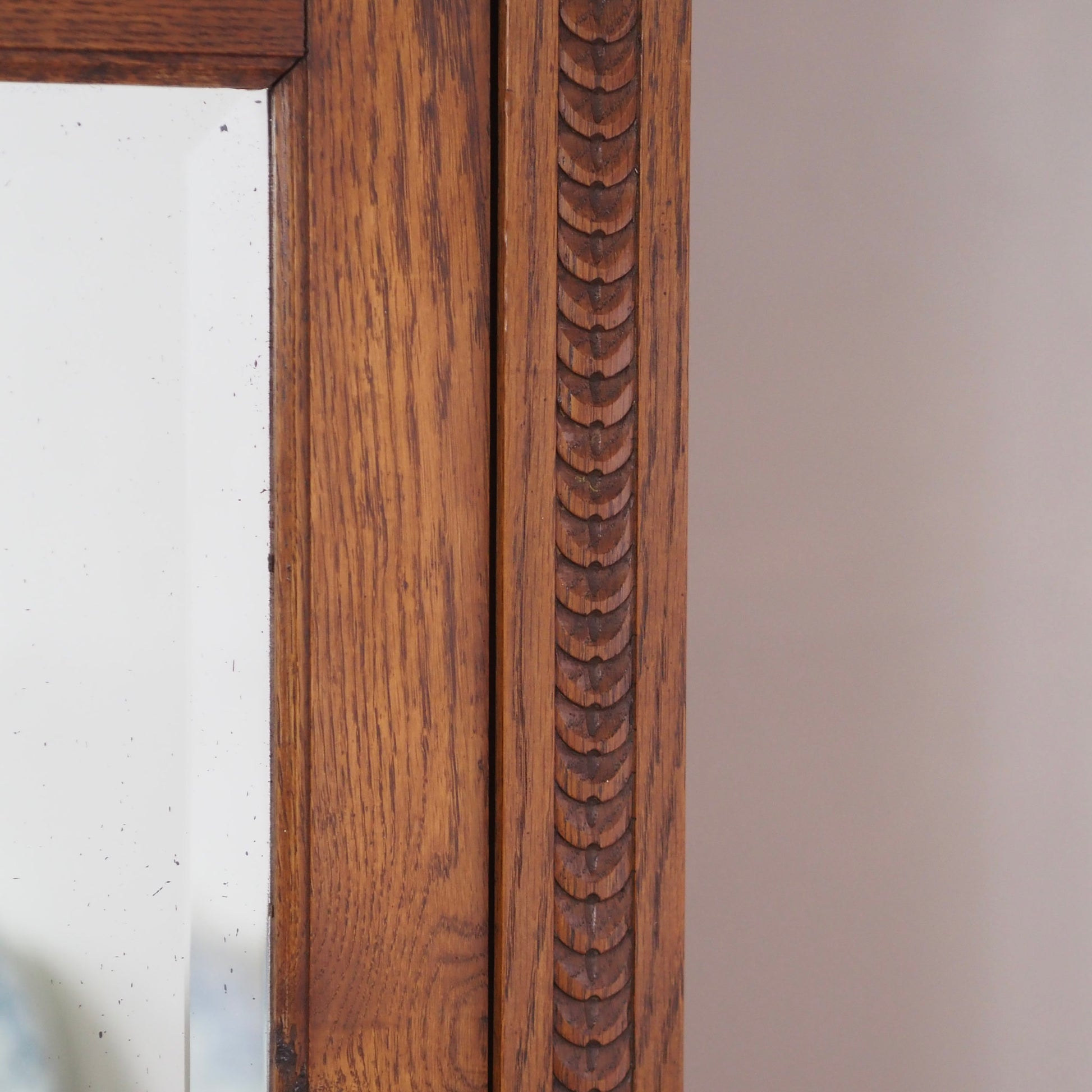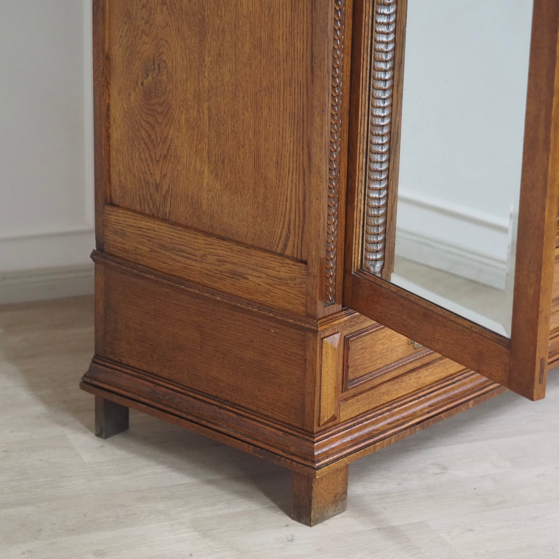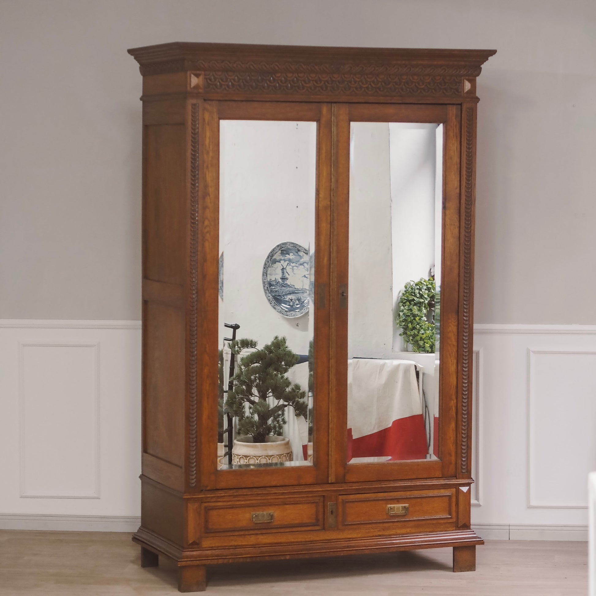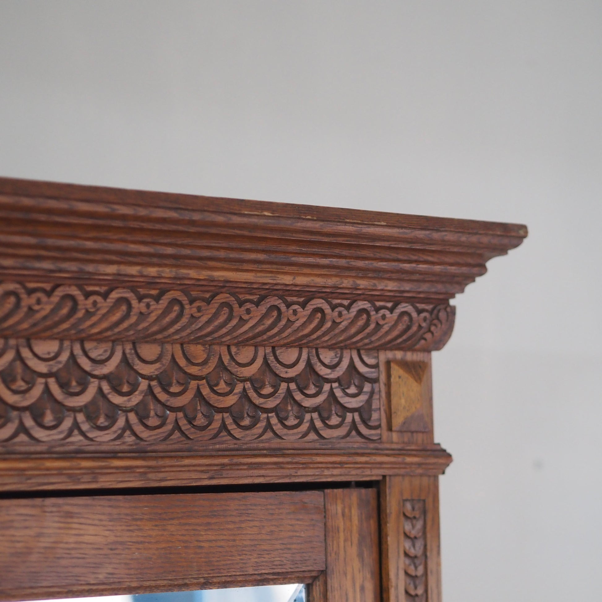 Beeindruckender Spiegelkleiderschrank aus der Zeit des Historismus um 1890. Dieses original erhaltene Möbelstück überzeugt durch handwerkliche Qualität, feinem Schnitzdekor und großflächigen Spiegeltüren mit Facettenschliff. Besonders auffällig ist der stark profilierte Gesimskranz mit seinem durchgehenden geschnitzten Ornamentband (Ranken, Bögen, florale Motive). Der Schrank ist aus Eichenholz gefertigt, steht auf rechteckigen Füßen und wirkt trotz seiner Größe elegant und ausgewogen. Innen bietet er durch seine Kleiderstange reichleich Platz für hängende Garderobe.