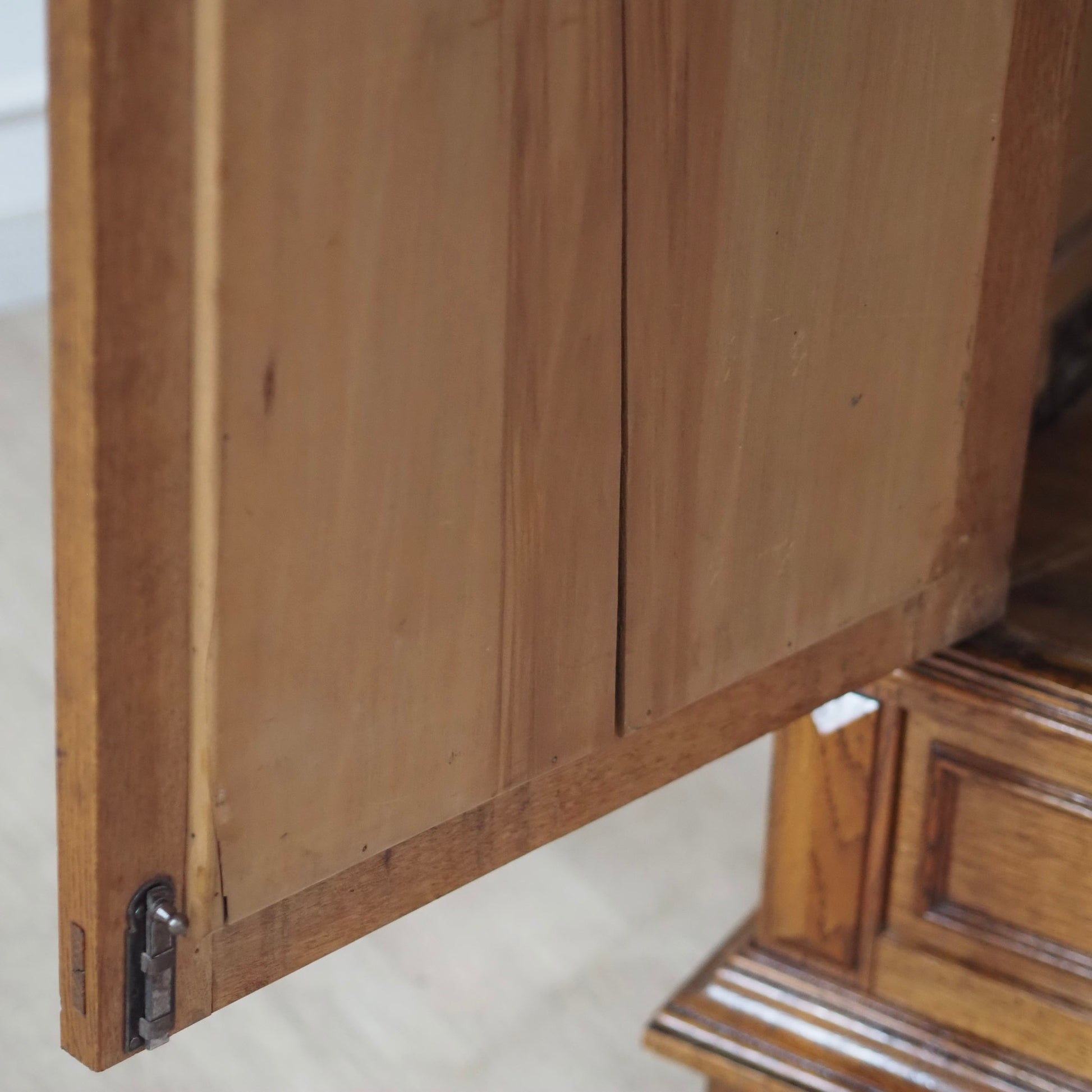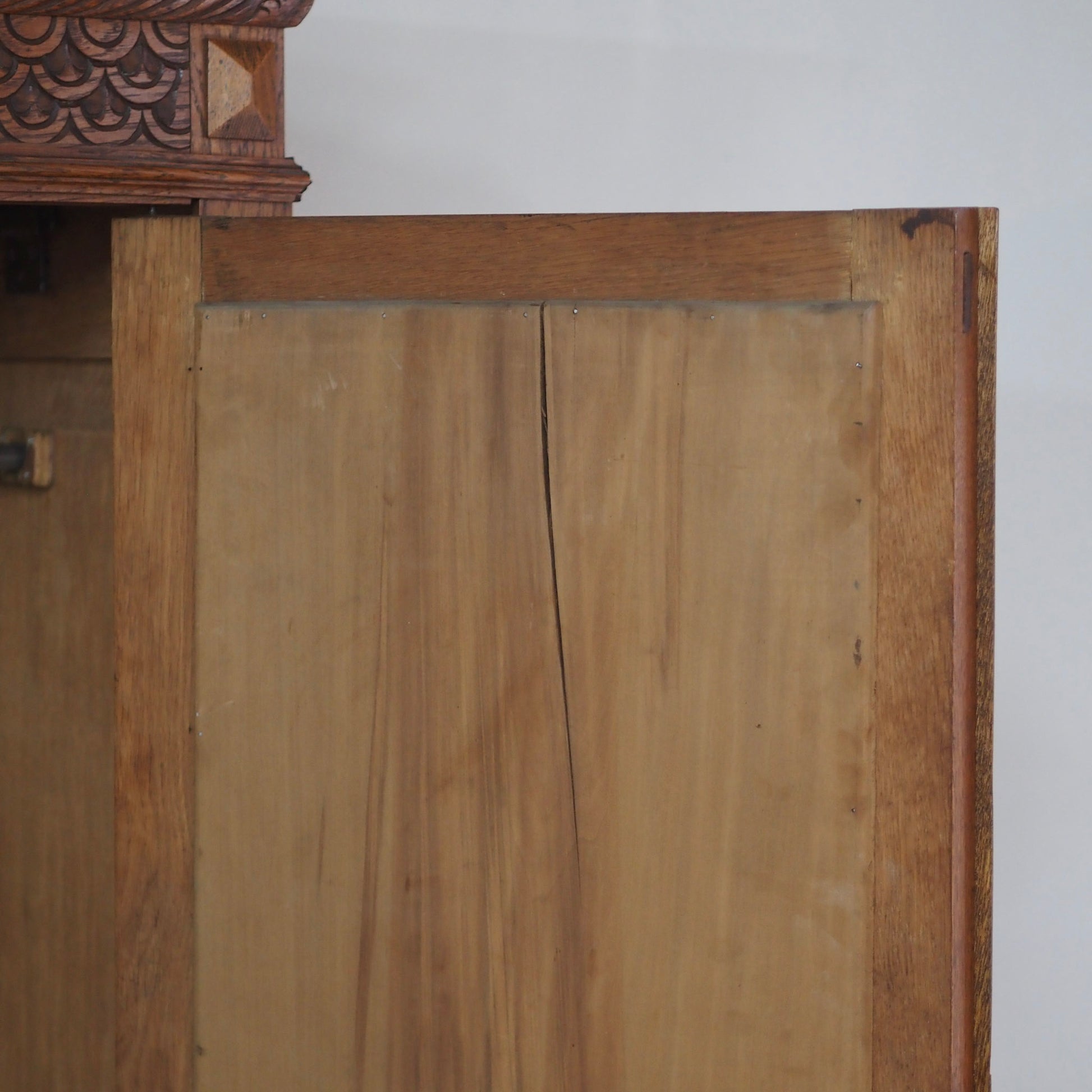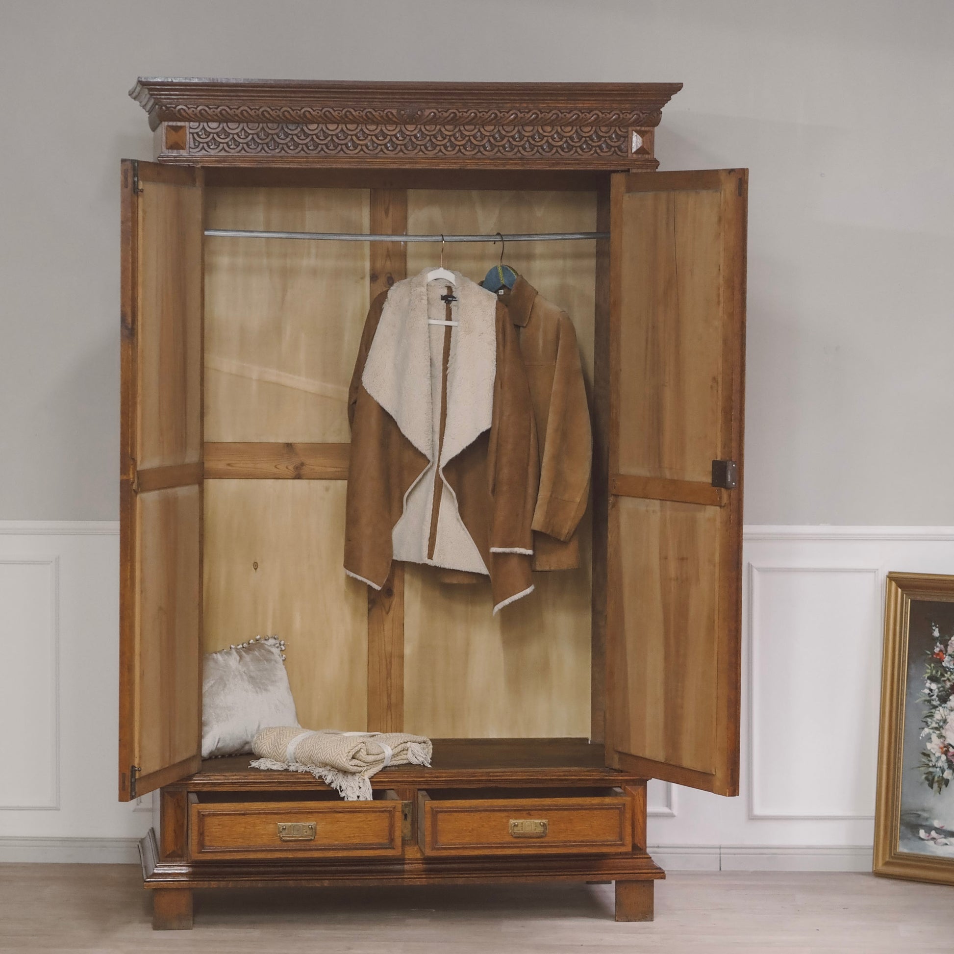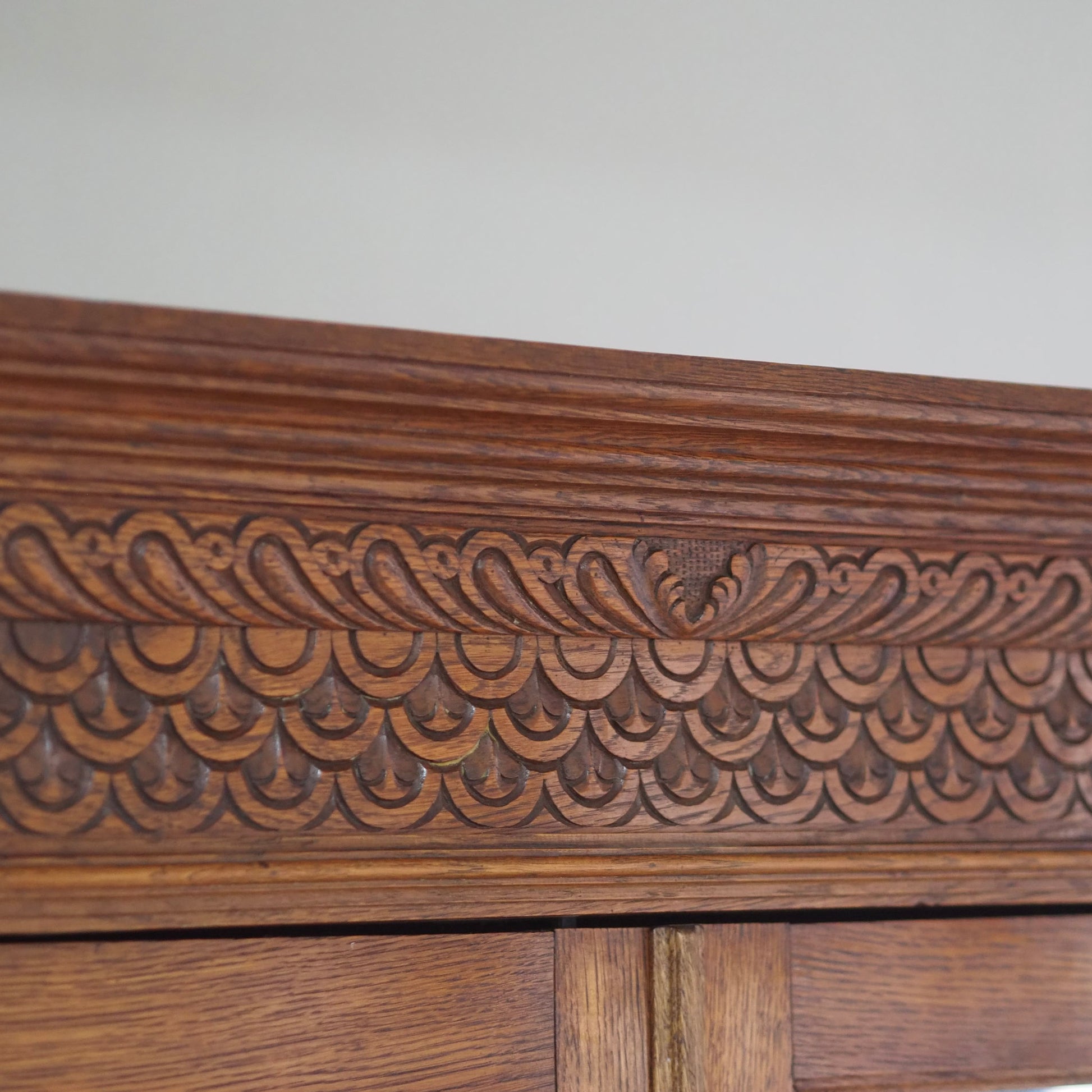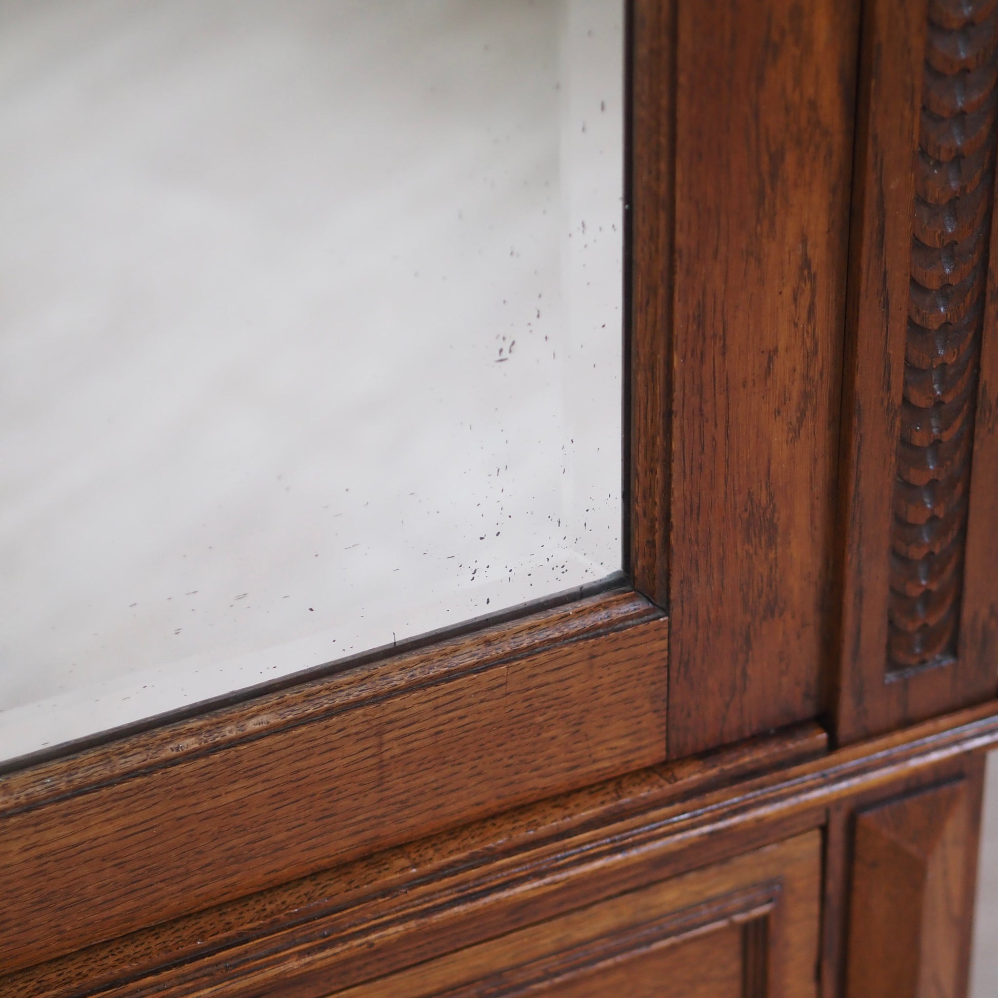 Beeindruckender Spiegelkleiderschrank aus der Zeit des Historismus um 1890. Dieses original erhaltene Möbelstück überzeugt durch handwerkliche Qualität, feinem Schnitzdekor und großflächigen Spiegeltüren mit Facettenschliff. Besonders auffällig ist der stark profilierte Gesimskranz mit seinem durchgehenden geschnitzten Ornamentband (Ranken, Bögen, florale Motive). Der Schrank ist aus Eichenholz gefertigt, steht auf rechteckigen Füßen und wirkt trotz seiner Größe elegant und ausgewogen. Innen bietet er durch seine Kleiderstange reichleich Platz für hängende Garderobe.