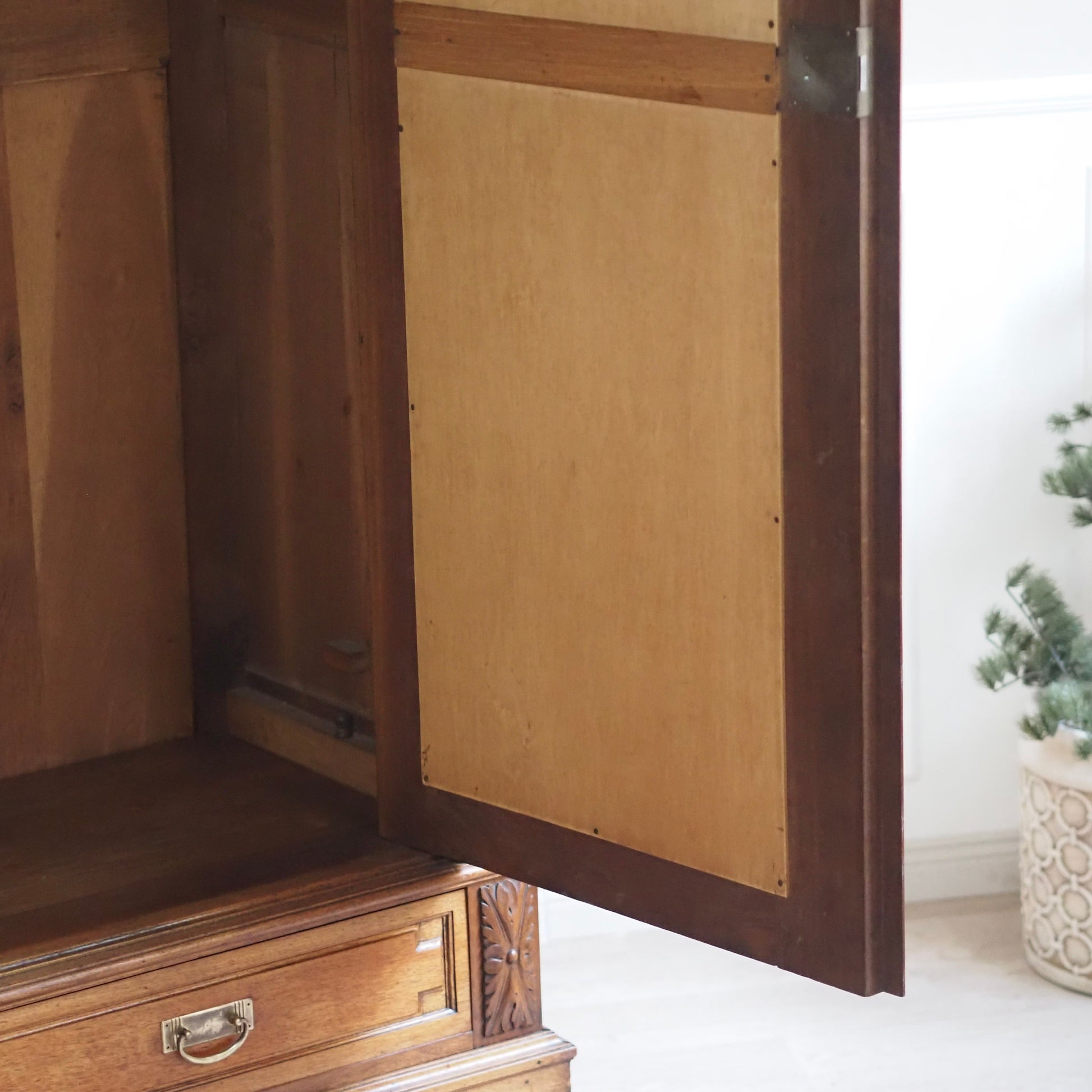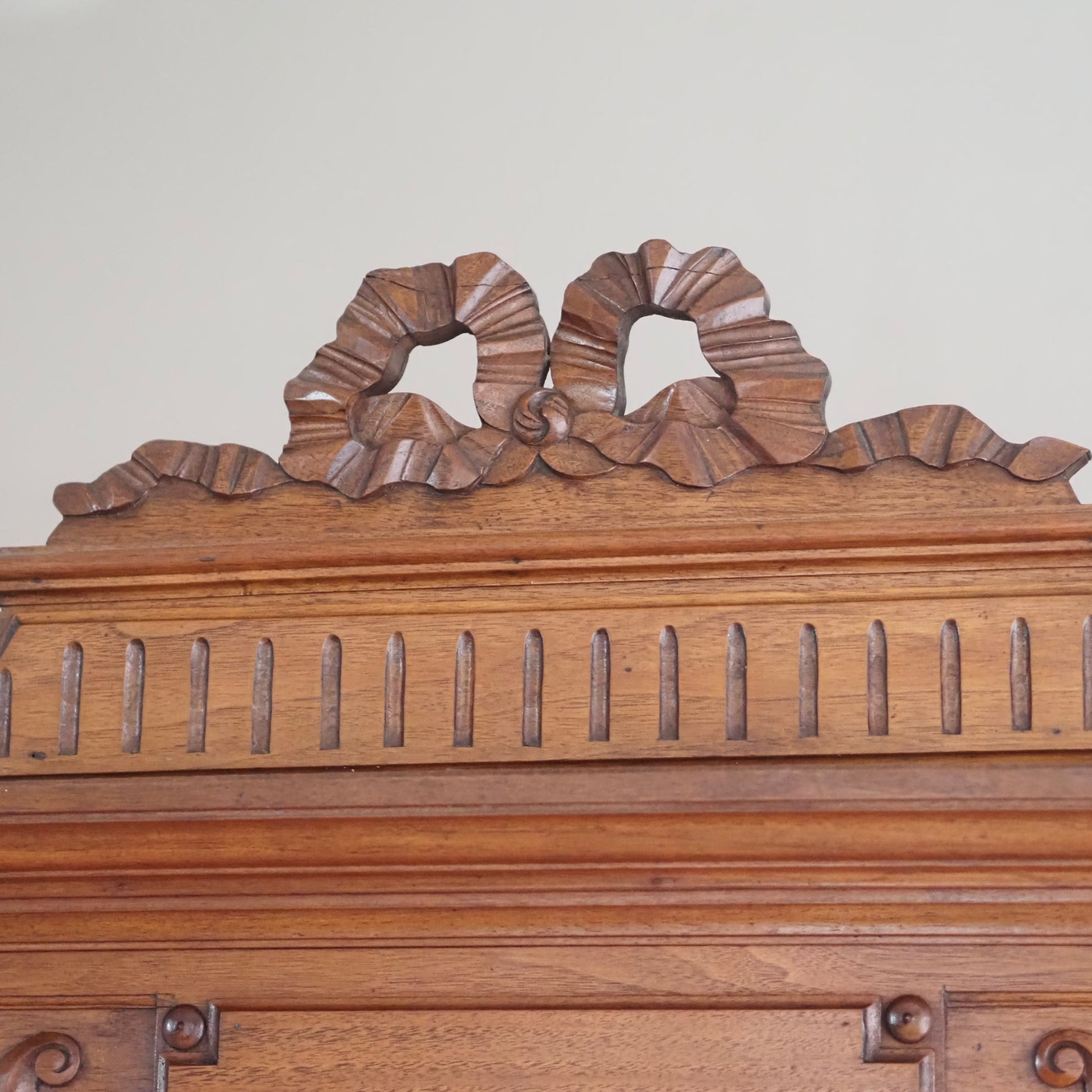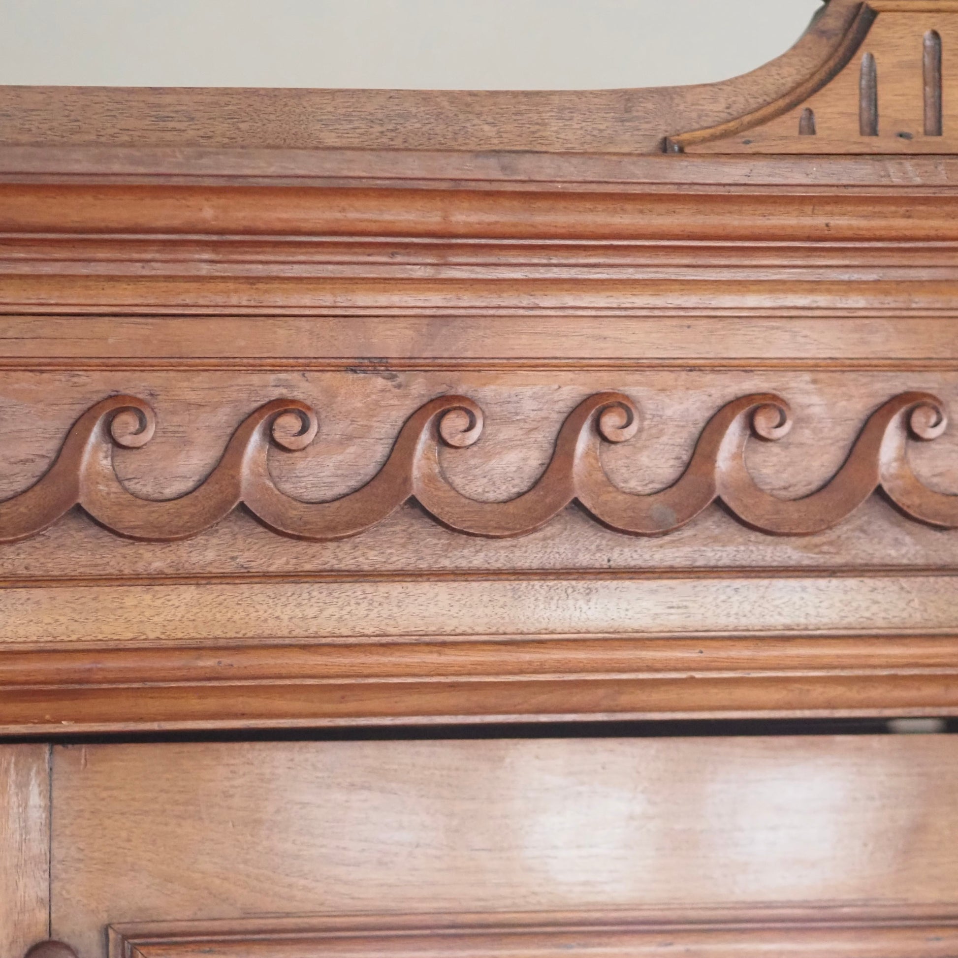 Dieser prachtvolle Kleiderschrank aus der Gründerzeit besticht durch seine feine Verarbeitung, harmonischen Proportionen und dekorative Wirkung. Die zweitürige Front ist mit großflächigen, originalen Facettenspiegeln versehen. Die Türen sind umlaufend profiliert und mit geschnitzten Eckdetails verziert. Besonders auffällig ist der stark profilierte Gesimskranz, der von einer geschnitzten Bekrönung mit durchbrochener Girlande abgeschlossen wird – ein typisches Stilelement der Hochgründerzeit. Der Schrank ist aus Nussbaumholz gefertigt, steht auf gedrechselten Füßen und wirkt trotz seiner Größe elegant und ausgewogen.