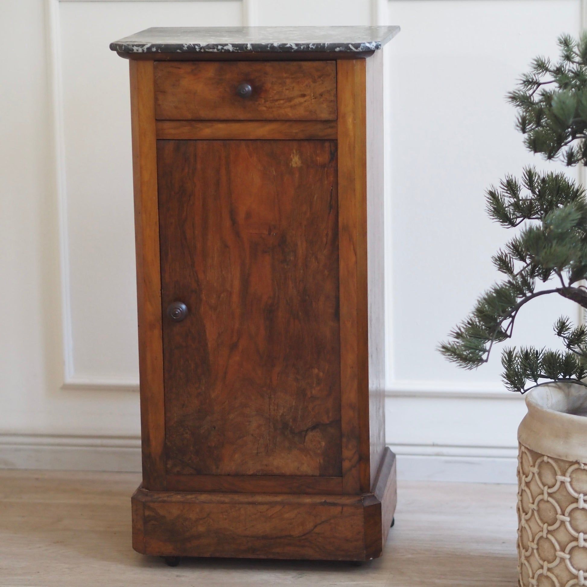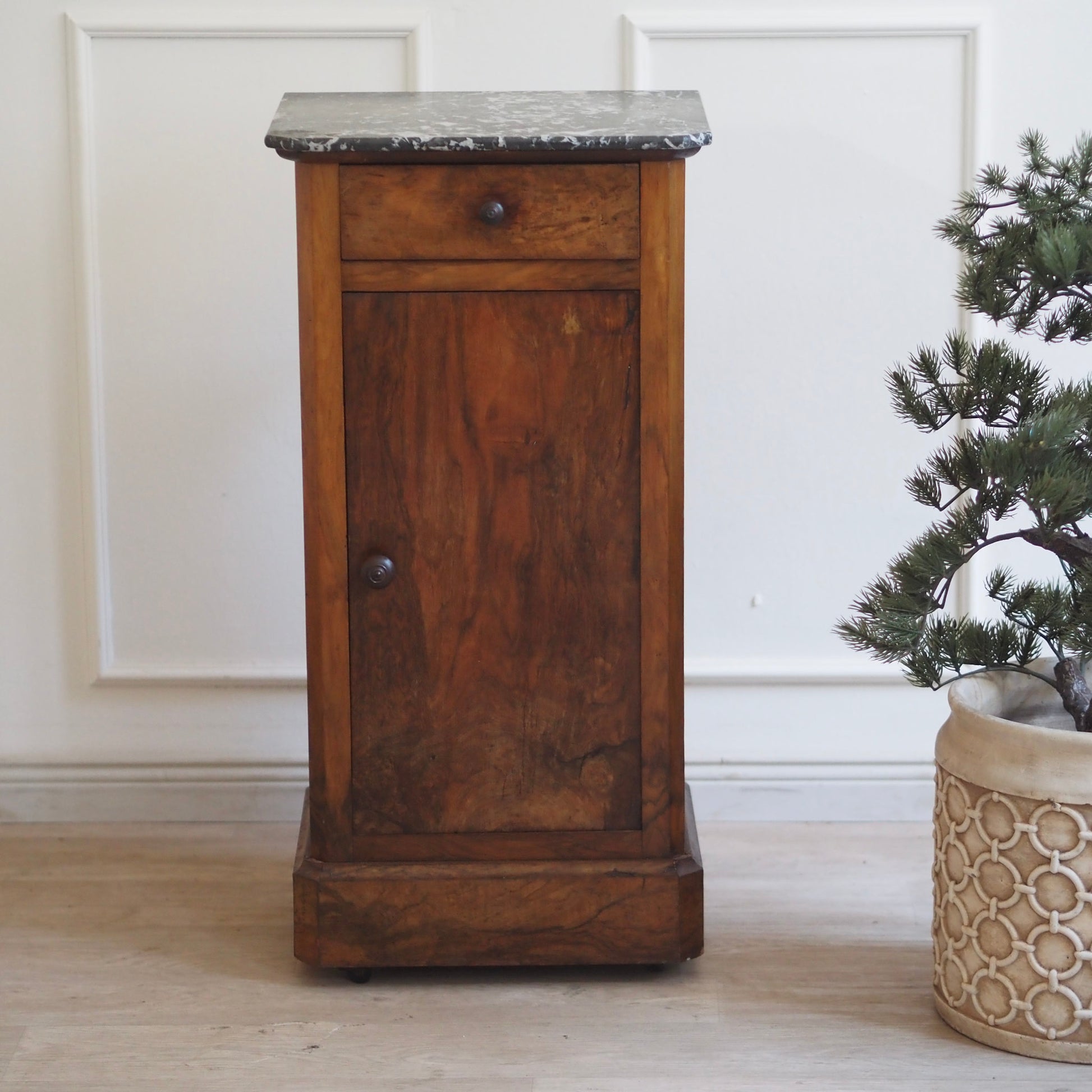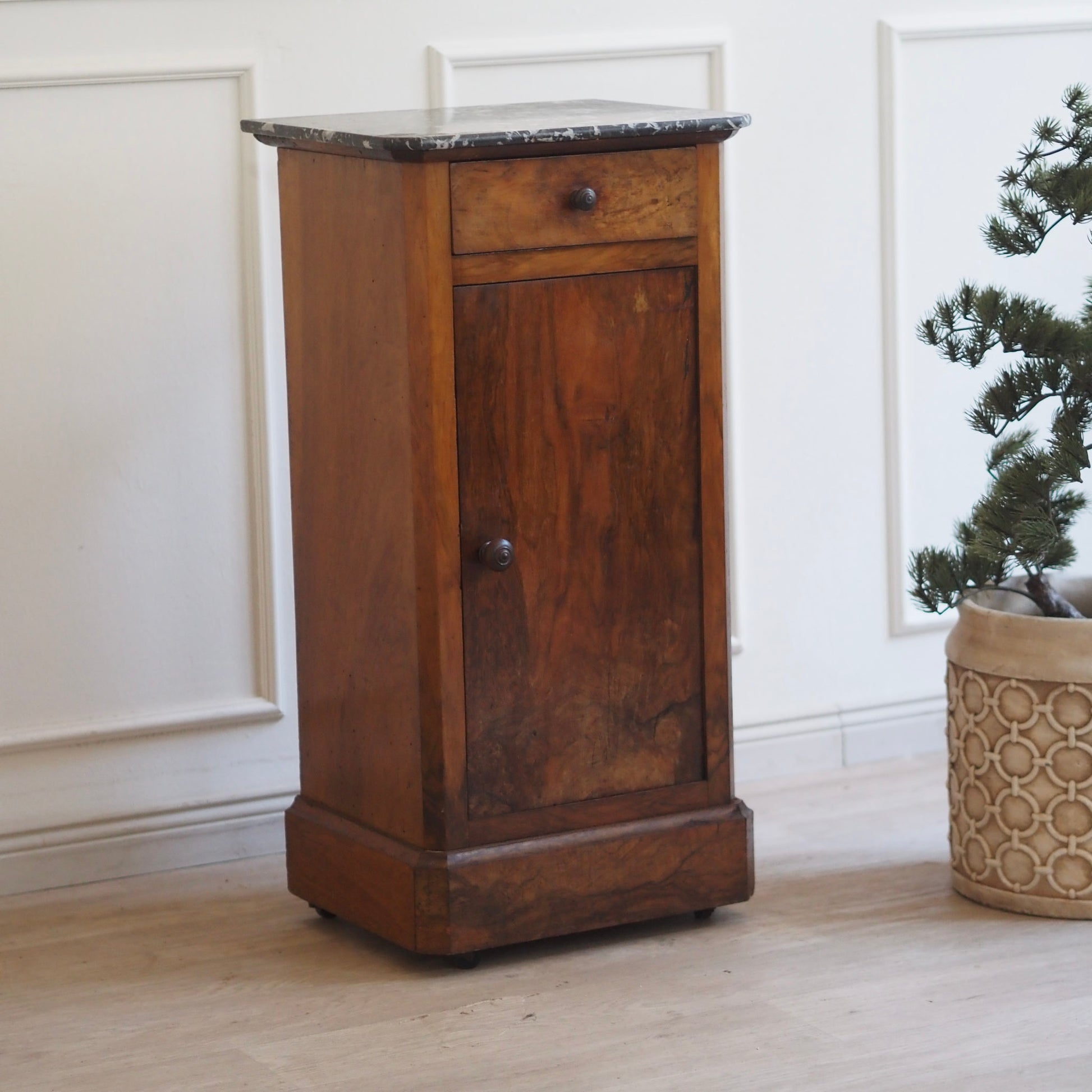 Schlanker Nachtschrank mit edler Materialverarbeitung stehend auf kleinen Rollen. Im französischen Louis-Philippe-Stil. Die fein gemaserte Holzfront sowie der dünne schwarze Marmor mit weißer Äderung sorgen für eine stilvolle Optik. Durch die große Tür entsteht im Inneren des Nachttisches reichlich Stauraum inkl. Unterteilung durch einen Einlegeboden. Die reduzierte Formensprache steht im Kontrast zur ausdrucksstarken Holzstruktur und macht das Möbel vielseitig einsetzbar. Heute lässt sich das schöne Stück hervorragend als stilvolles Nachtschränkchen, kleines Flurmöbel oder eleganten Akzenttisch einsetzen.