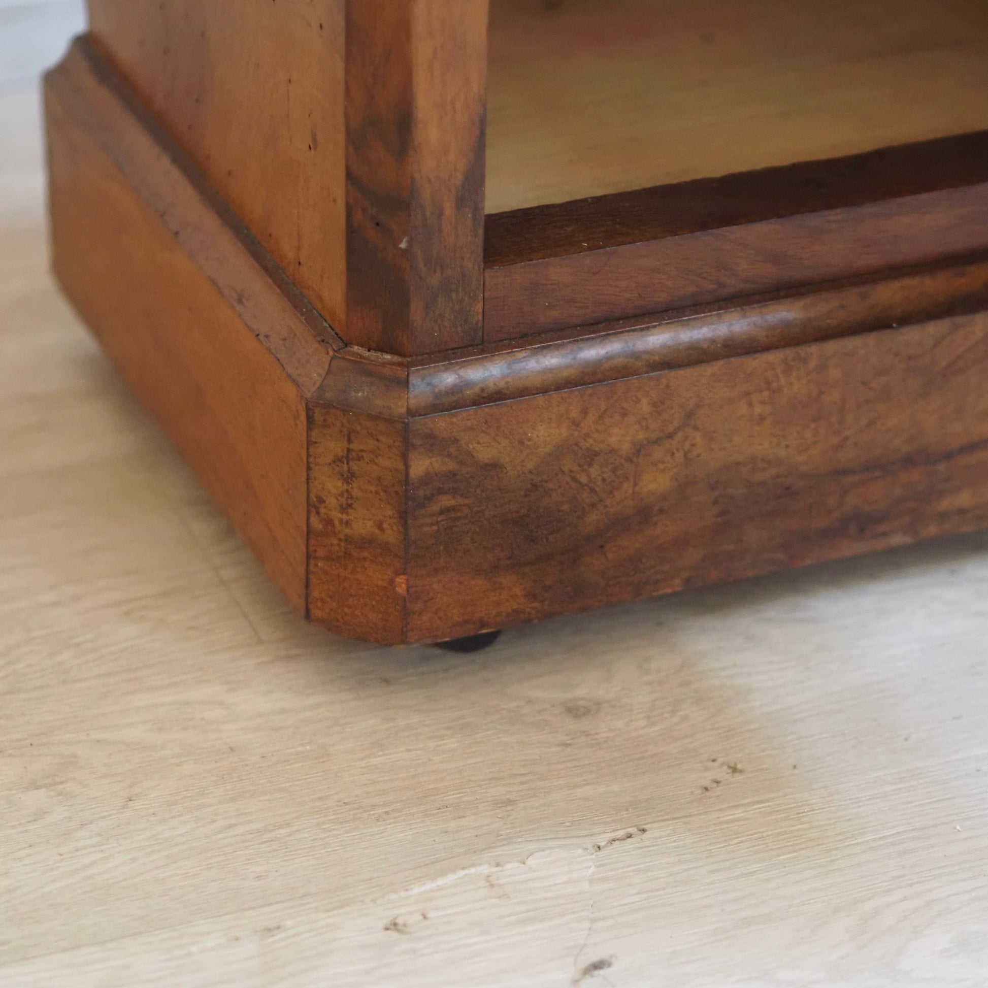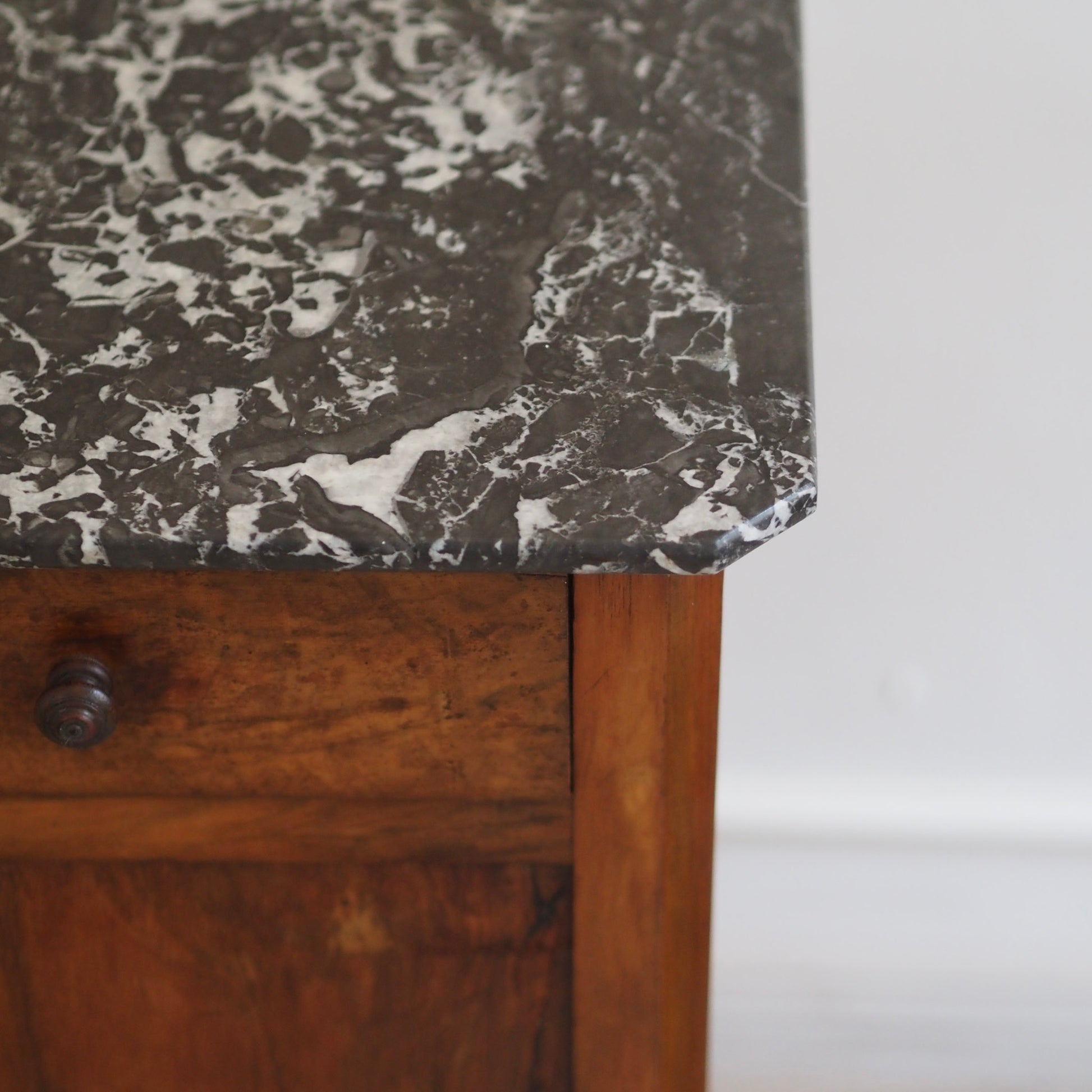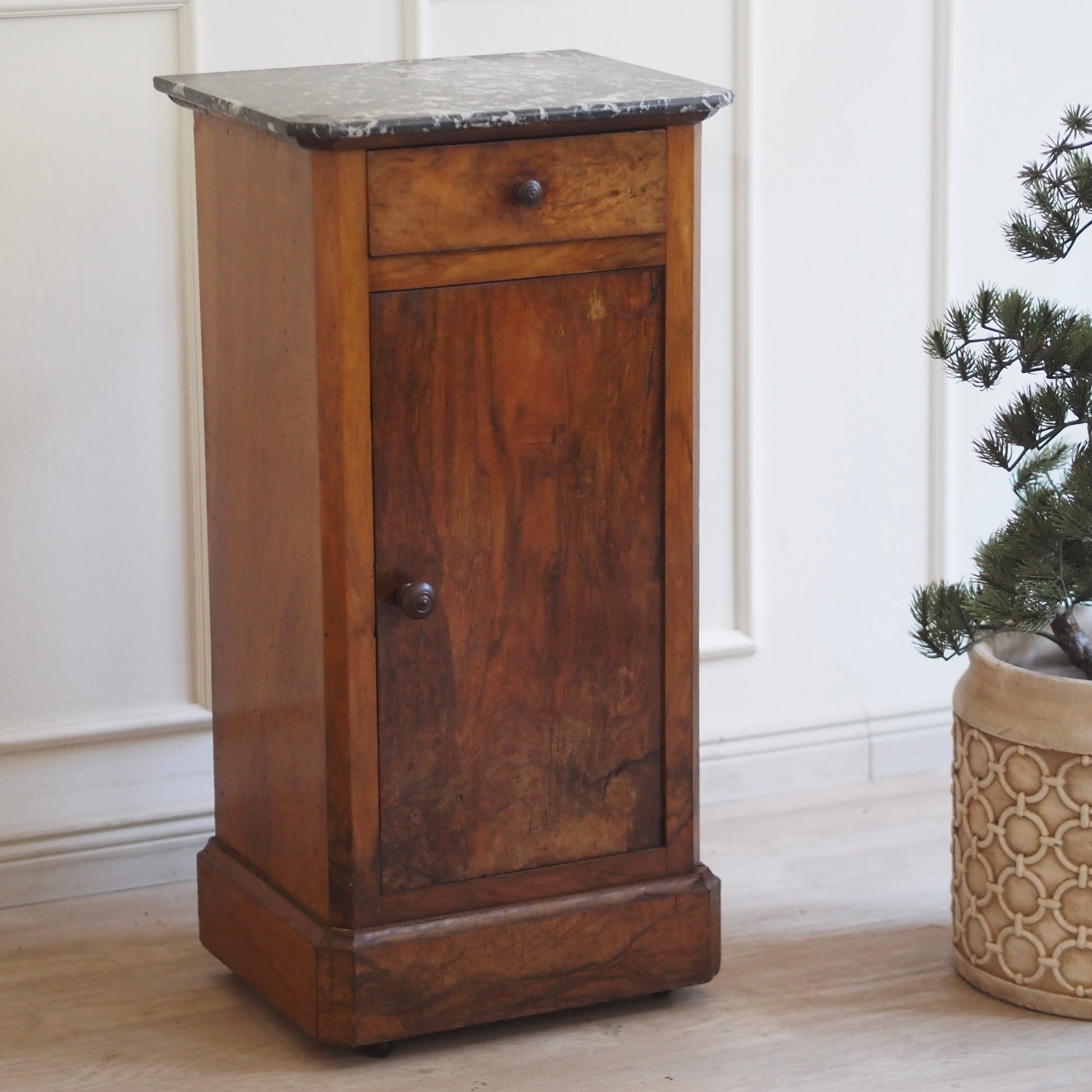 Schlanker Nachtschrank mit edler Materialverarbeitung stehend auf kleinen Rollen. Im französischen Louis-Philippe-Stil. Die fein gemaserte Holzfront sowie der dünne schwarze Marmor mit weißer Äderung sorgen für eine stilvolle Optik. Durch die große Tür entsteht im Inneren des Nachttisches reichlich Stauraum inkl. Unterteilung durch einen Einlegeboden. Die reduzierte Formensprache steht im Kontrast zur ausdrucksstarken Holzstruktur und macht das Möbel vielseitig einsetzbar. Heute lässt sich das schöne Stück hervorragend als stilvolles Nachtschränkchen, kleines Flurmöbel oder eleganten Akzenttisch einsetzen.
