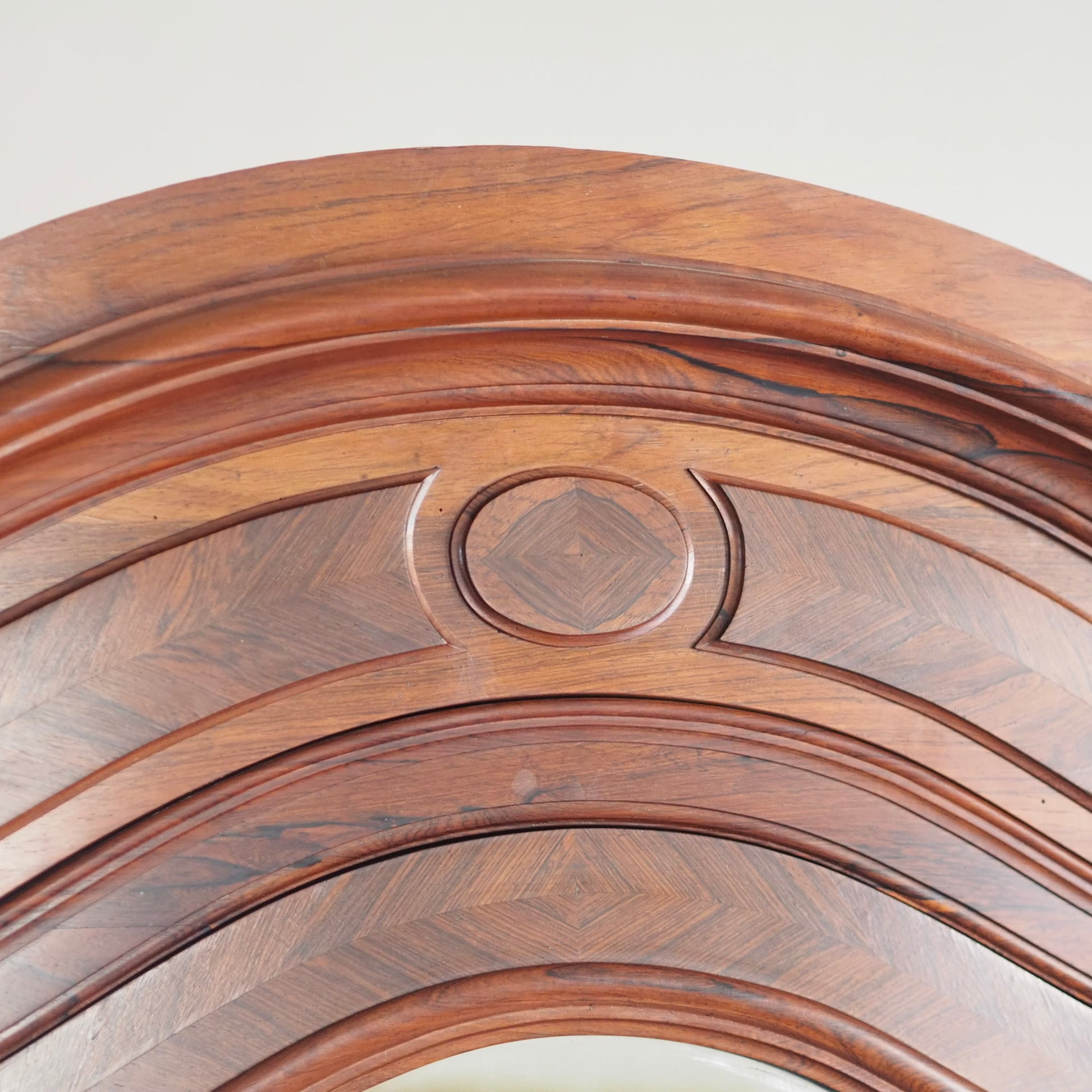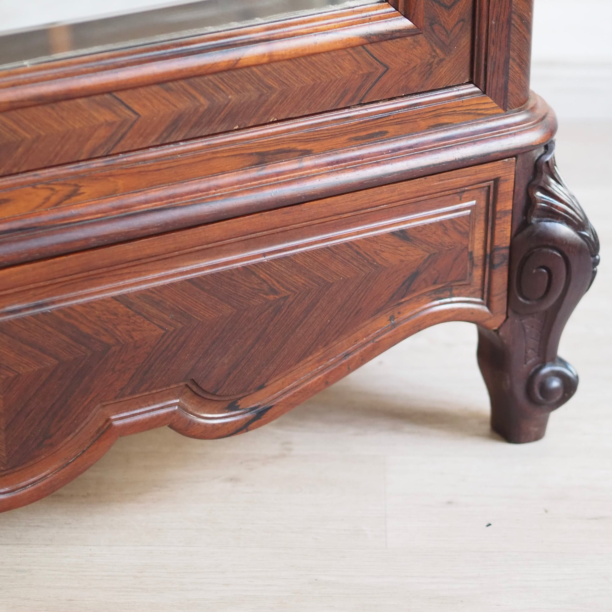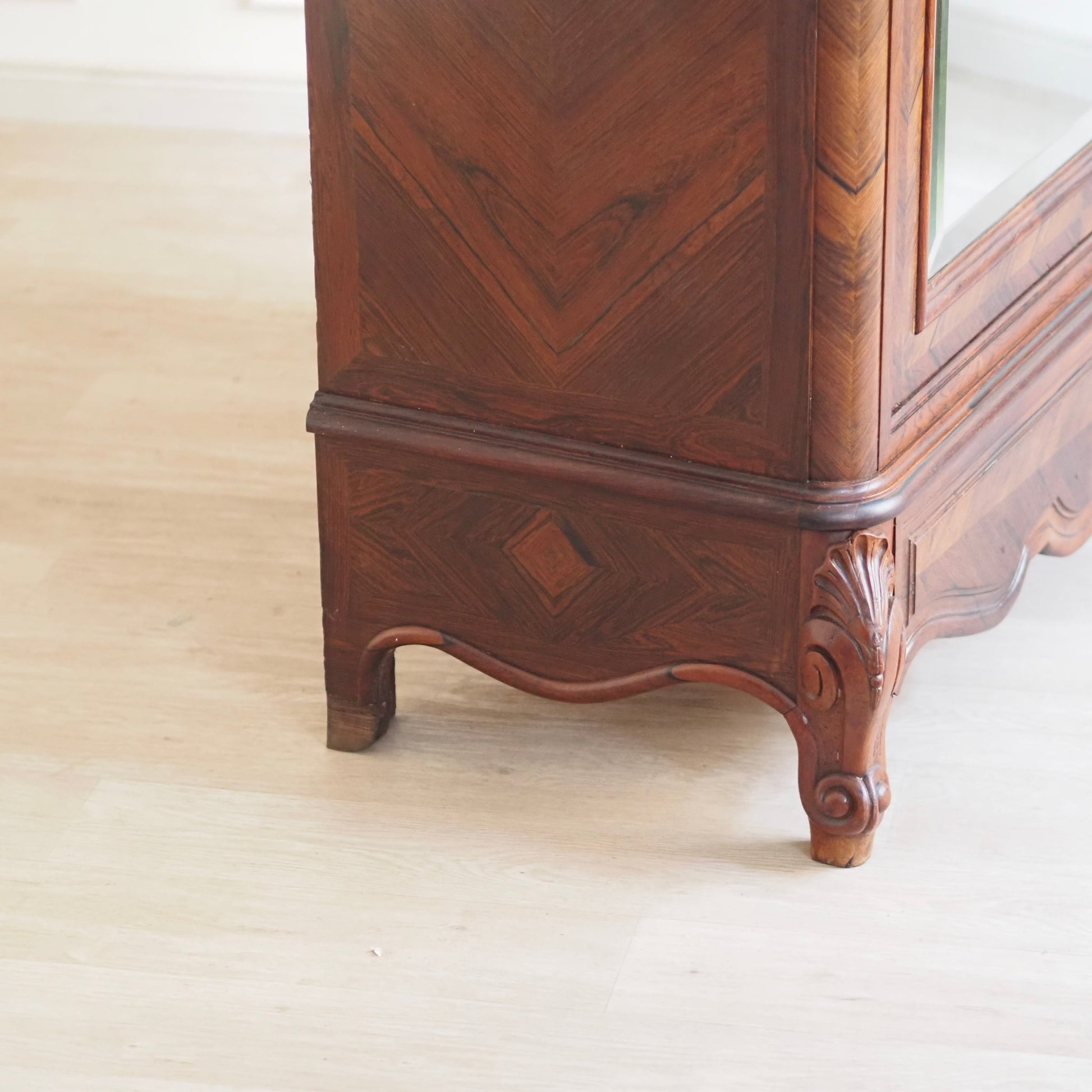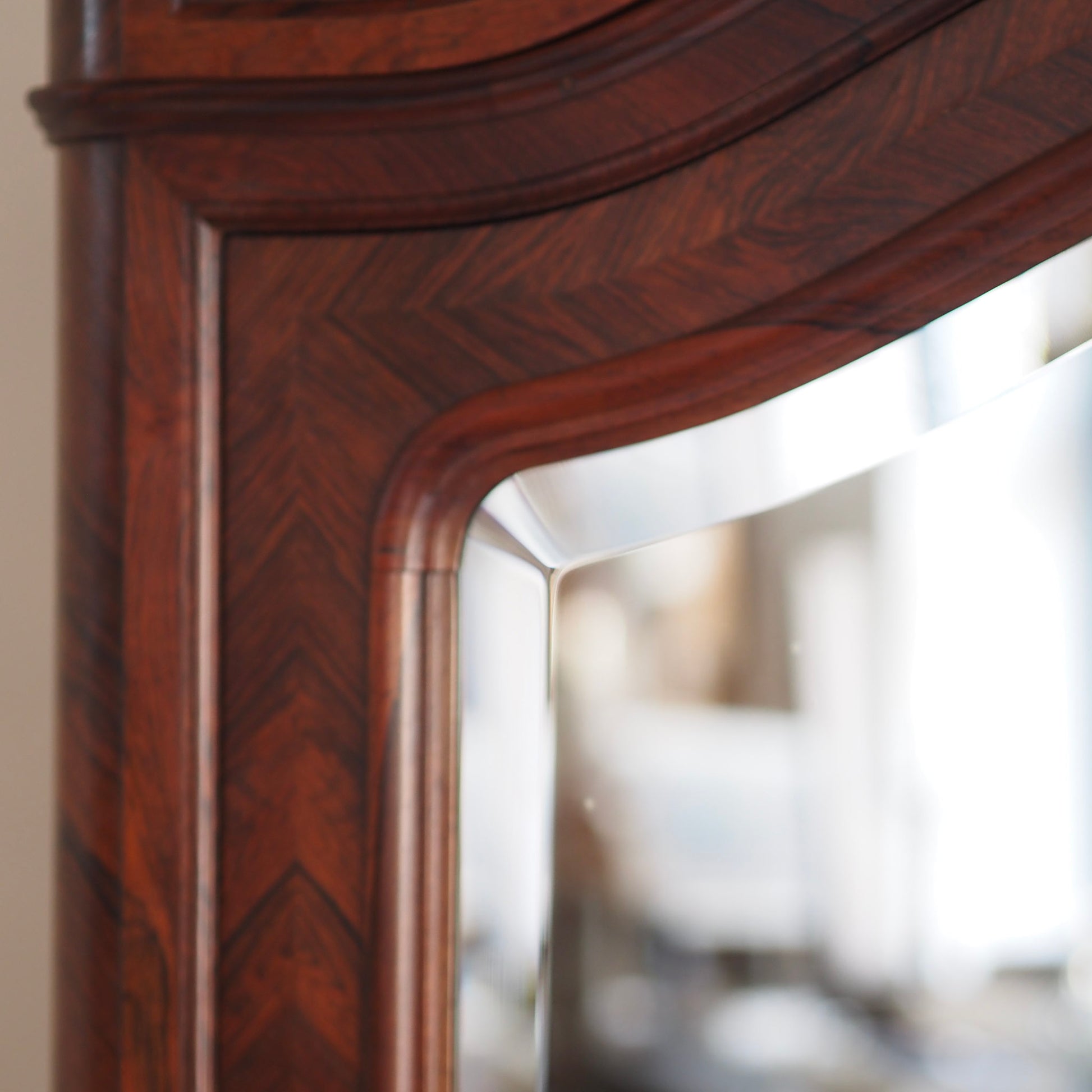 Dieser außergewöhnliche französische Spiegelschrank beeindruckt durch seine aufwendige Verarbeitung, das elegante Palisander-Furnierbild in Fischgrät-Optik und die harmonisch geschwungenen Formen des Kranzprofils sowie der Sockelzone. Der Schrank ist ca. 150 Jahre alt, im französischen Louis-Philippe Stil gebaut und in seinem Aufbau, dem Innenleben und der Qualität der Verarbeitung ein absolutes Highlight. Durch die großflächige Spiegelverglasung der Tür, kann der Schrank auch in kleinere Zimmer oder Flure gestellt werden. Er vergrößert optisch die Raumwirkung und verleiht dem Möbel zusätzliche Tiefe.