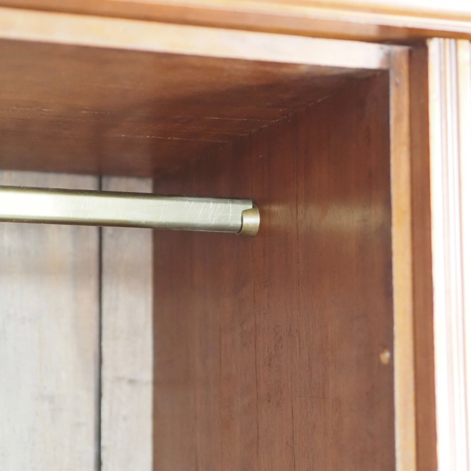 Die linke große Tür des Schrankes ist mit einem über die gesamte Länge reichenden Spiegel ausgestattet – ein typisches Stilelement der Zeit, das Funktion und dekorativen Anspruch vereint. Hinter der Spiegeltür befindet sich eine Kleiderstange, während sich hinter den zwei rechten Türen zwei kleine Innenfächer verbergen. Darunter sind insgesamt sechs nach außen geführte Schubladen angeordnet. Der Schrank bietet damit eine durchdachte Aufteilung für Kleidung, Wäsche, Accessoires oder andere Dinge des Alltags.