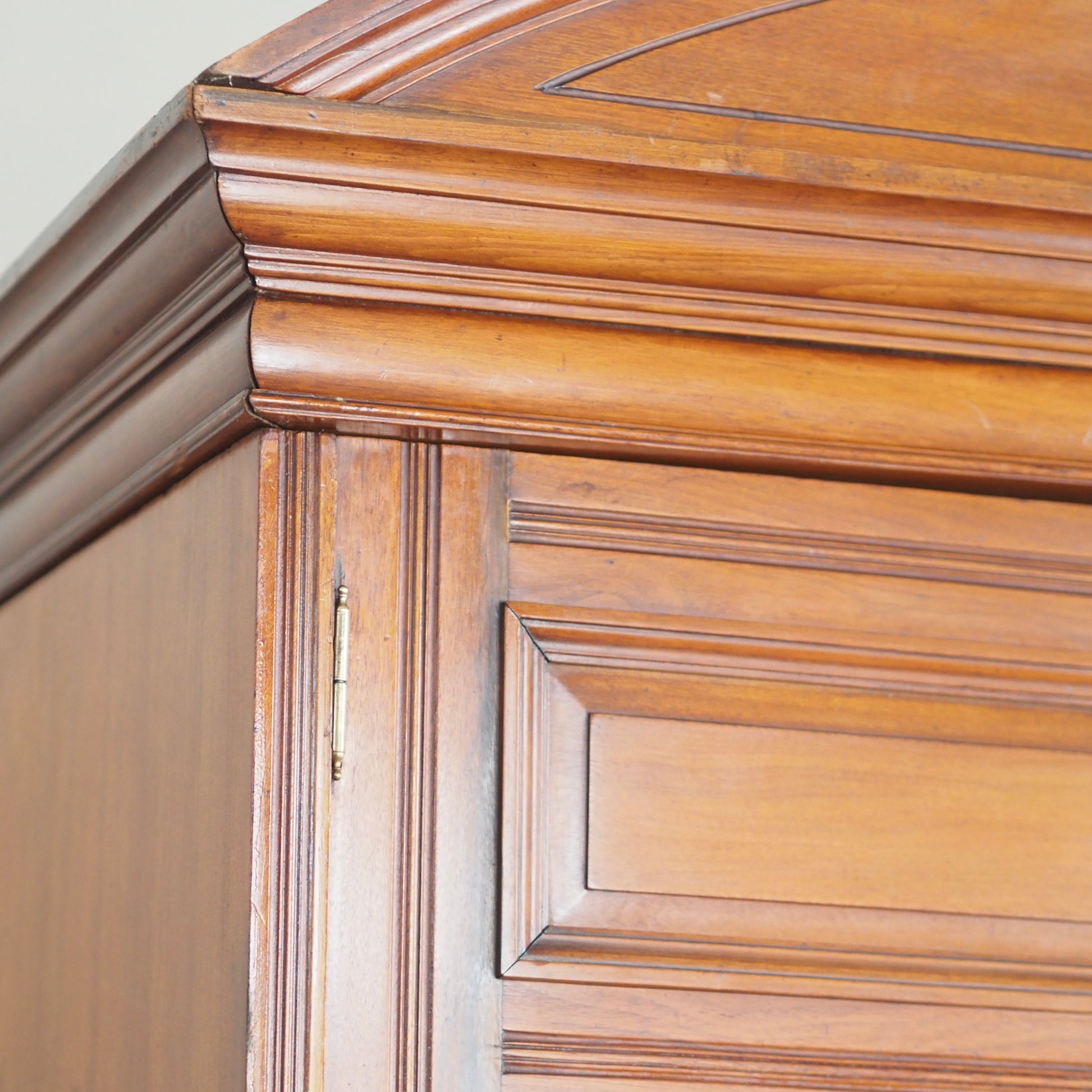 Ein besonderes Highlight ist der geschwungene Giebelaufsatz mit eingezogener Zierfräsung – ein typisches Stilelement der Gründerzeit, das den Schrank optisch krönt und seine architektonische Wirkung unterstreicht.
