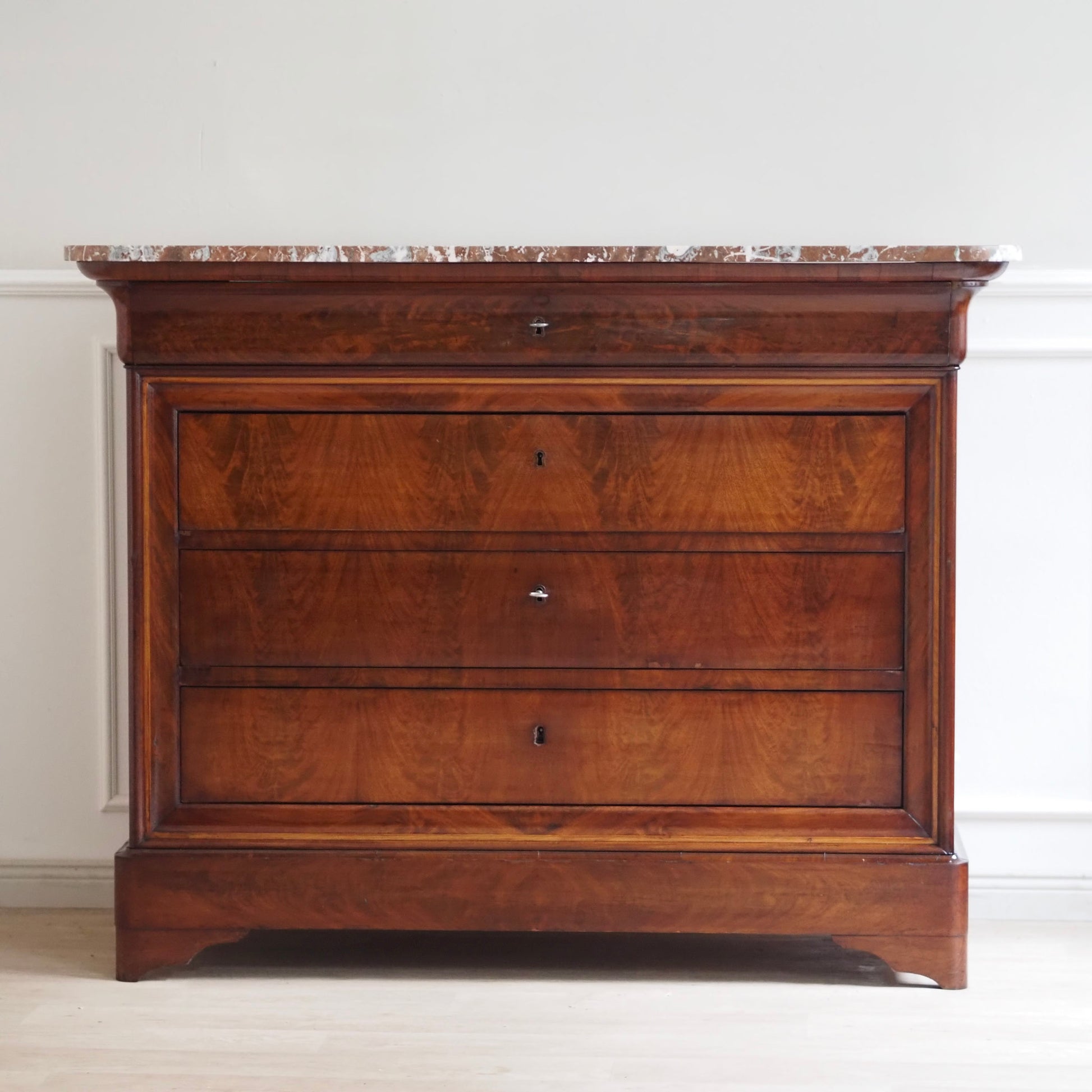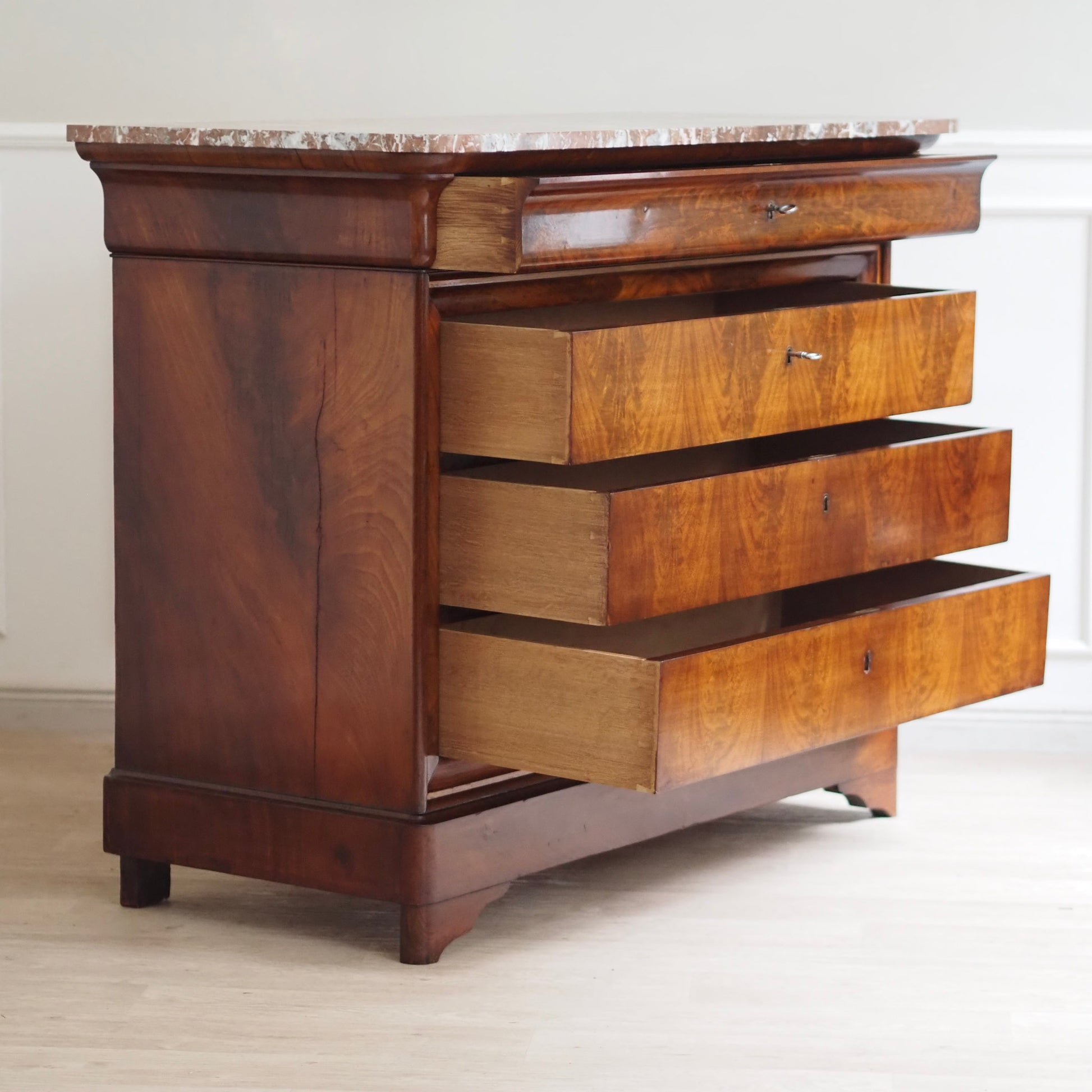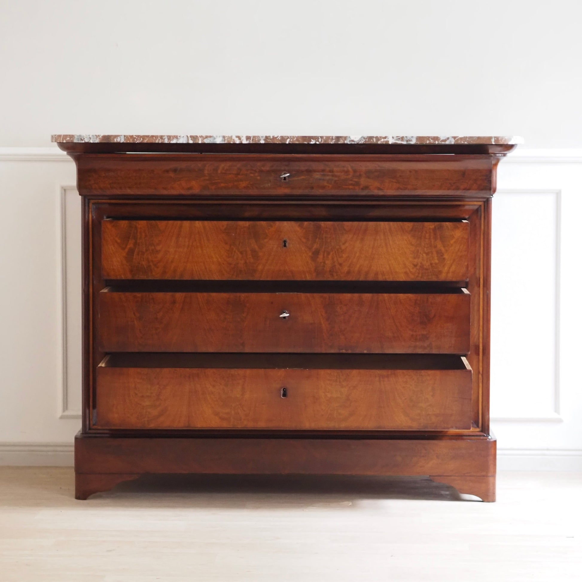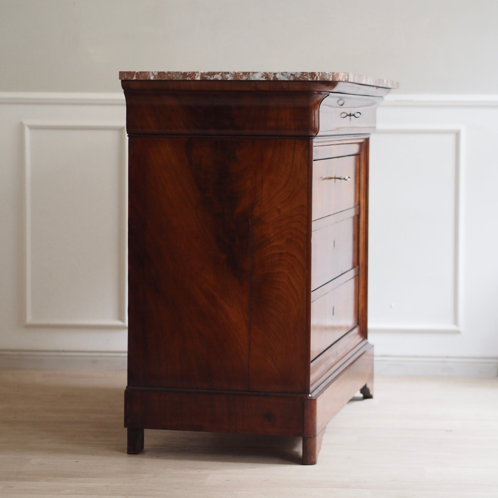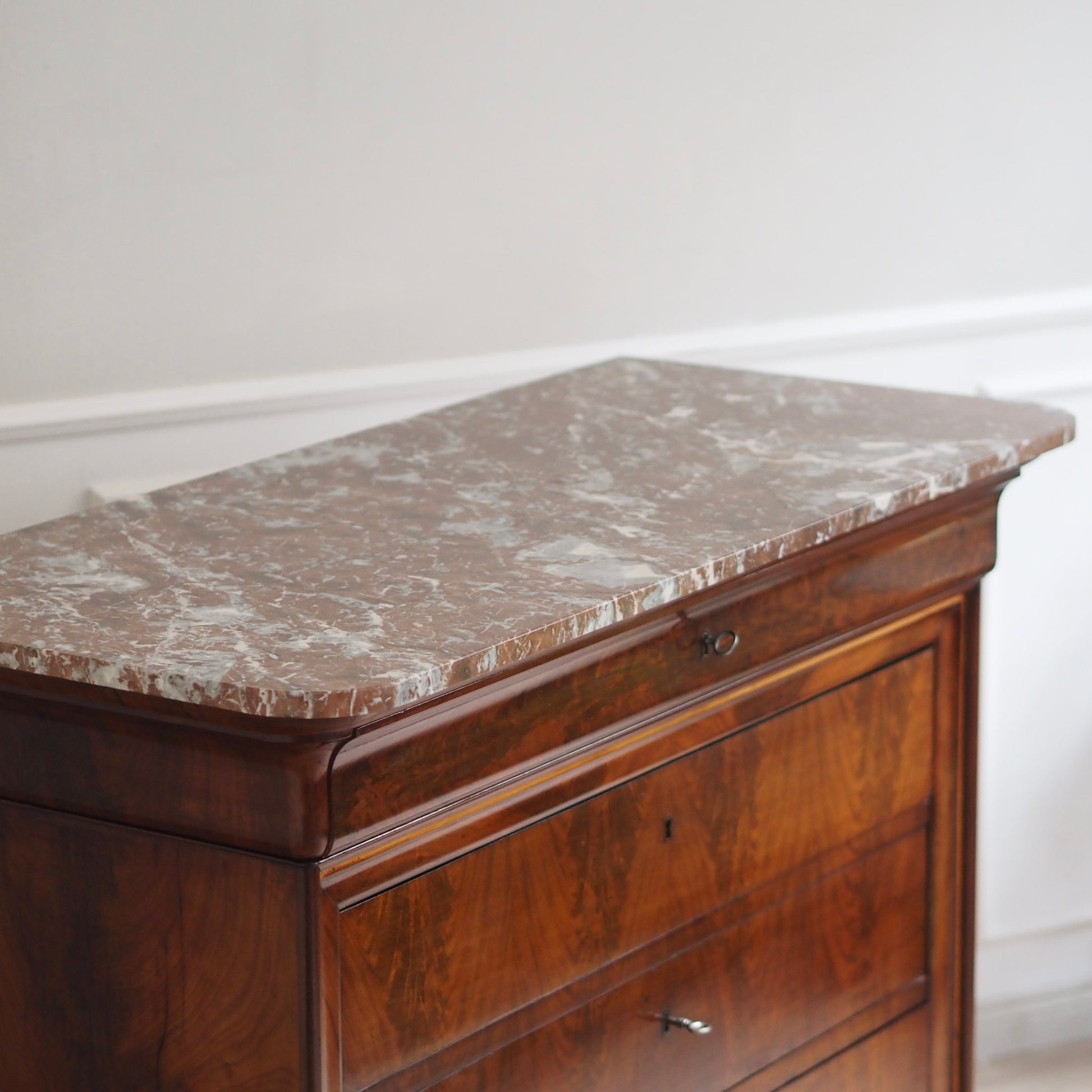 Diese prachtvolle antike Marmorkommode beeindruckt mit ihrem edlen Wurzelfurnier, der harmonischen Maserung und einer massiven rötlich-weiß geäderten Marmorplatte. Die schlichte Eleganz des Louis-Philippe Stils macht sie zu einem zeitlosen Möbelstück mit besonderem Charme. Drei große Schubladen und eine obere schmalere sorgen für reichlich Stauraum. Ein repräsentatives Einzelstück – ideal für Wohn- oder Schlafräume, Flure oder stilvolle Boutiquen.