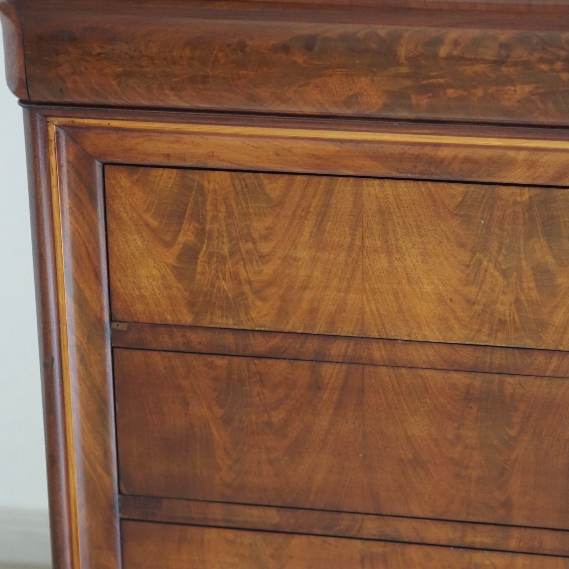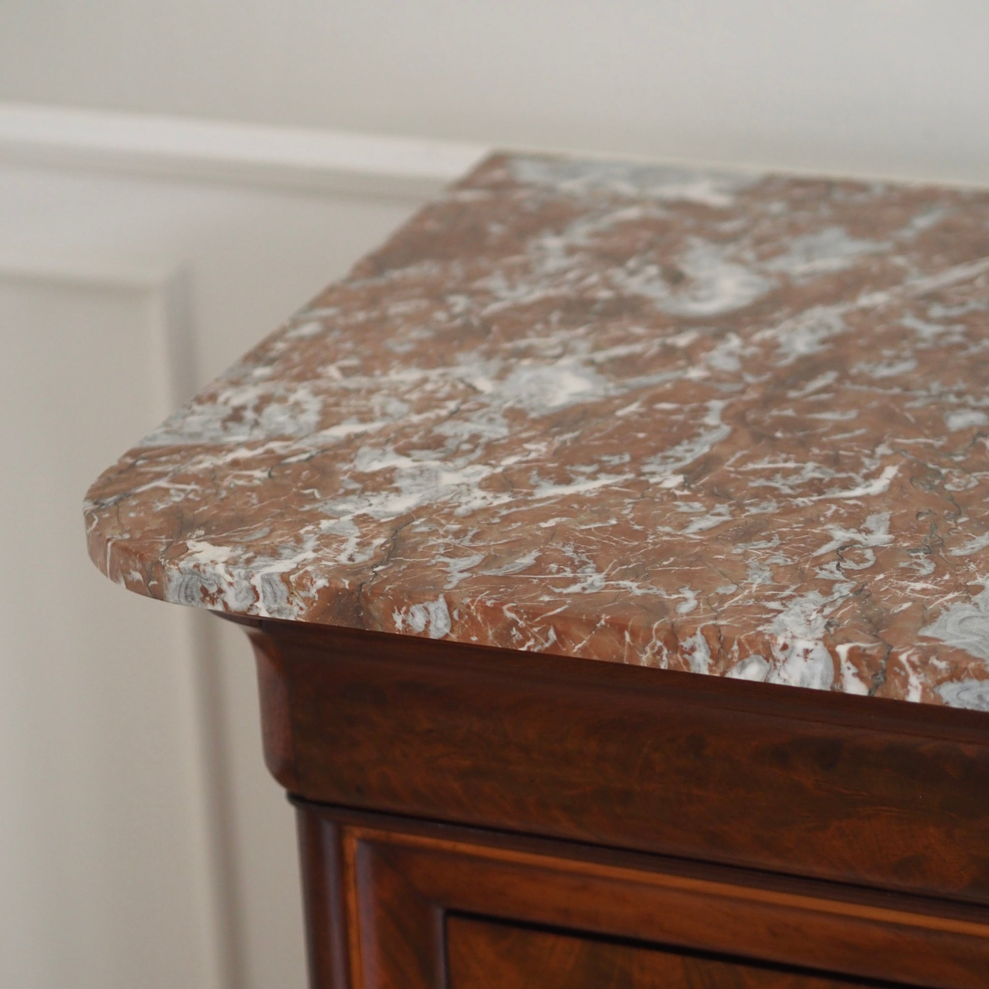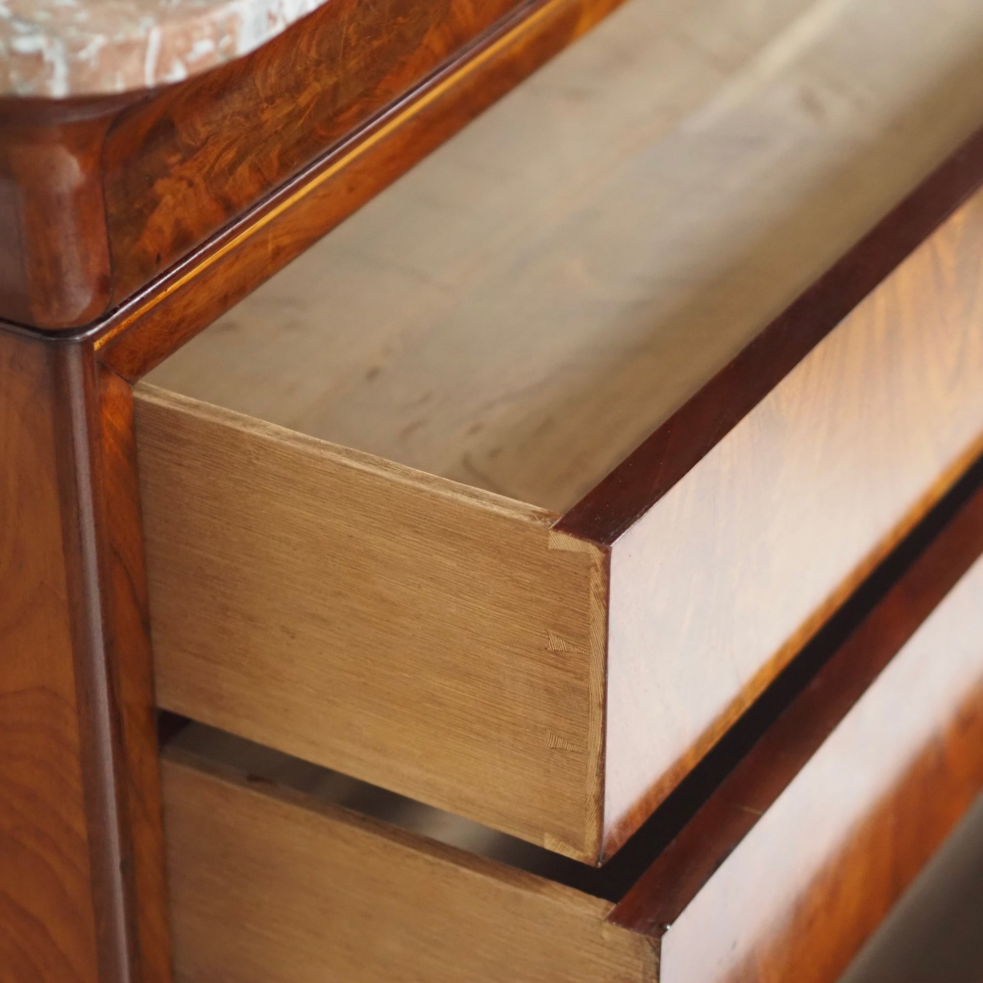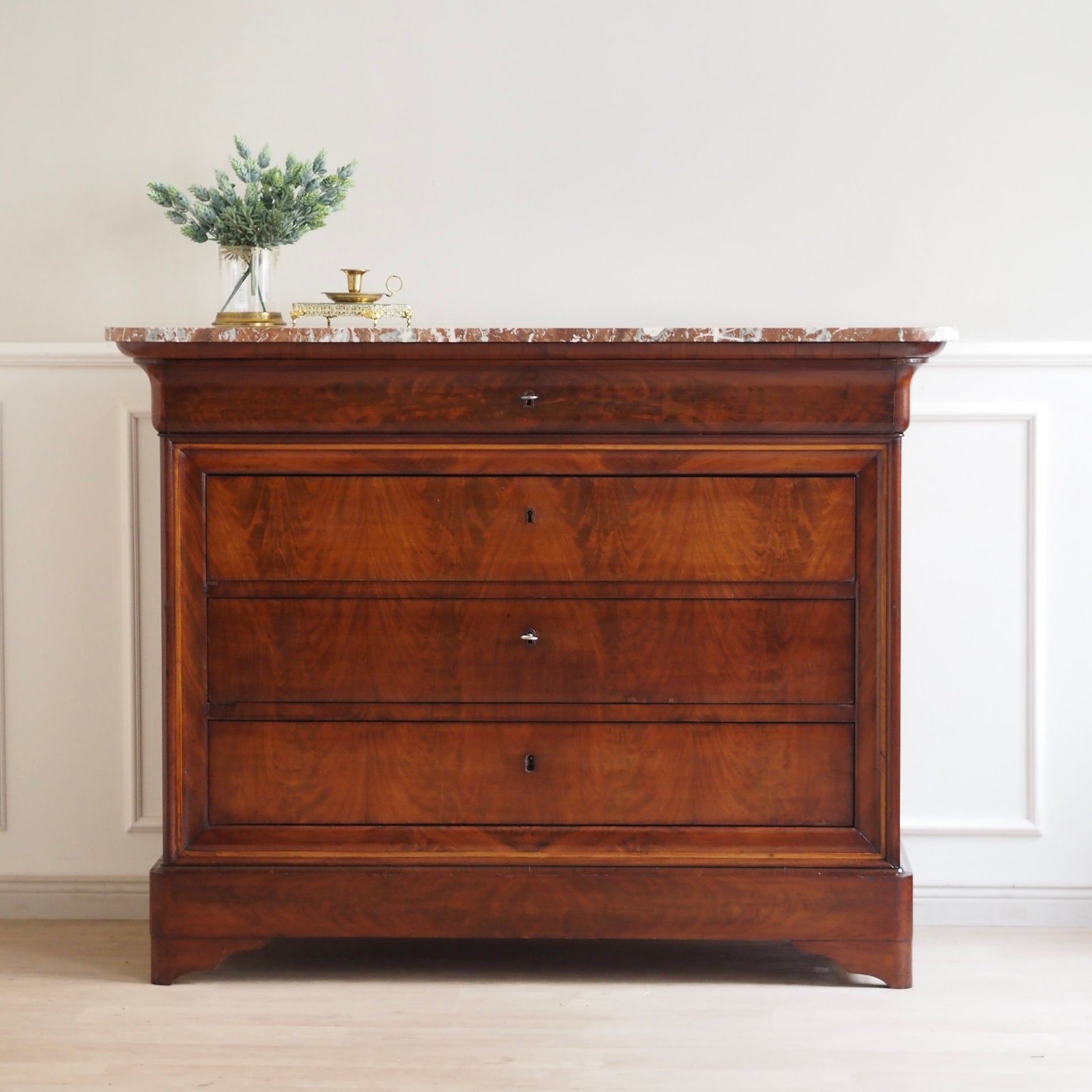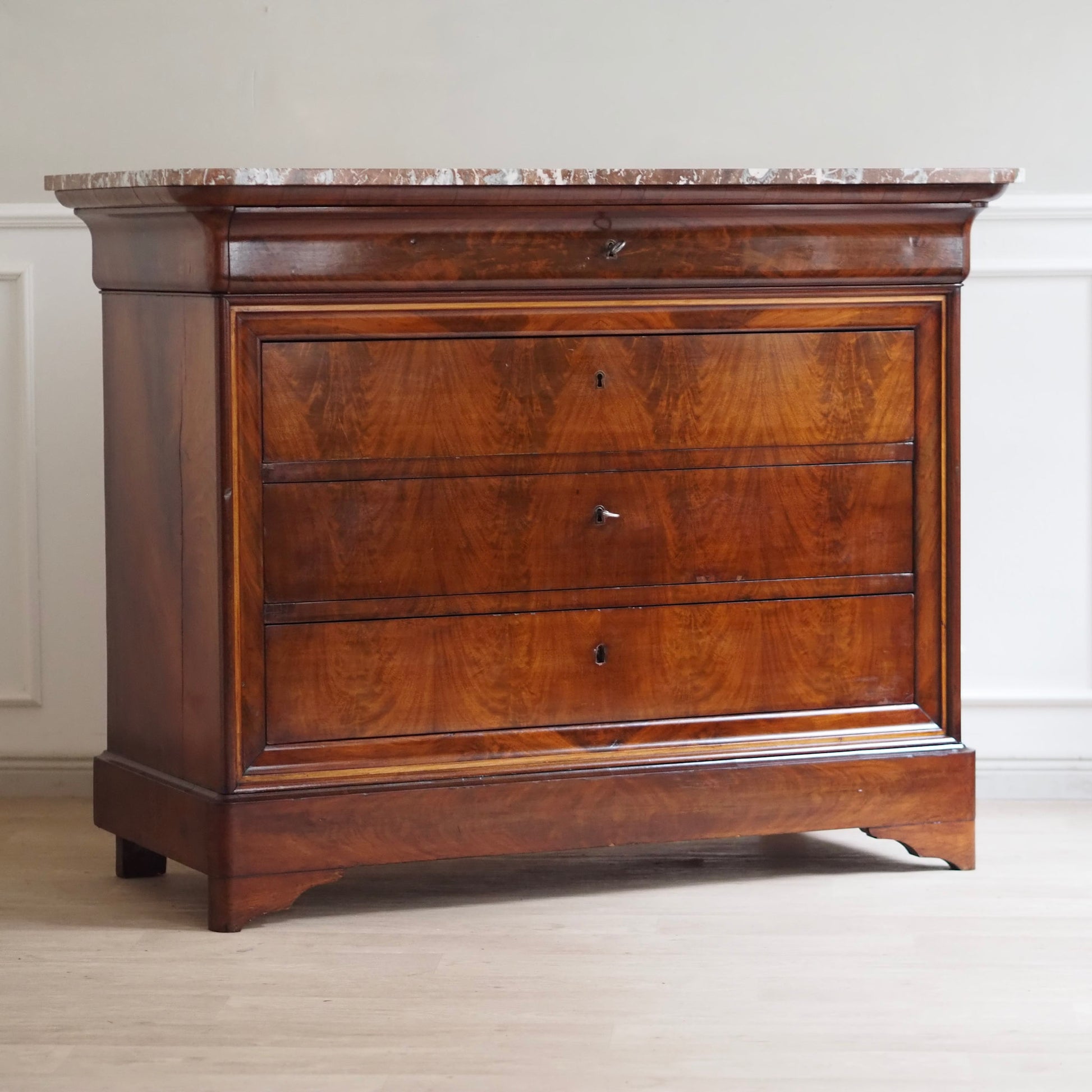 Diese prachtvolle antike Marmorkommode beeindruckt mit ihrem edlen Wurzelfurnier, der harmonischen Maserung und einer massiven rötlich-weiß geäderten Marmorplatte. Die schlichte Eleganz des Louis-Philippe Stils macht sie zu einem zeitlosen Möbelstück mit besonderem Charme. Drei große Schubladen und eine obere schmalere sorgen für reichlich Stauraum. Ein repräsentatives Einzelstück – ideal für Wohn- oder Schlafräume, Flure oder stilvolle Boutiquen.