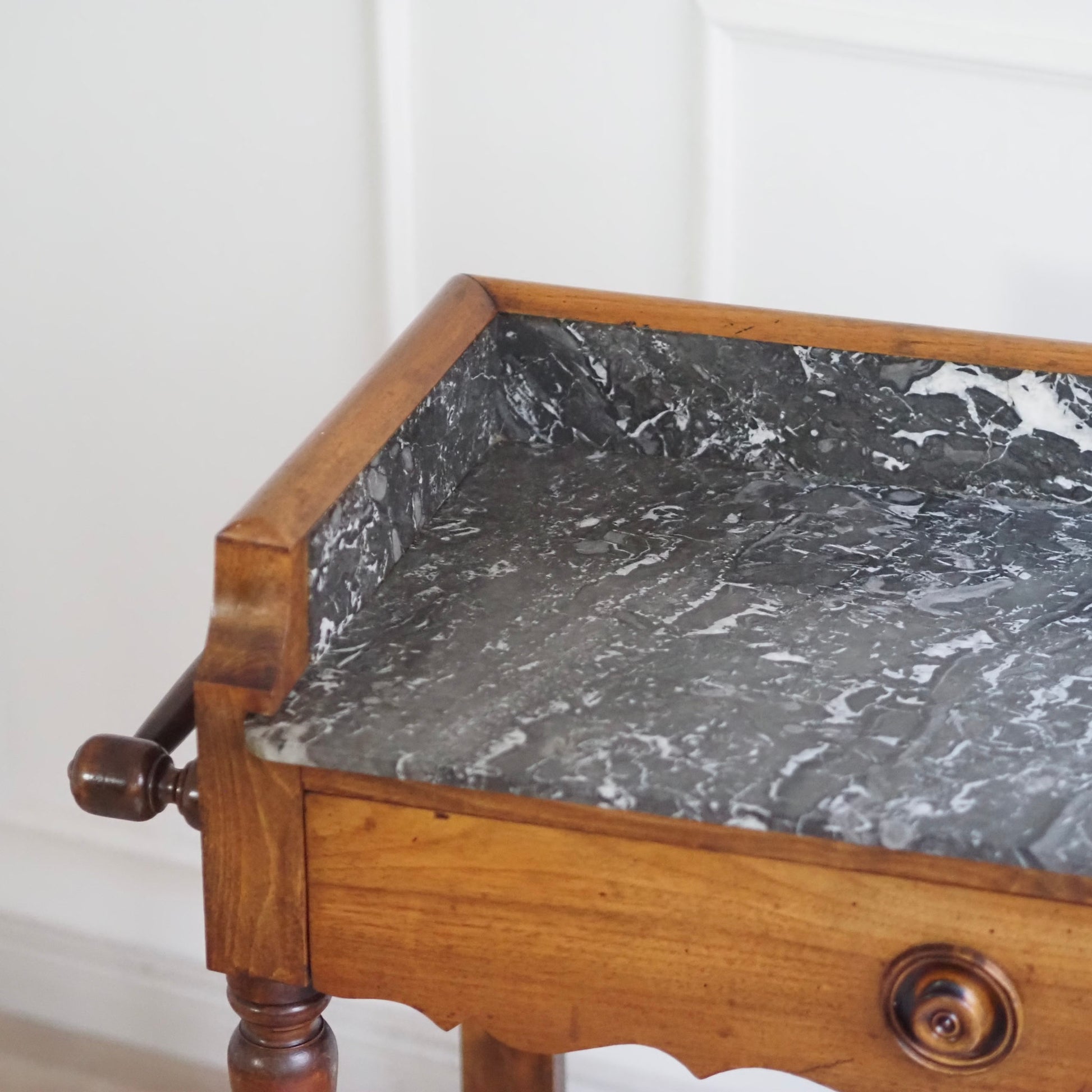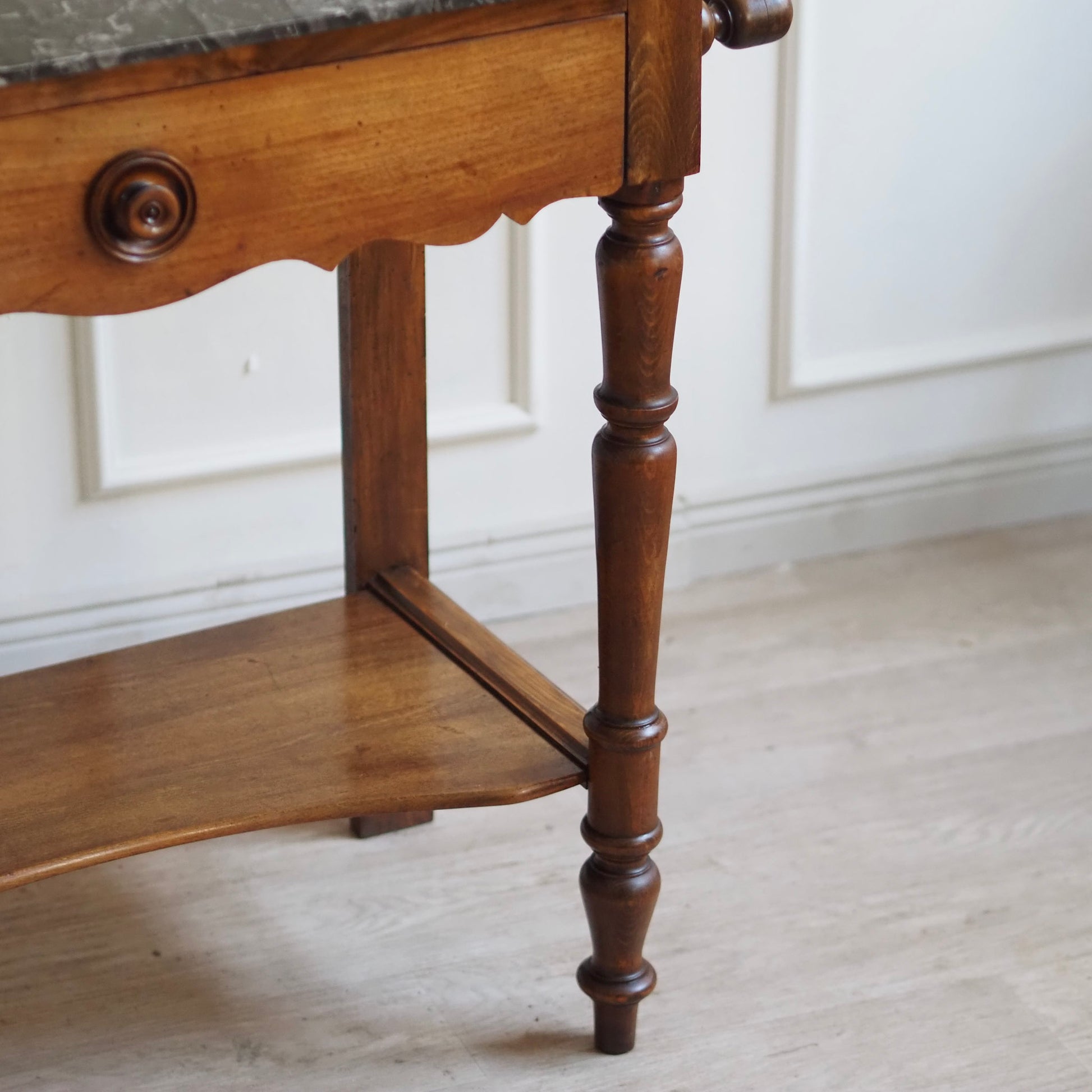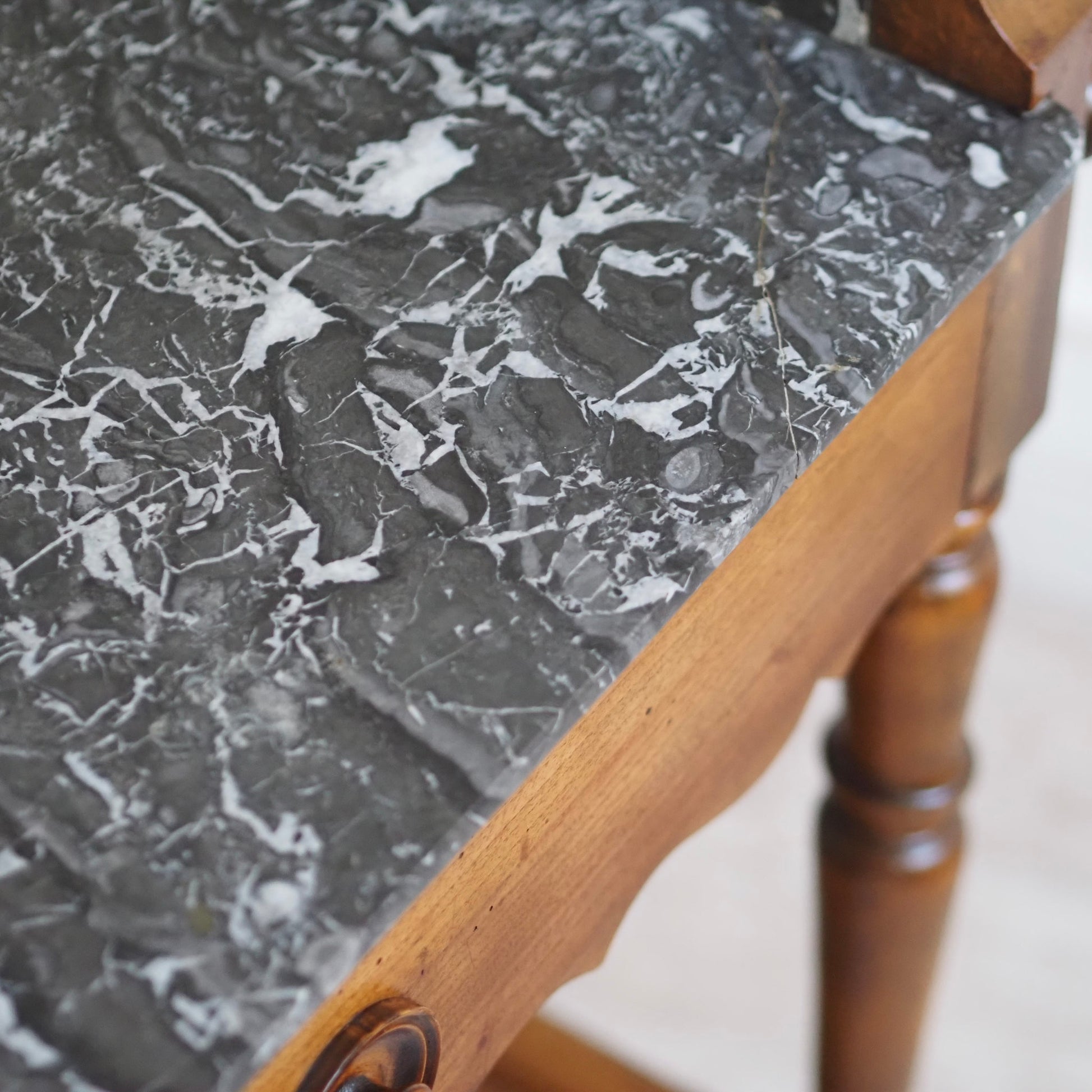 Dieser feine französische Waschtisch stammt aus dem späten 19. Jahrhundert und beeindruckt mit seiner originalen schwarzen Marmorplatte sowie den elegant gedrechselten Beinen. Die klare Formgebung und der warme Holzton in Kombination mit dem Marmor machen das Möbelstück zu einem charmanten Akzent in klassischen wie modernen Interieurs. Eine dekorative und zugleich funktionale Ergänzung für den Wohnbereich, das Ankleidezimmer als Schminktisch oder als Ablagefläche und eleganten Hingucker im Flur. Ideal für die Kombination von neu und alt.