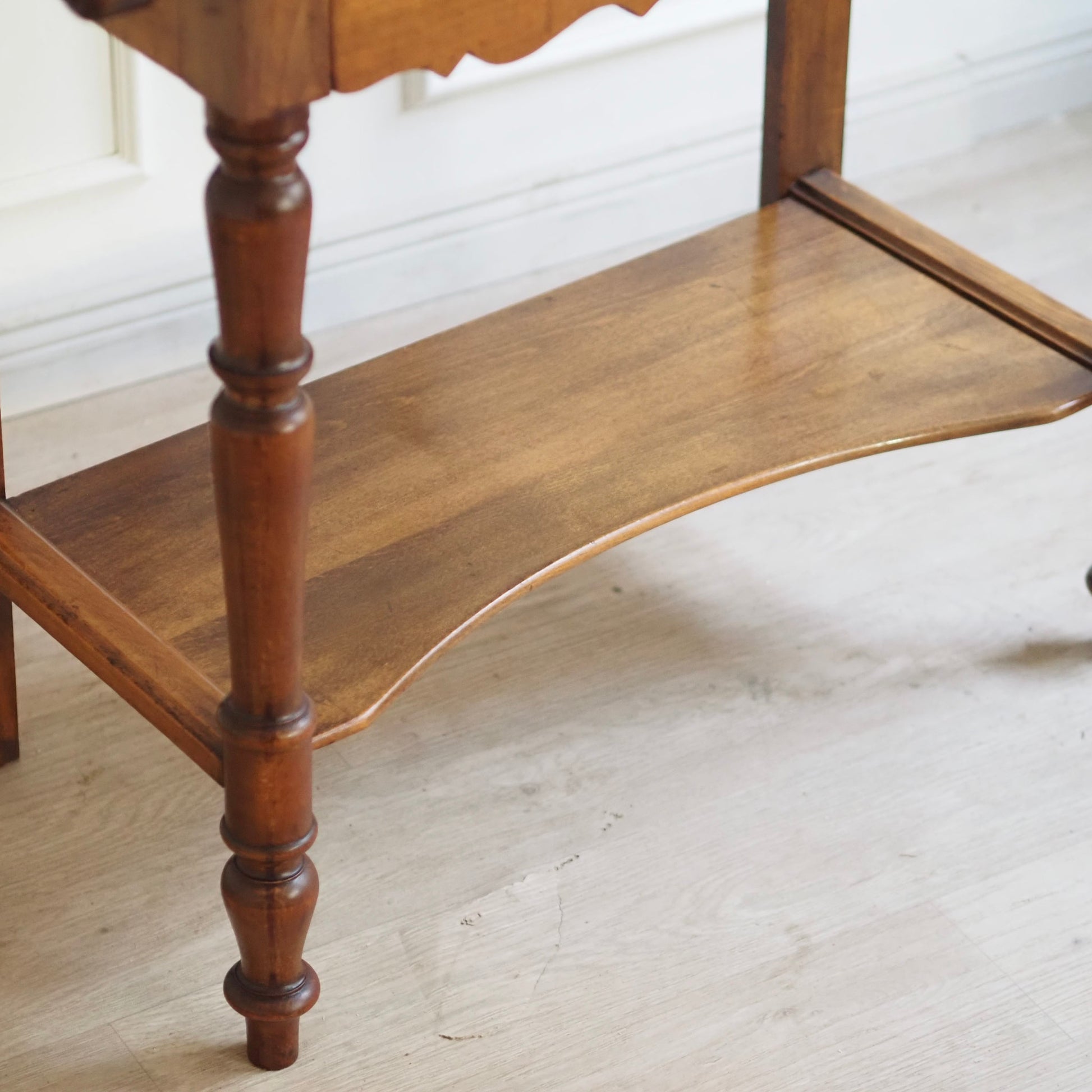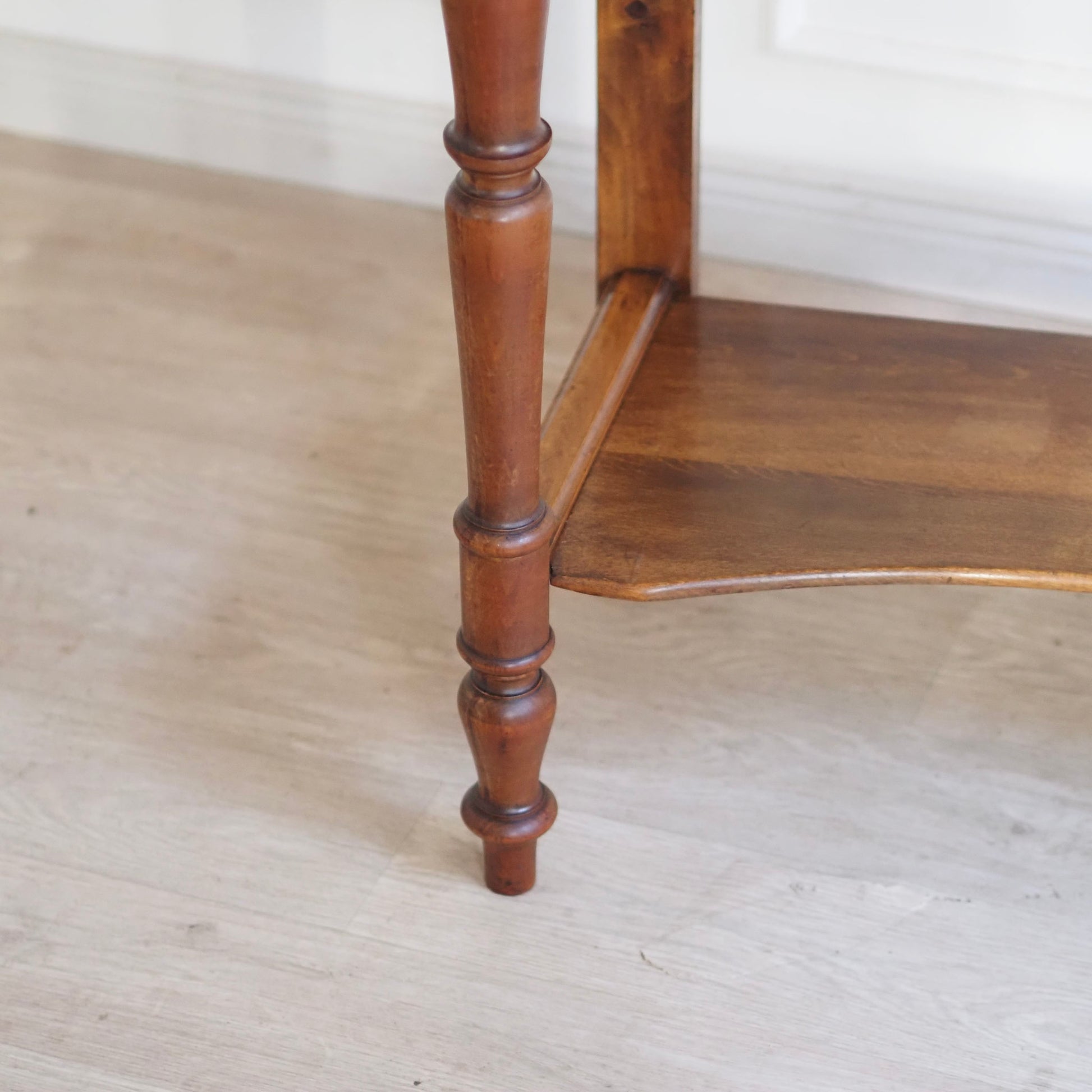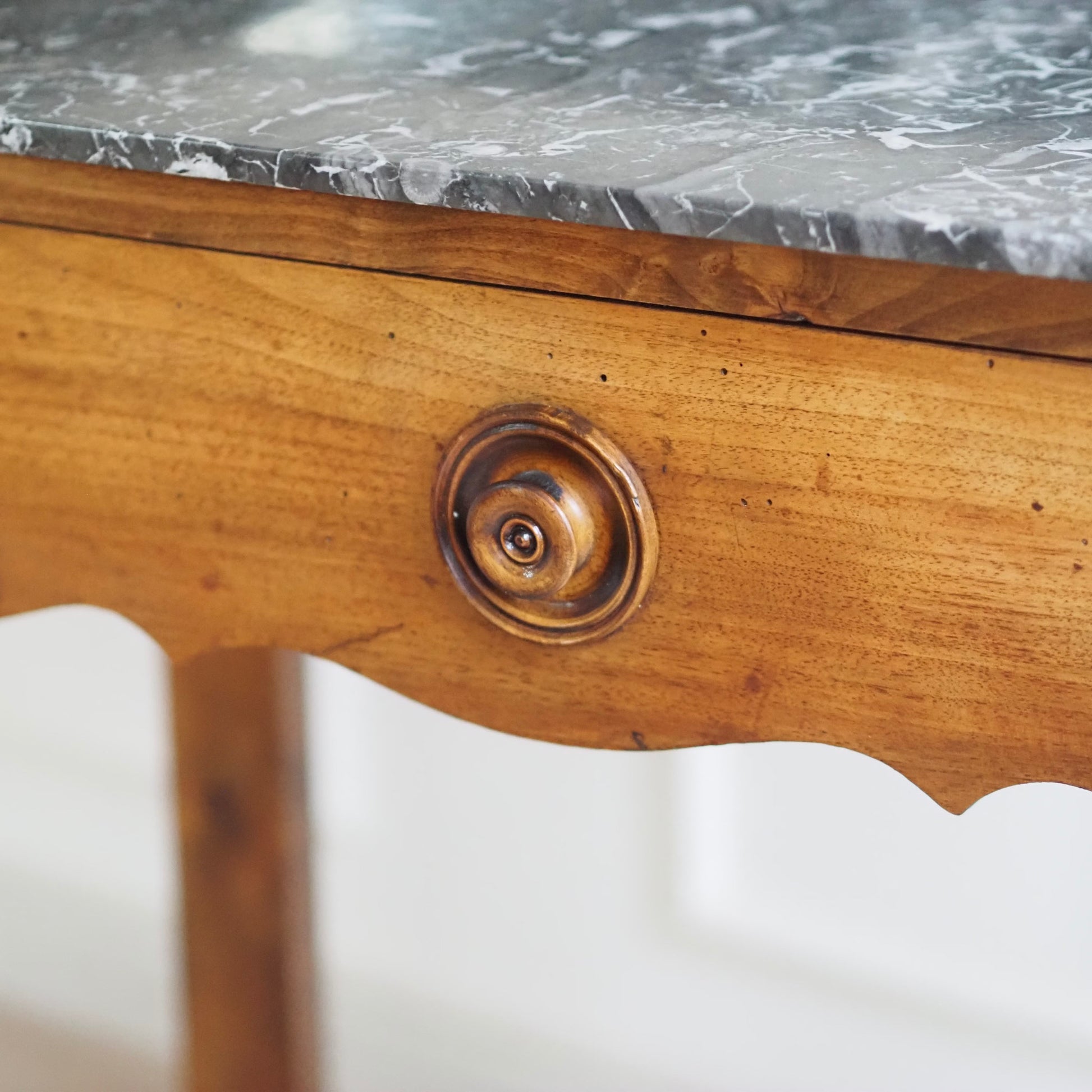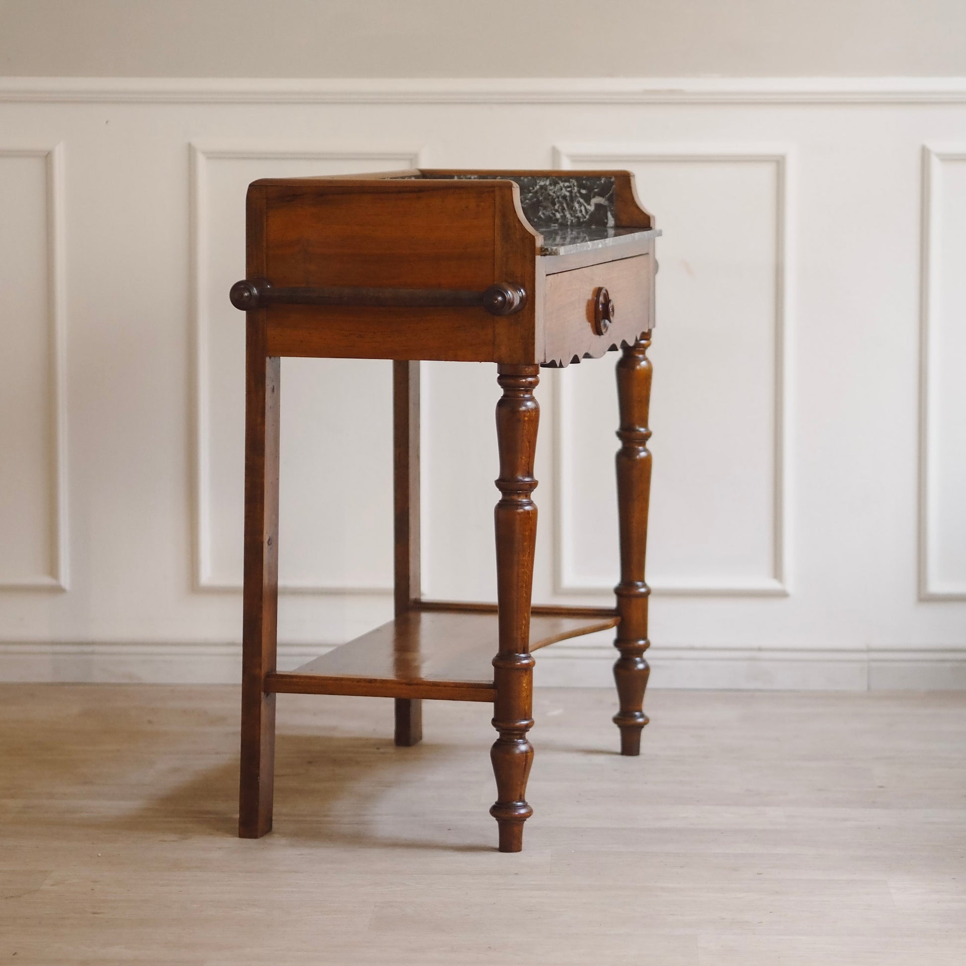 Dieser feine französische Waschtisch stammt aus dem späten 19. Jahrhundert und beeindruckt mit seiner originalen schwarzen Marmorplatte sowie den elegant gedrechselten Beinen. Die klare Formgebung und der warme Holzton in Kombination mit dem Marmor machen das Möbelstück zu einem charmanten Akzent in klassischen wie modernen Interieurs. Eine dekorative und zugleich funktionale Ergänzung für den Wohnbereich, das Ankleidezimmer als Schminktisch oder als Ablagefläche und eleganten Hingucker im Flur. Ideal für die Kombination von neu und alt.