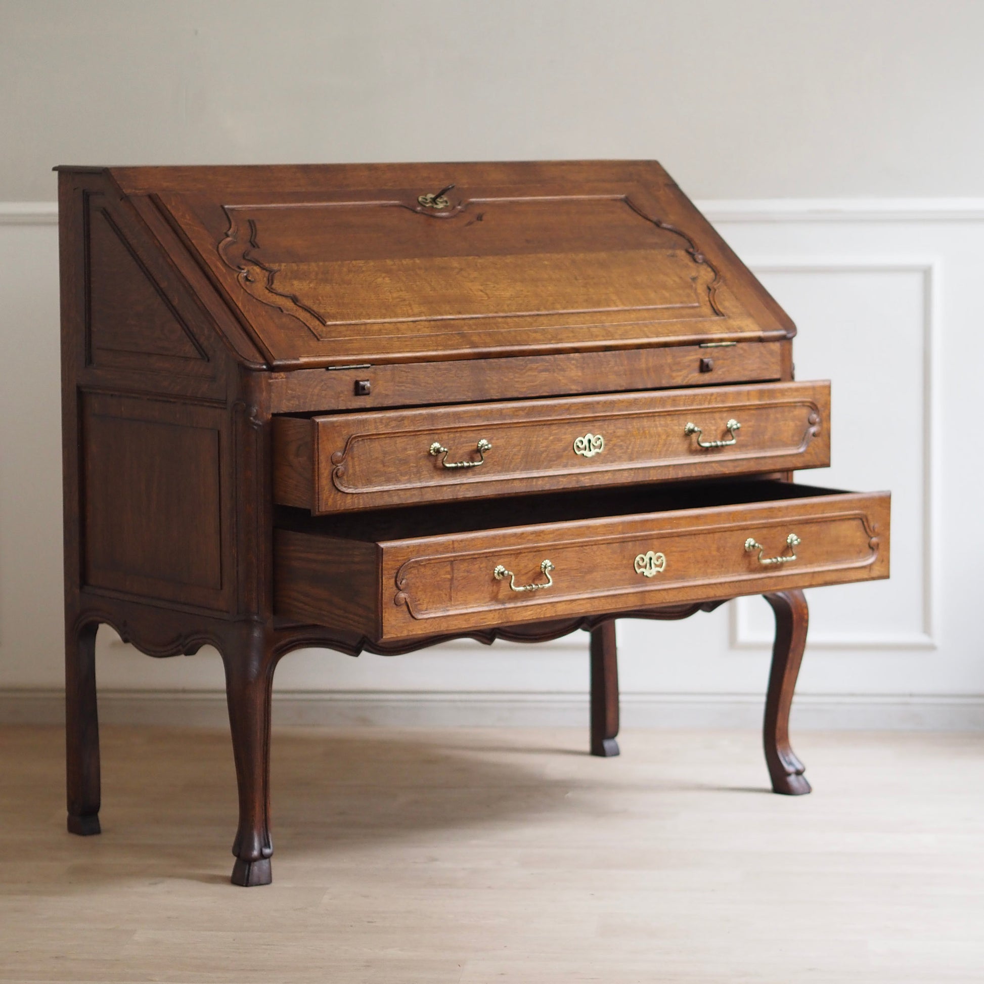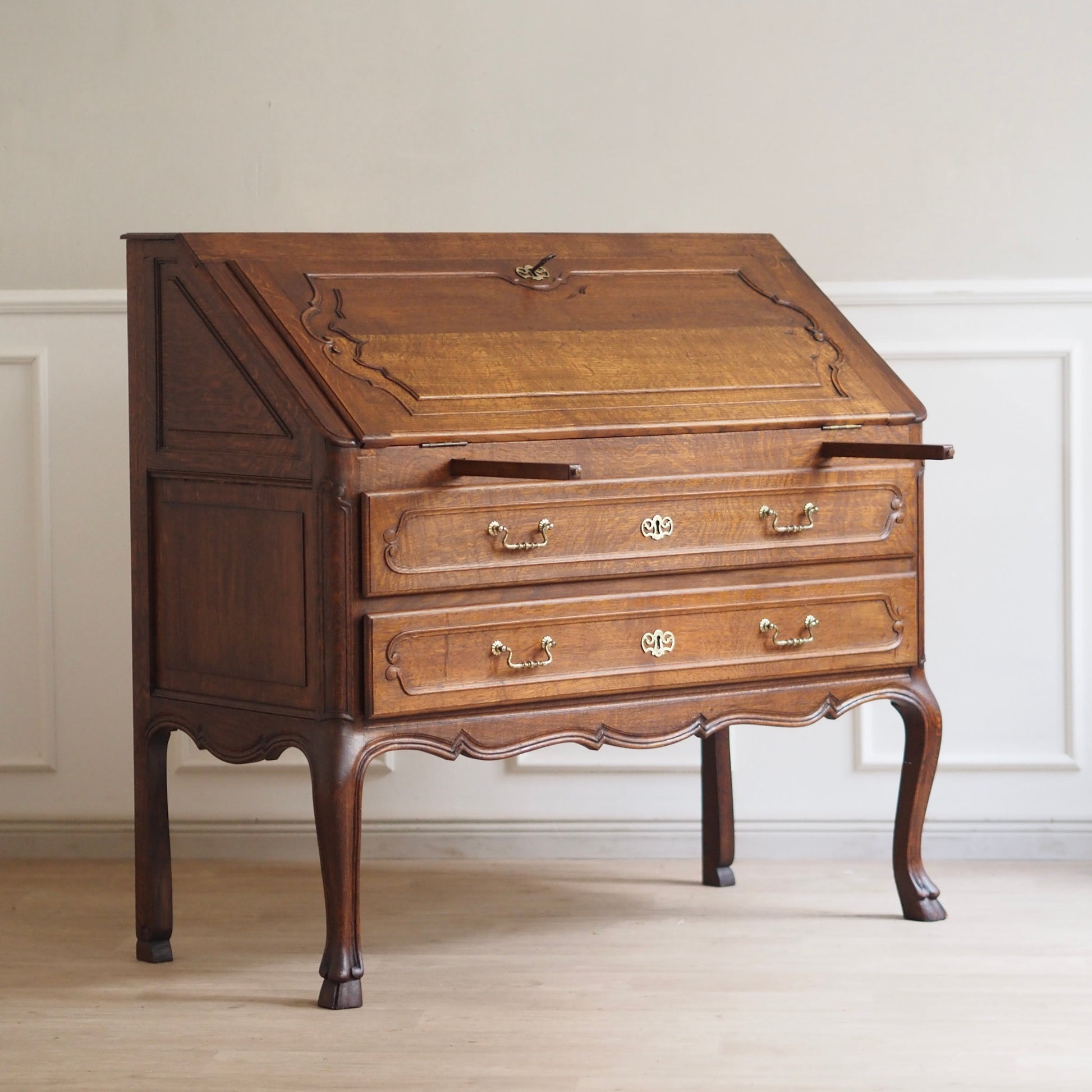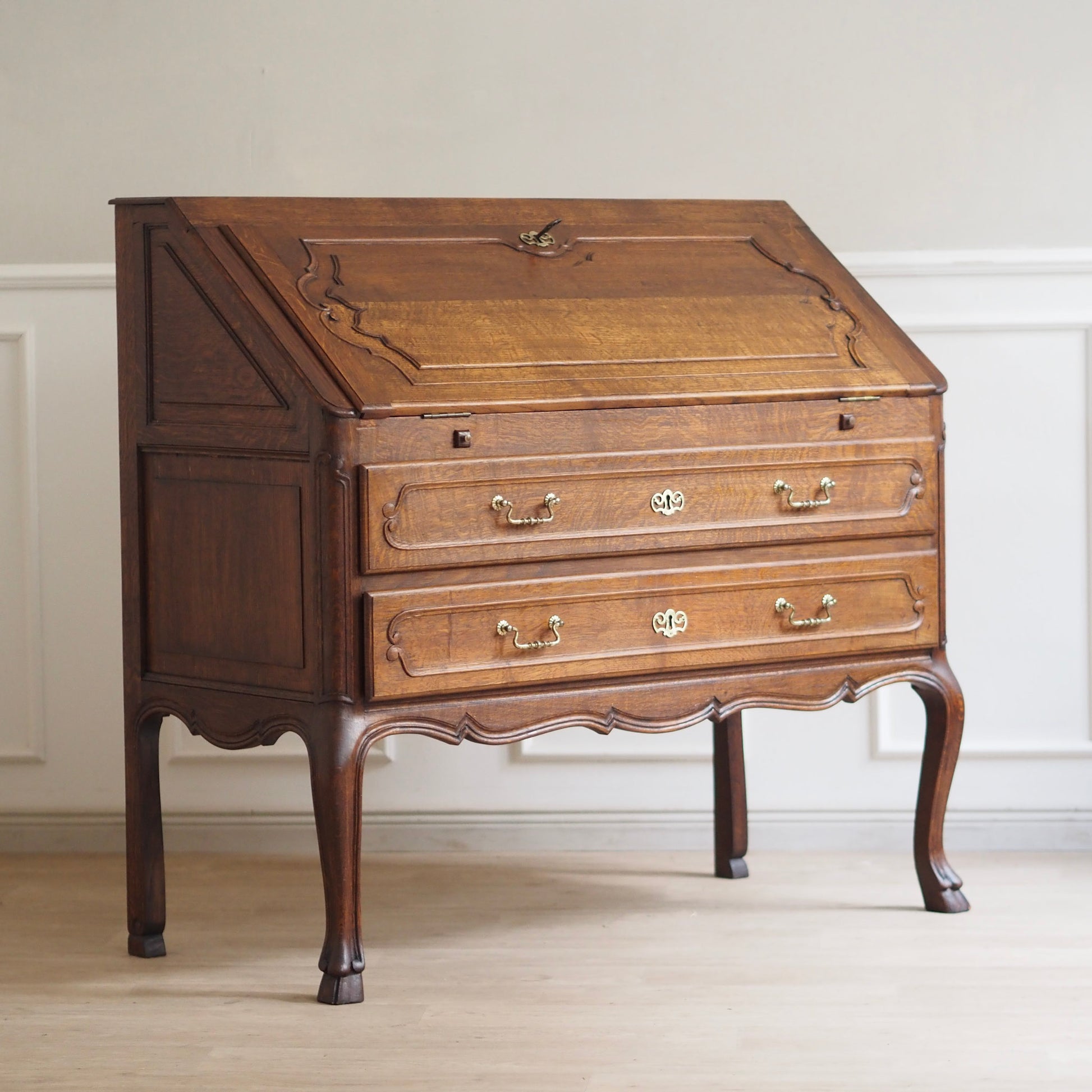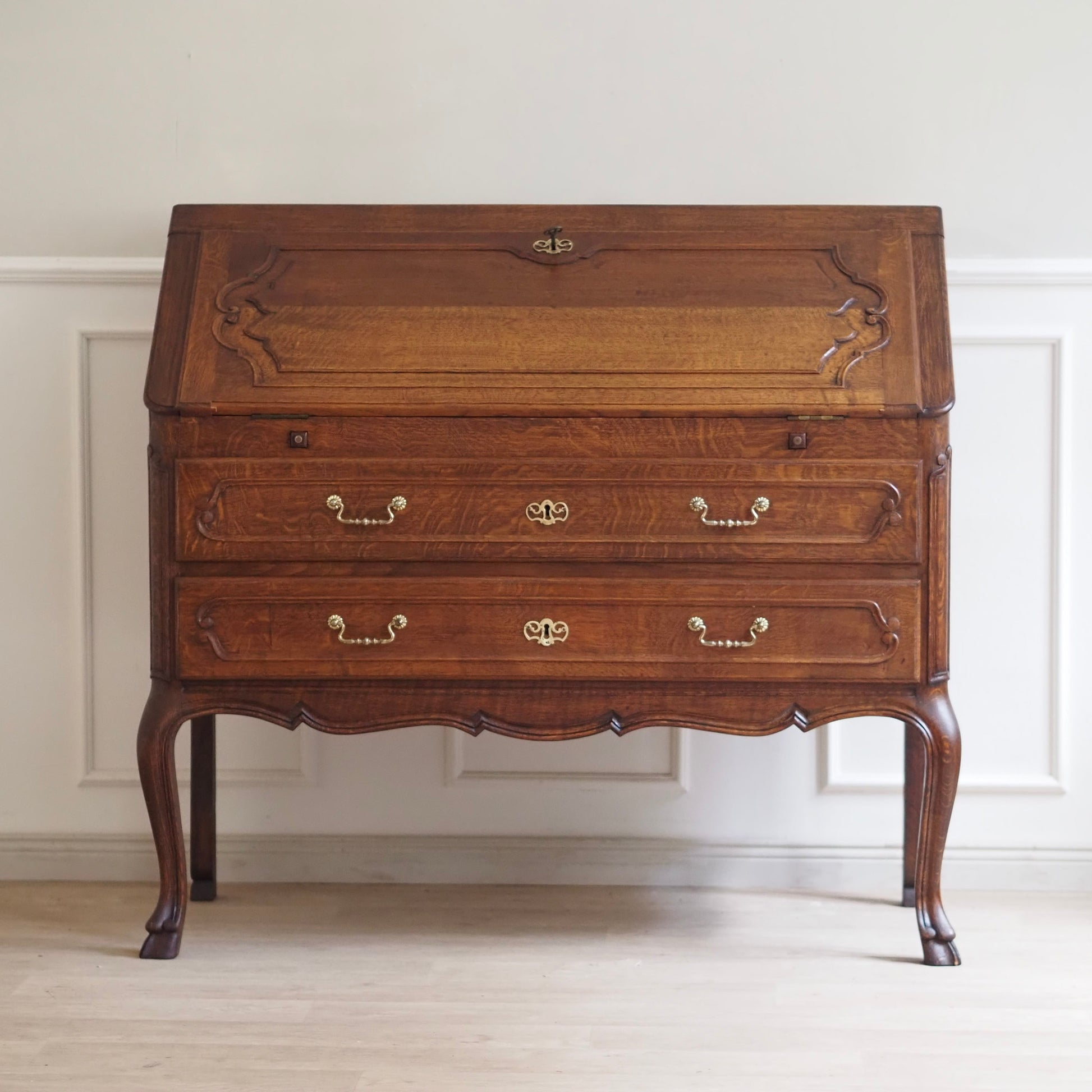 Eleganter französischer Schreibsekretär im Barockstil mit fein geschwungenen Beinen, zwei großen Schubladen und aufklappbarer Schreibfläche. Der Innenbereich bietet reichlich Stauraum mit 3 kleinen Schubladen und Fächern für Briefe, Notizen und Zubehör. Das Möbelstück besticht durch seine geschwungene Linienführung, kunstvoll profilierte Fronten und fein gearbeitete Details. Das geschwungene Untergestell mit geschweiften Beinen sorgt für eine grazile Leichtigkeit.