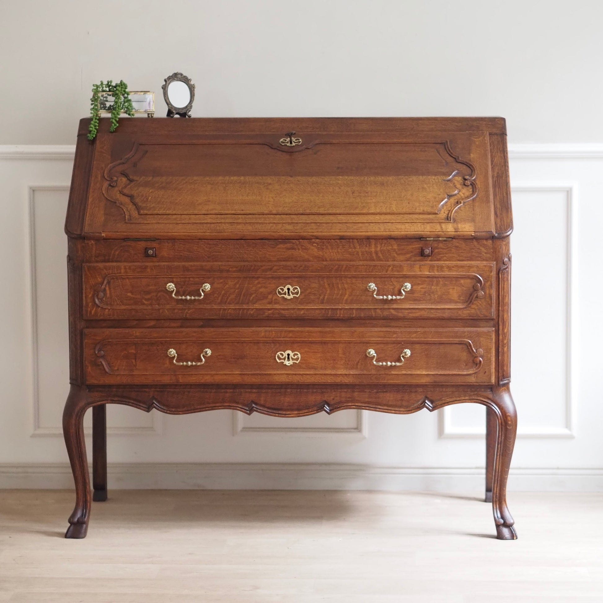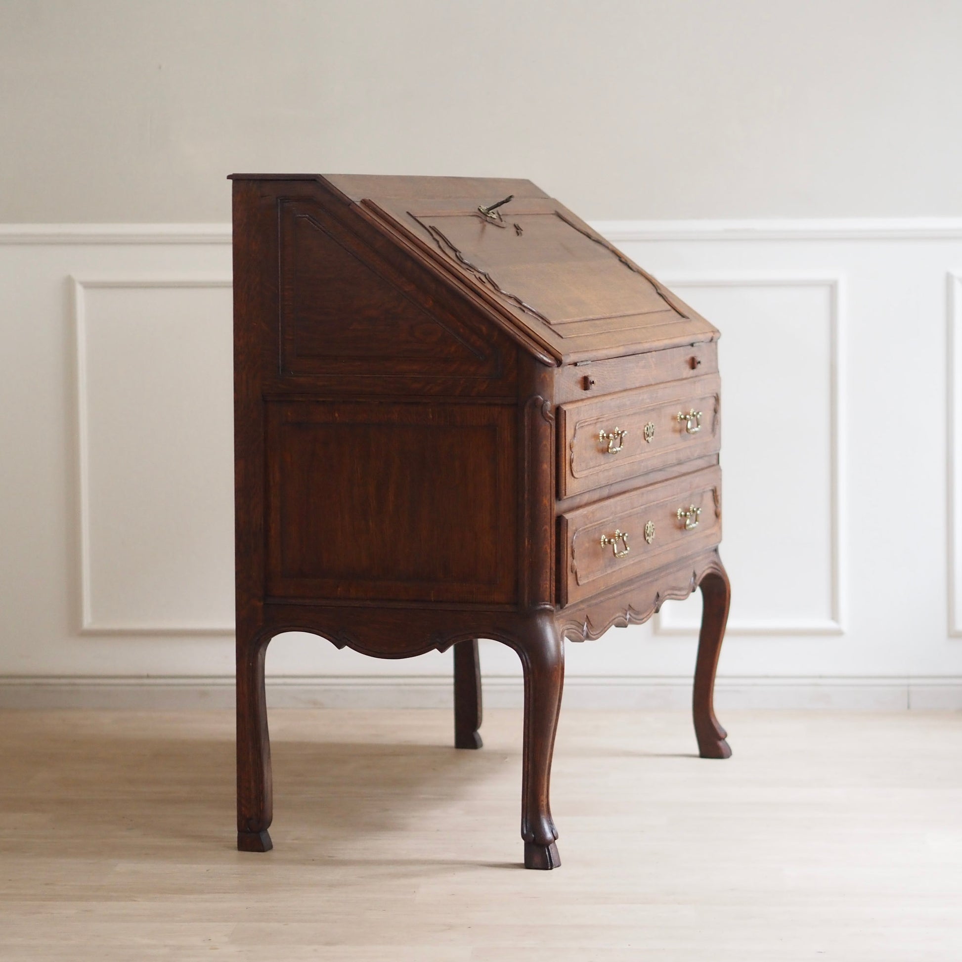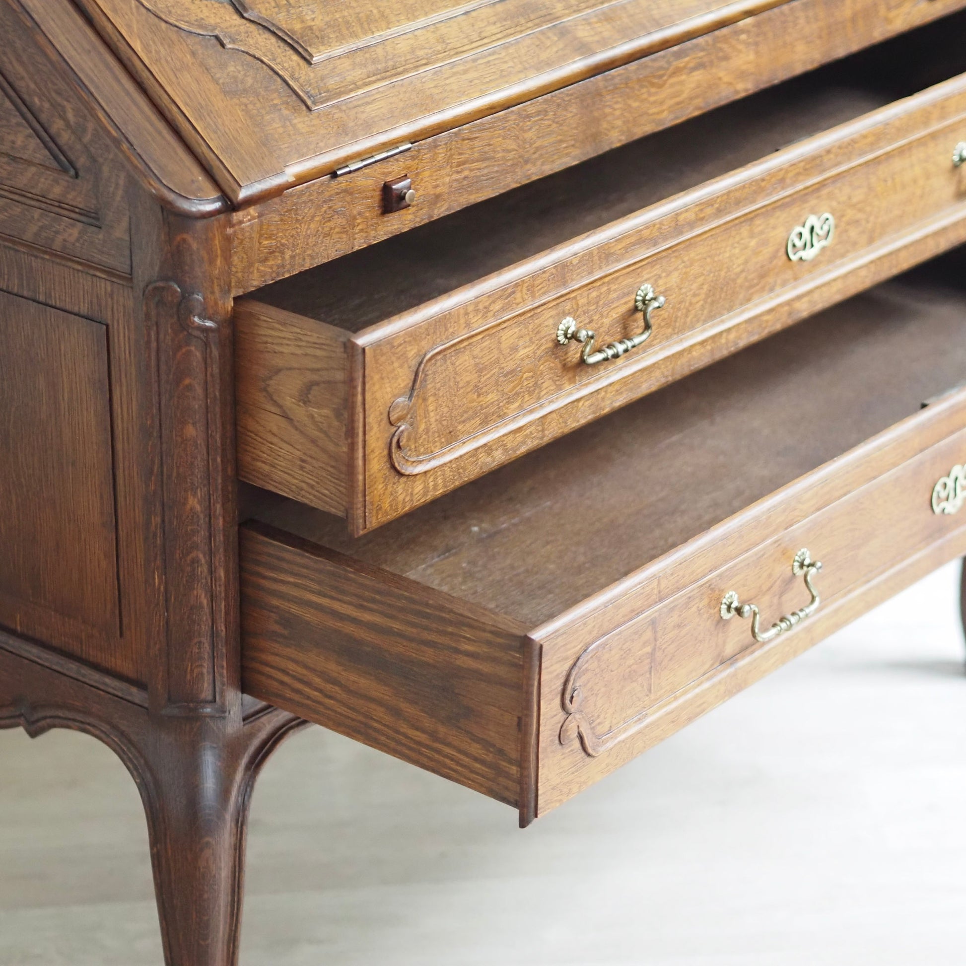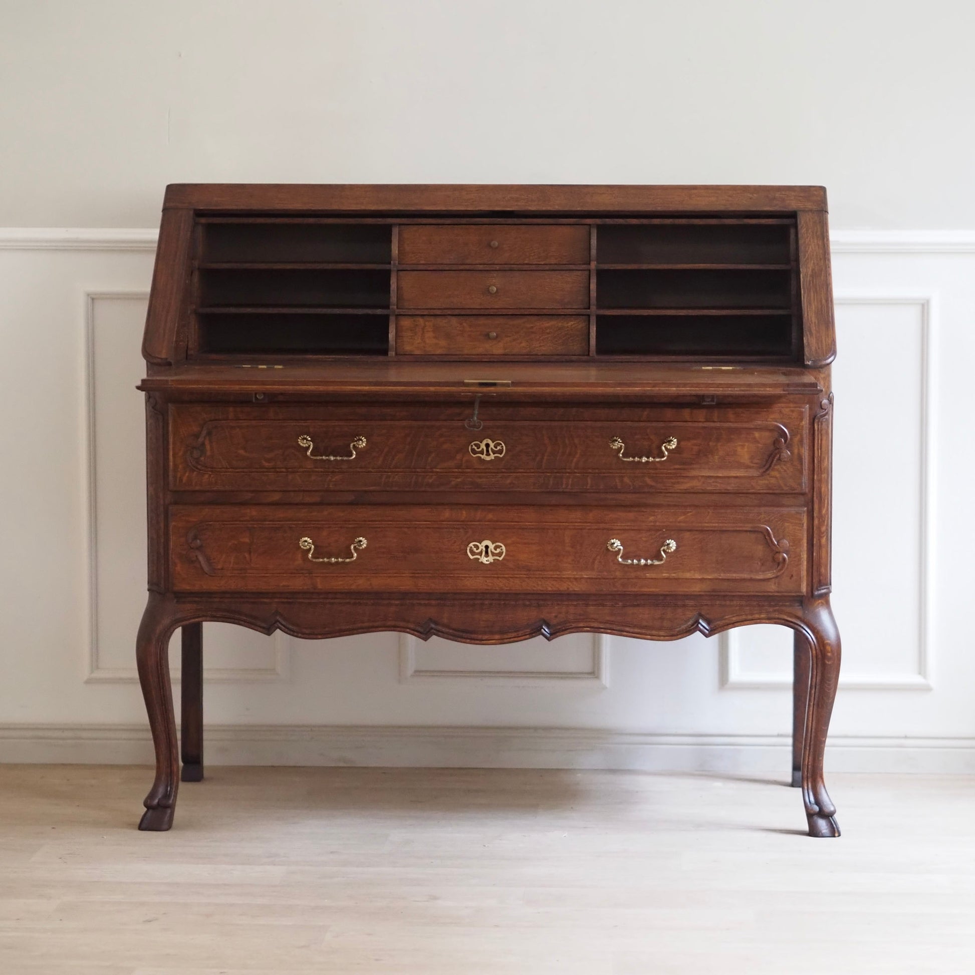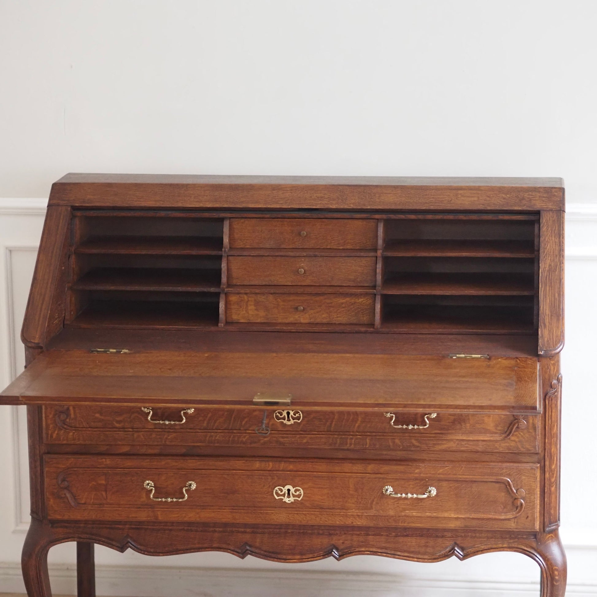 Eleganter französischer Schreibsekretär im Barockstil mit fein geschwungenen Beinen, zwei großen Schubladen und aufklappbarer Schreibfläche. Der Innenbereich bietet reichlich Stauraum mit 3 kleinen Schubladen und Fächern für Briefe, Notizen und Zubehör. Das Möbelstück besticht durch seine geschwungene Linienführung, kunstvoll profilierte Fronten und fein gearbeitete Details. Das geschwungene Untergestell mit geschweiften Beinen sorgt für eine grazile Leichtigkeit.