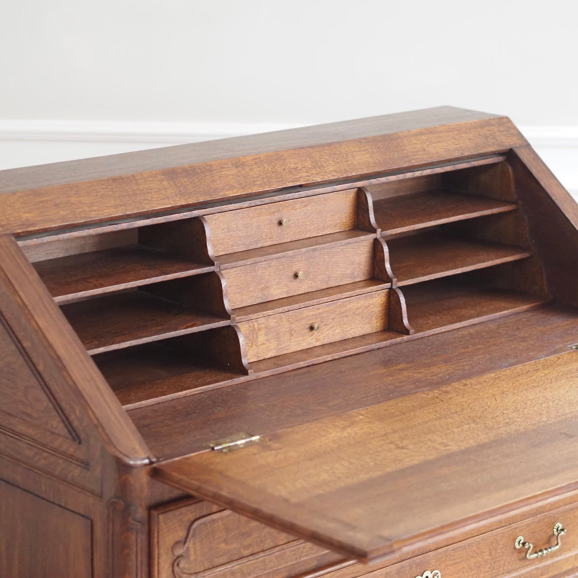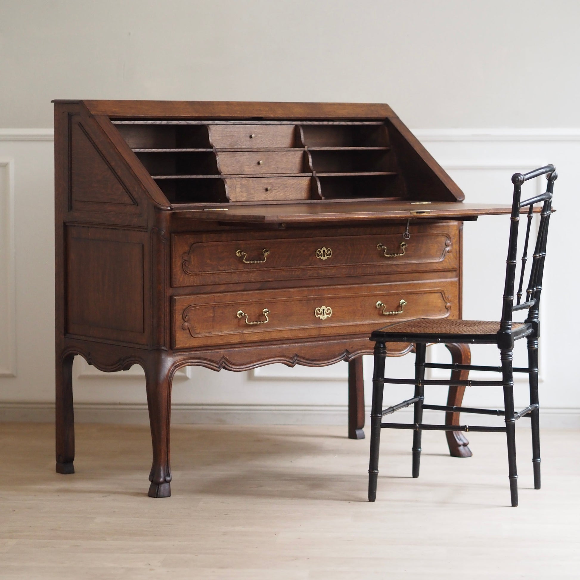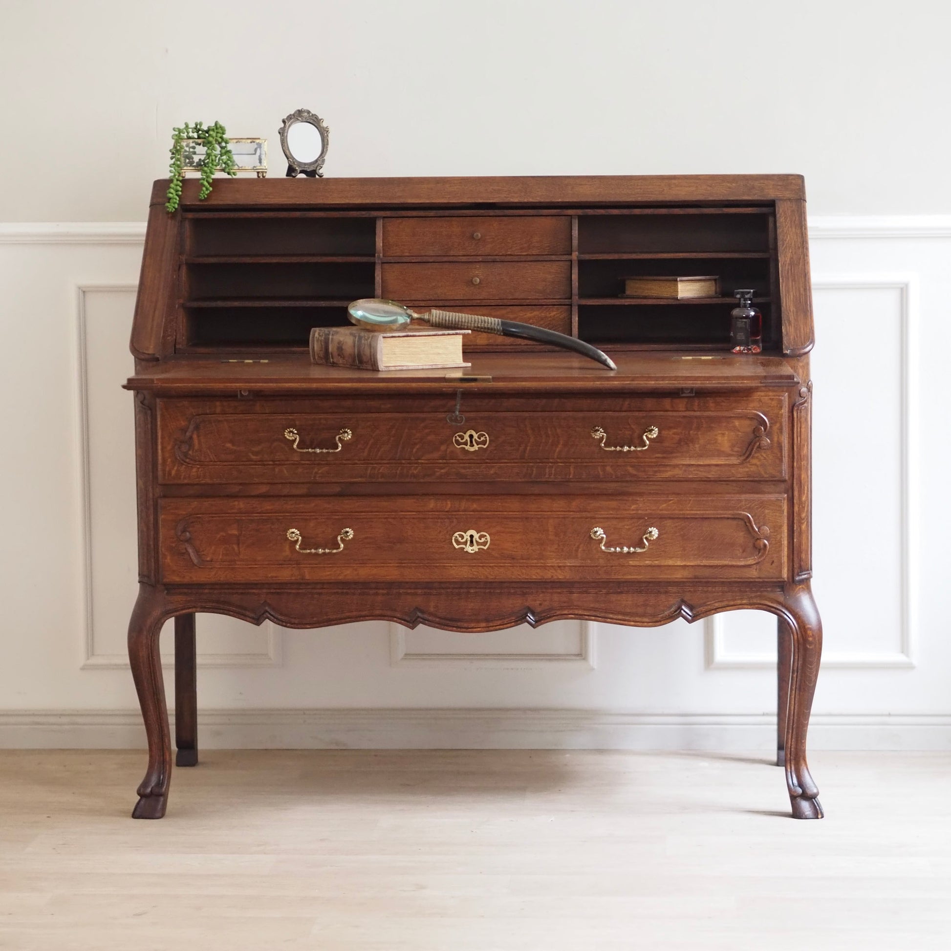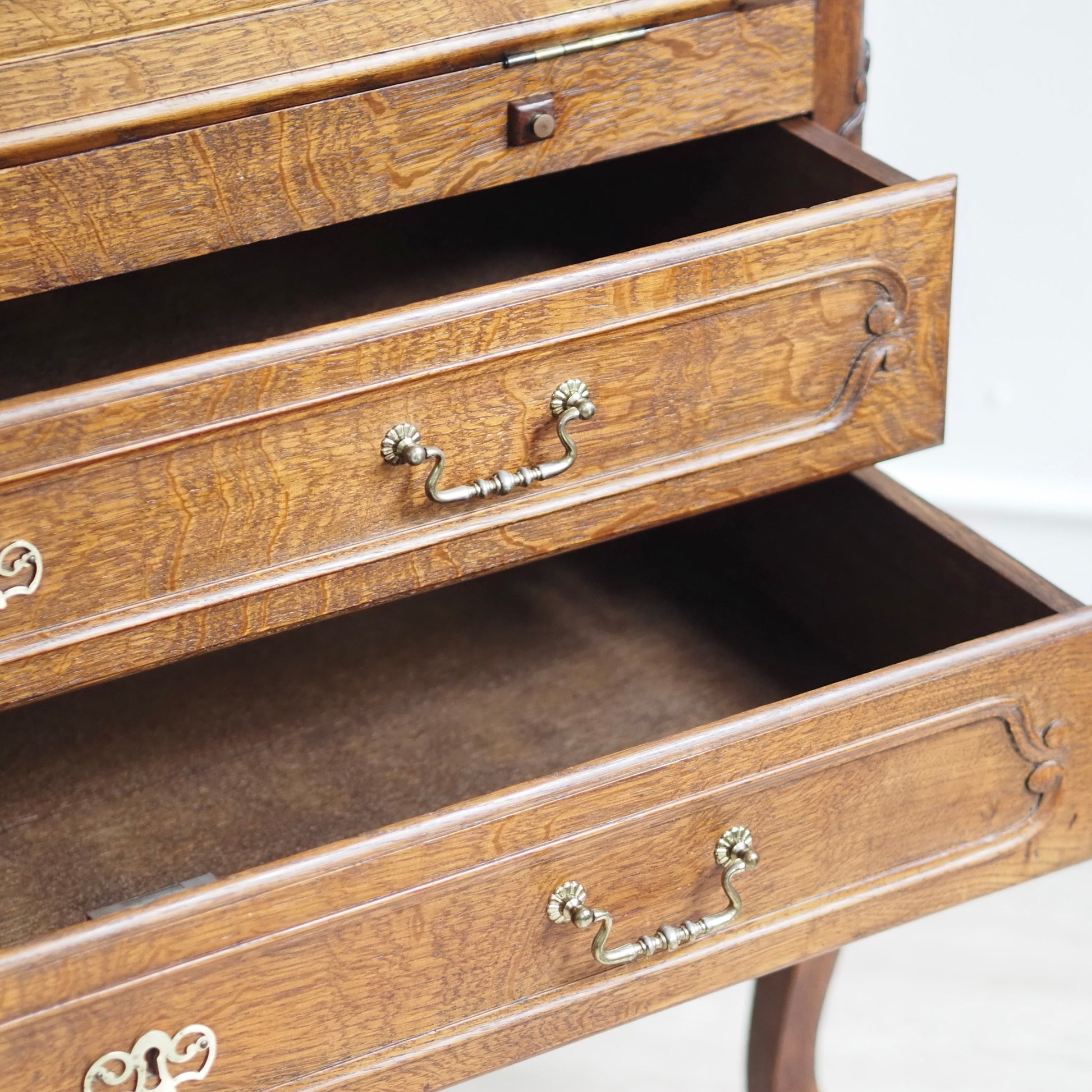Eleganter französischer Schreibsekretär im Barockstil mit fein geschwungenen Beinen, zwei großen Schubladen und aufklappbarer Schreibfläche. Der Innenbereich bietet reichlich Stauraum mit 3 kleinen Schubladen und Fächern für Briefe, Notizen und Zubehör. Das Möbelstück besticht durch seine geschwungene Linienführung, kunstvoll profilierte Fronten und fein gearbeitete Details. Das geschwungene Untergestell mit geschweiften Beinen sorgt für eine grazile Leichtigkeit.