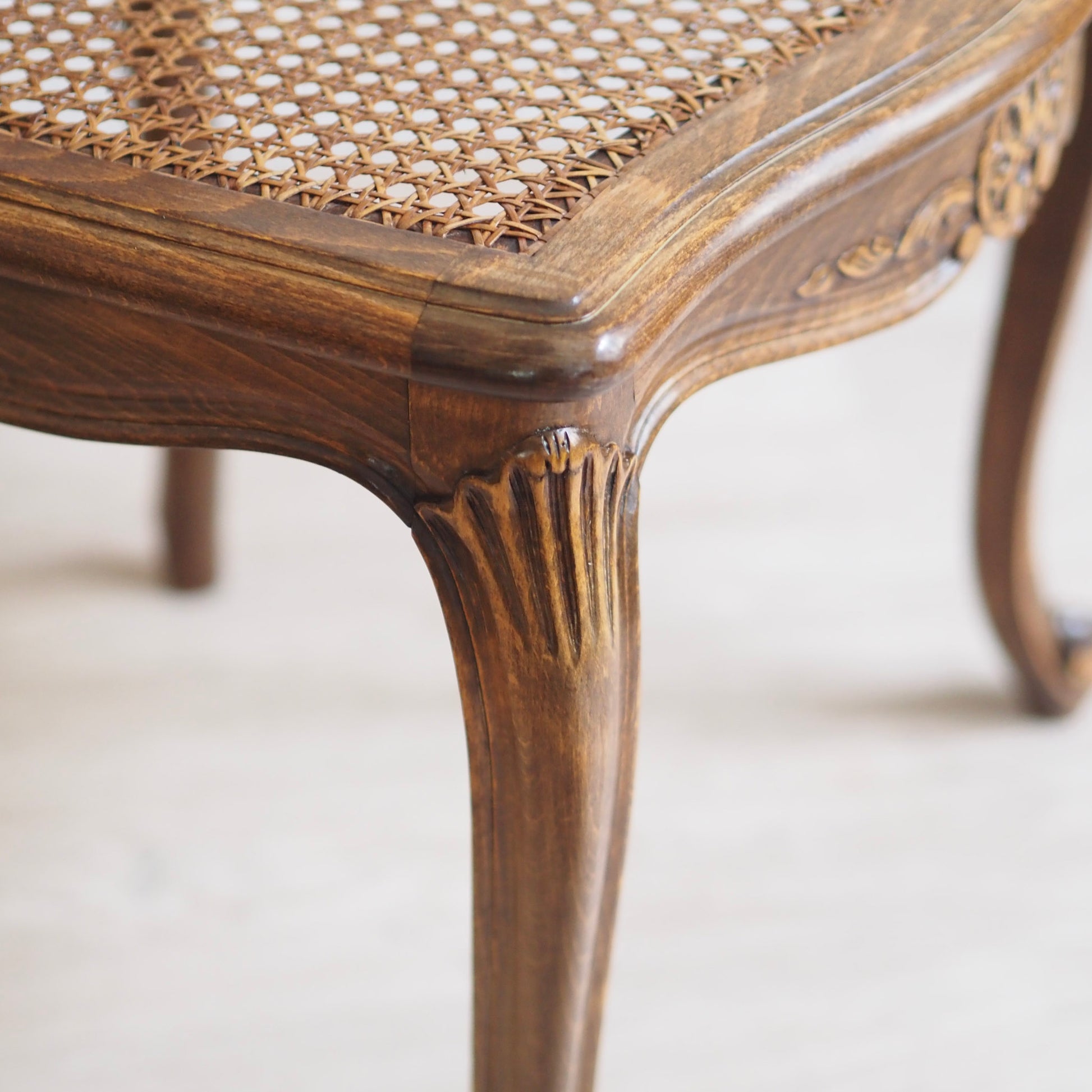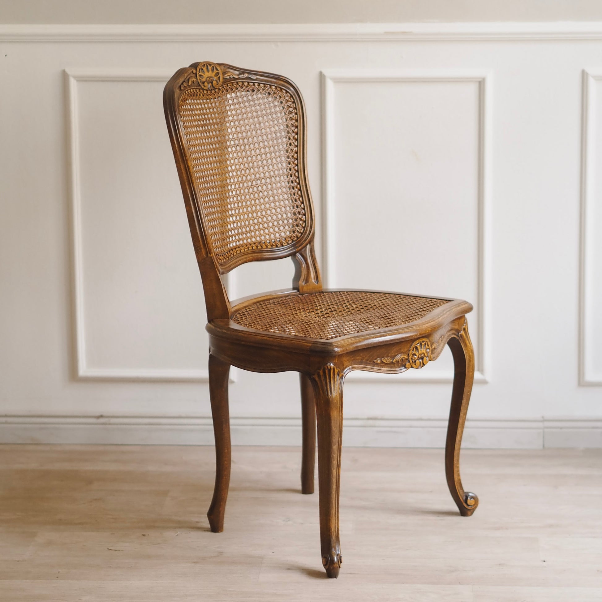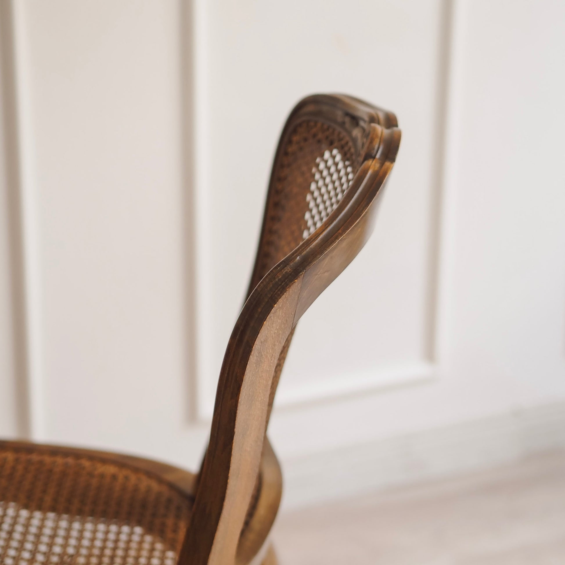 Dieses exquisite Set aus vier französischen Stühlen im Stil Louis XV vereint handwerkliche Qualität mit klassischem Charme. Die geschwungenen Beine und die elegant profilierte Zarge spiegeln den Einfluss des Rokoko wider, während das sorgfältig gearbeitete Wiener Geflecht in Sitzfläche und Rückenlehne Leichtigkeit und Transparenz verleiht. Jeder Stuhl zeigt feine Details in der Holzbearbeitung – von der sanften Wölbung der Rückenlehne bis hin zu den geschnitzten Füßen mit Schneckenform.
