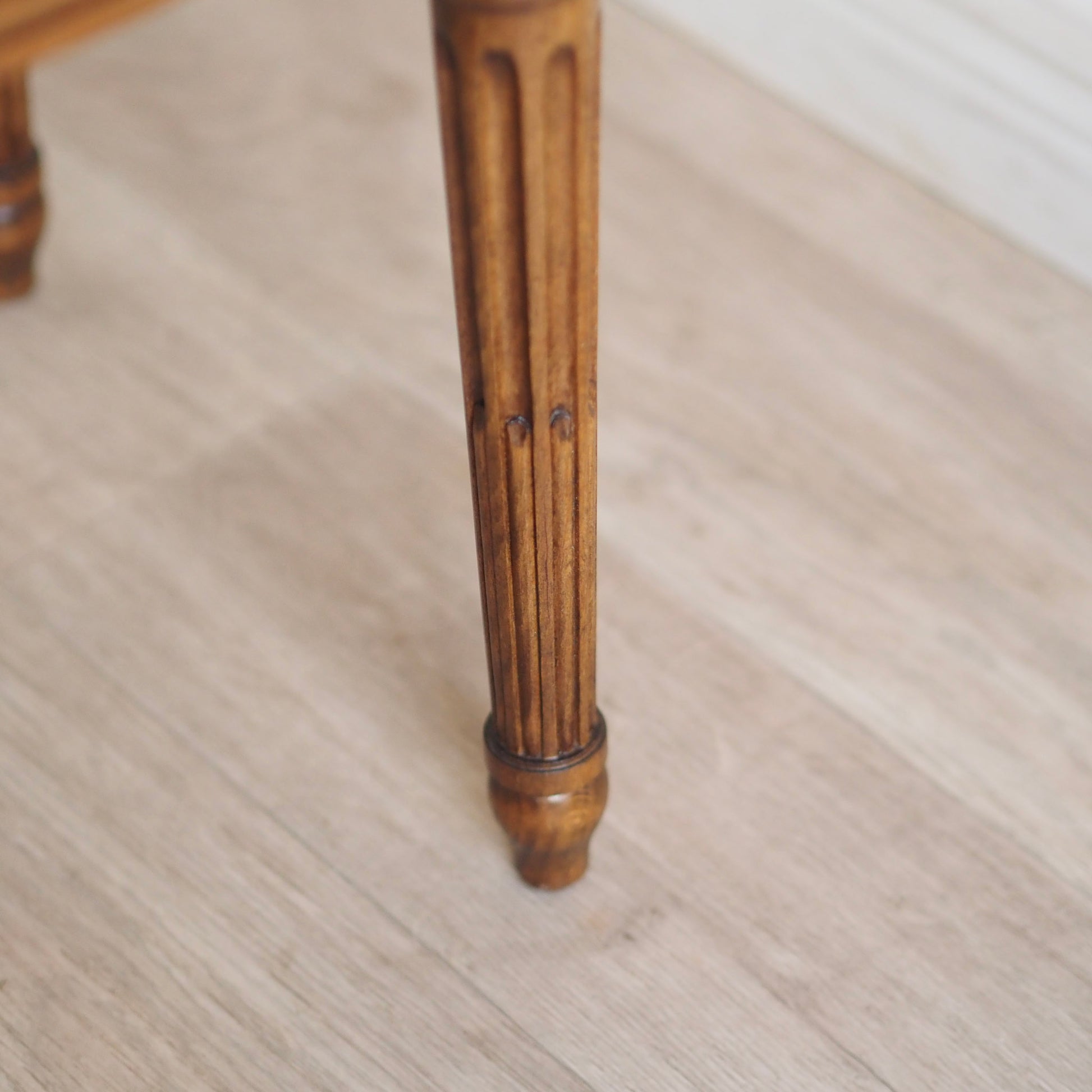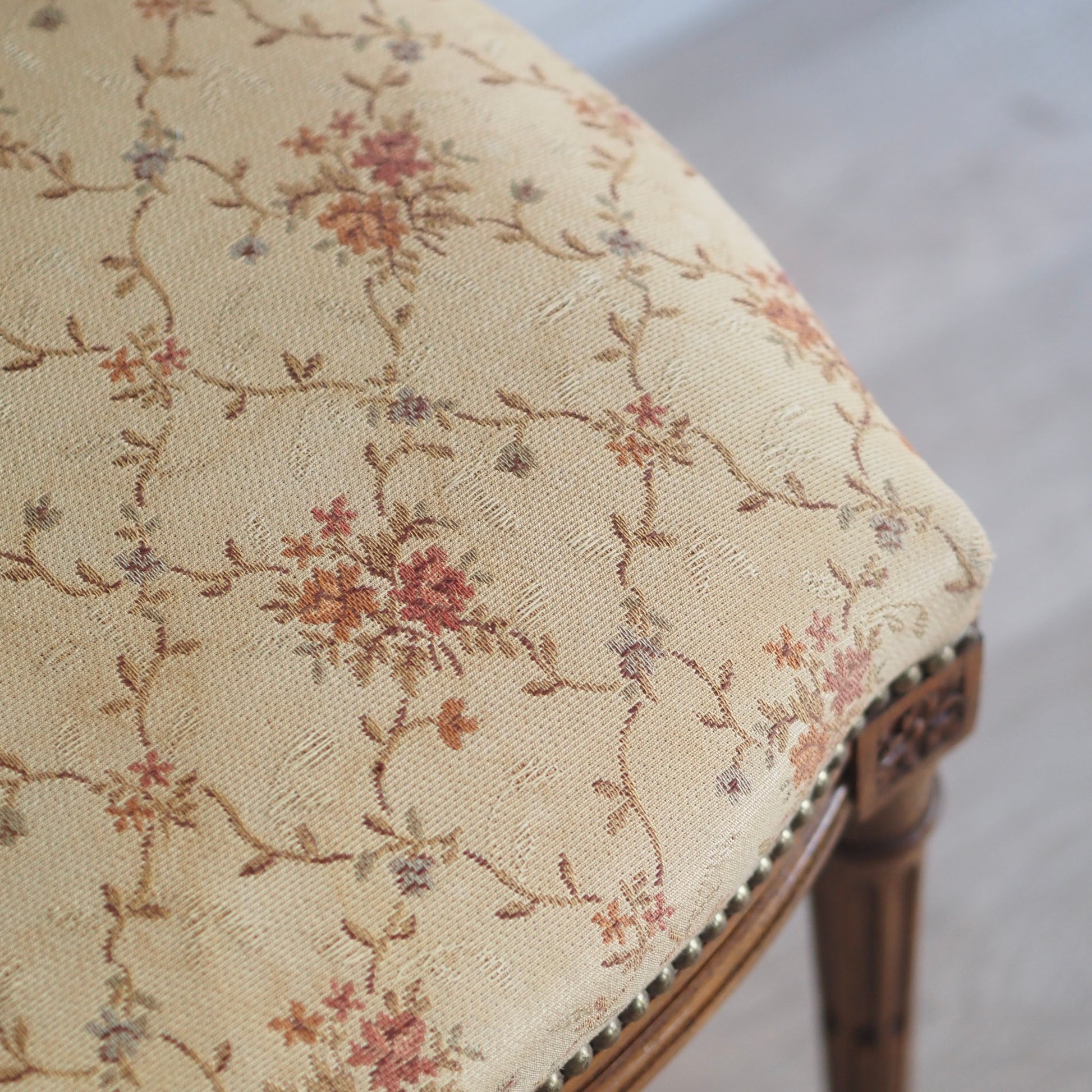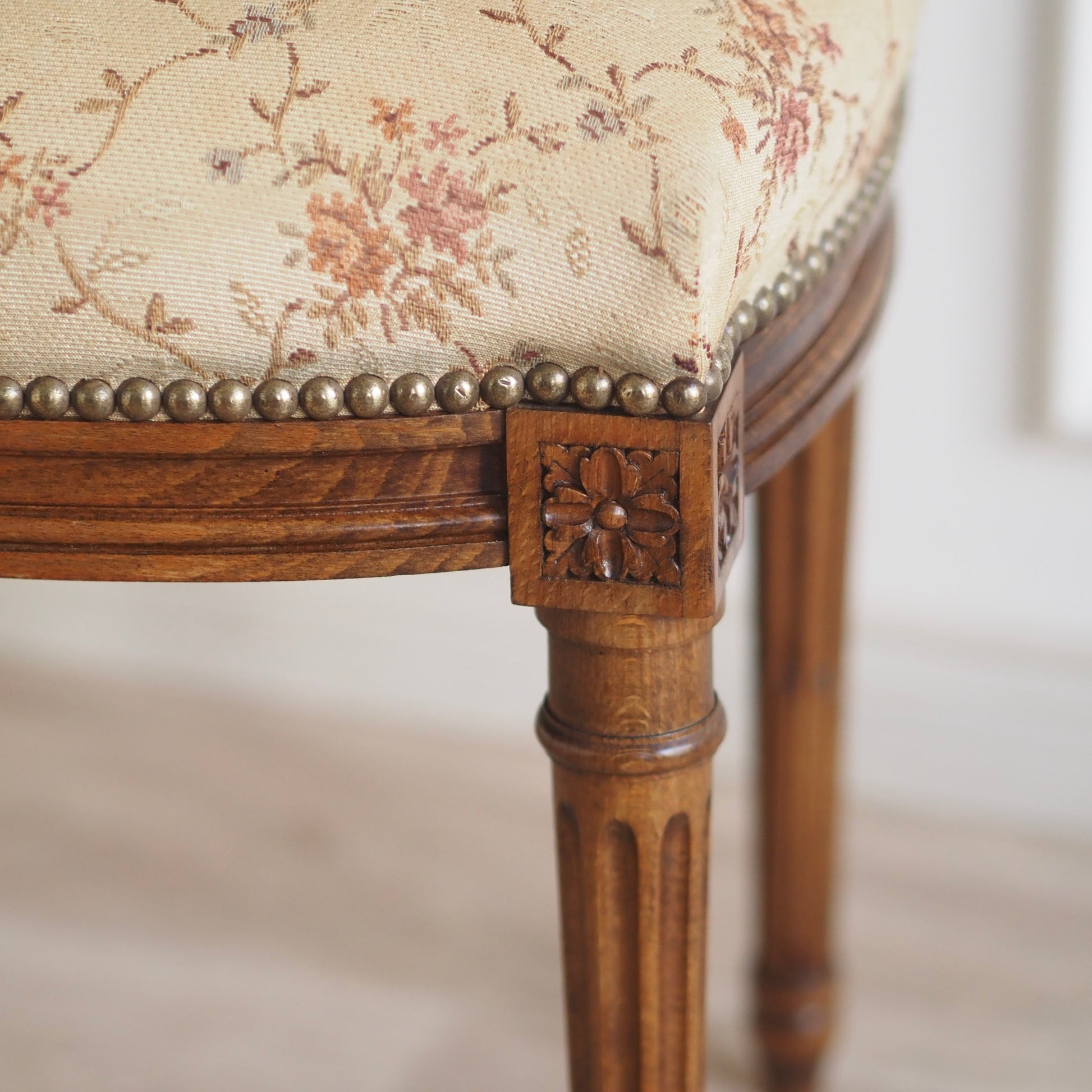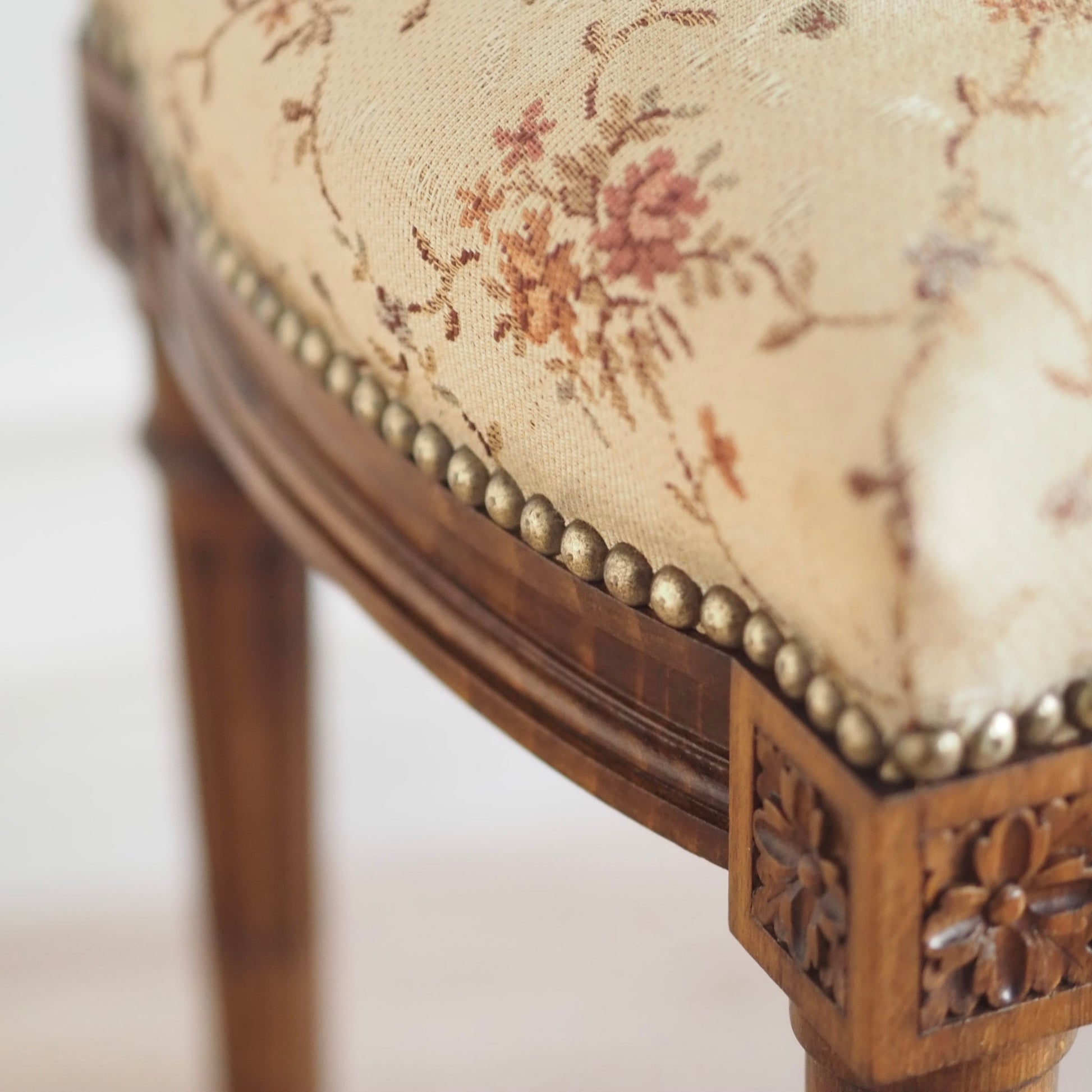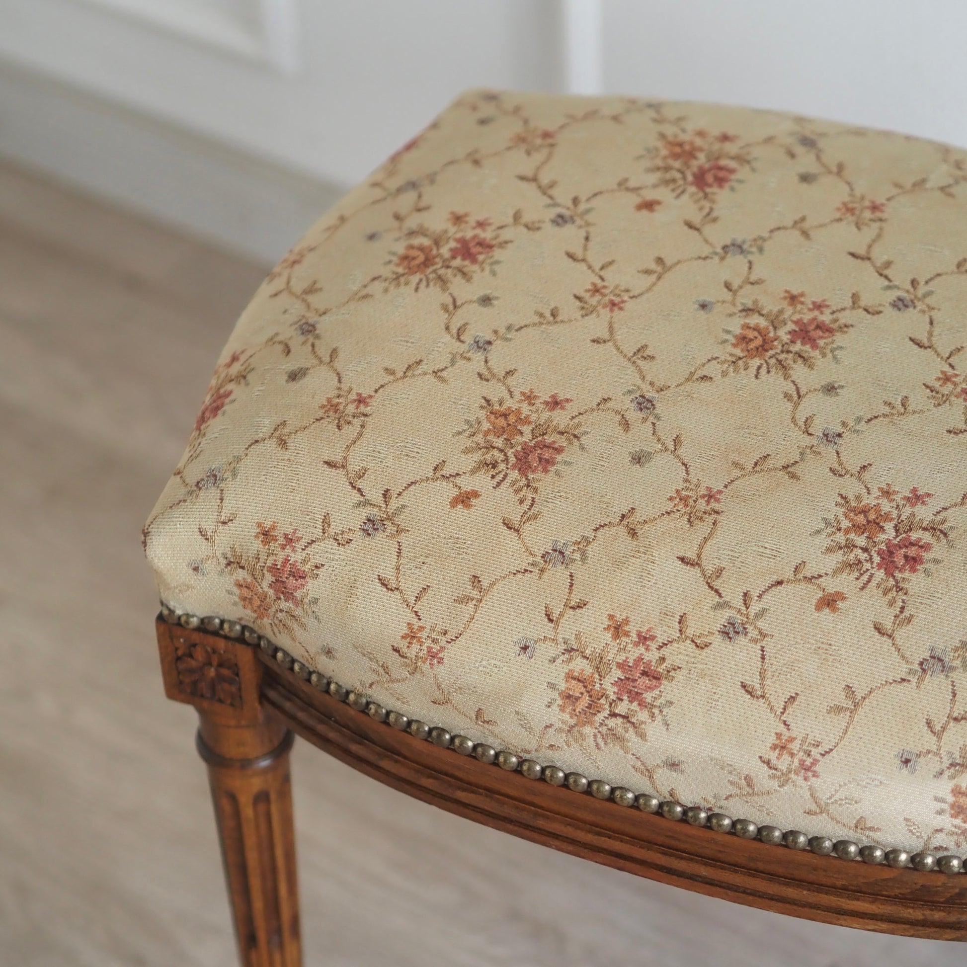 Ein feiner, antiker Polsterhocker im Stil Louis Seize – mit zierlich geriffeltem Gestell, floraler Schnitzerei an den Eckblöcken und originalem Blütendekor auf champagnerfarbenem Stoff. Die leicht gewölbte Sitzfläche ist rundum mit Ziernägeln eingefasst und ruht auf vier konischen, kannelierten Beinen. Das zarte Blümchenmuster in Altrosa, Ocker und Flieder ist gut erhalten mit nur wenigen Spuren der Zeit. Der Gesamtzustand ist stabil und dekorativ.