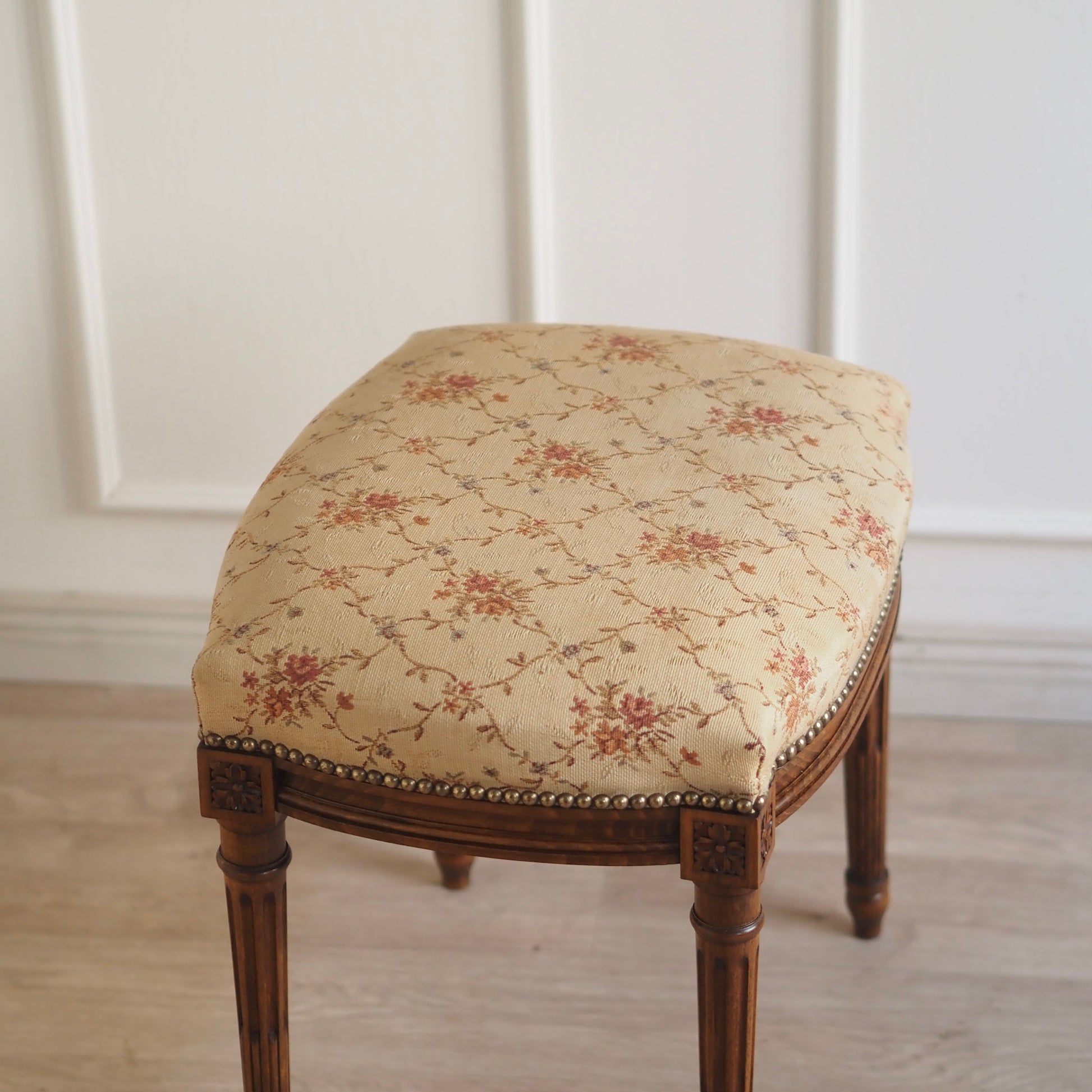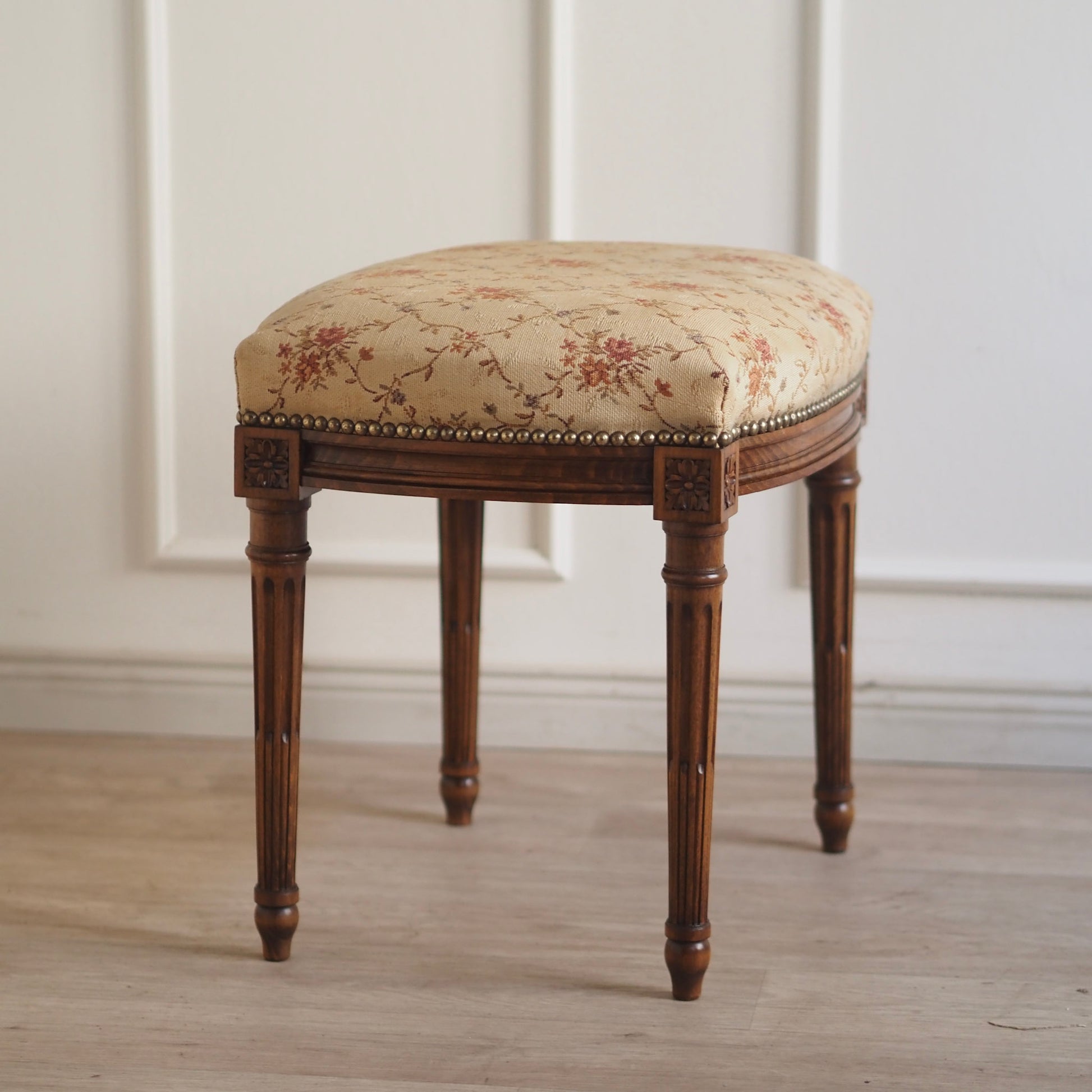 Frankreich - Ursprünglich als Schmink- und Frisierhocker oder Beistellsitz in eleganten Interieurs gedacht, lässt sich der Hocker heute vielseitig nutzen – als niedriger Sitz, dekorativer Akzent im Schlafzimmer, oder als Ergänzung zu einem Schminktisch oder Lesesessel für die Füße