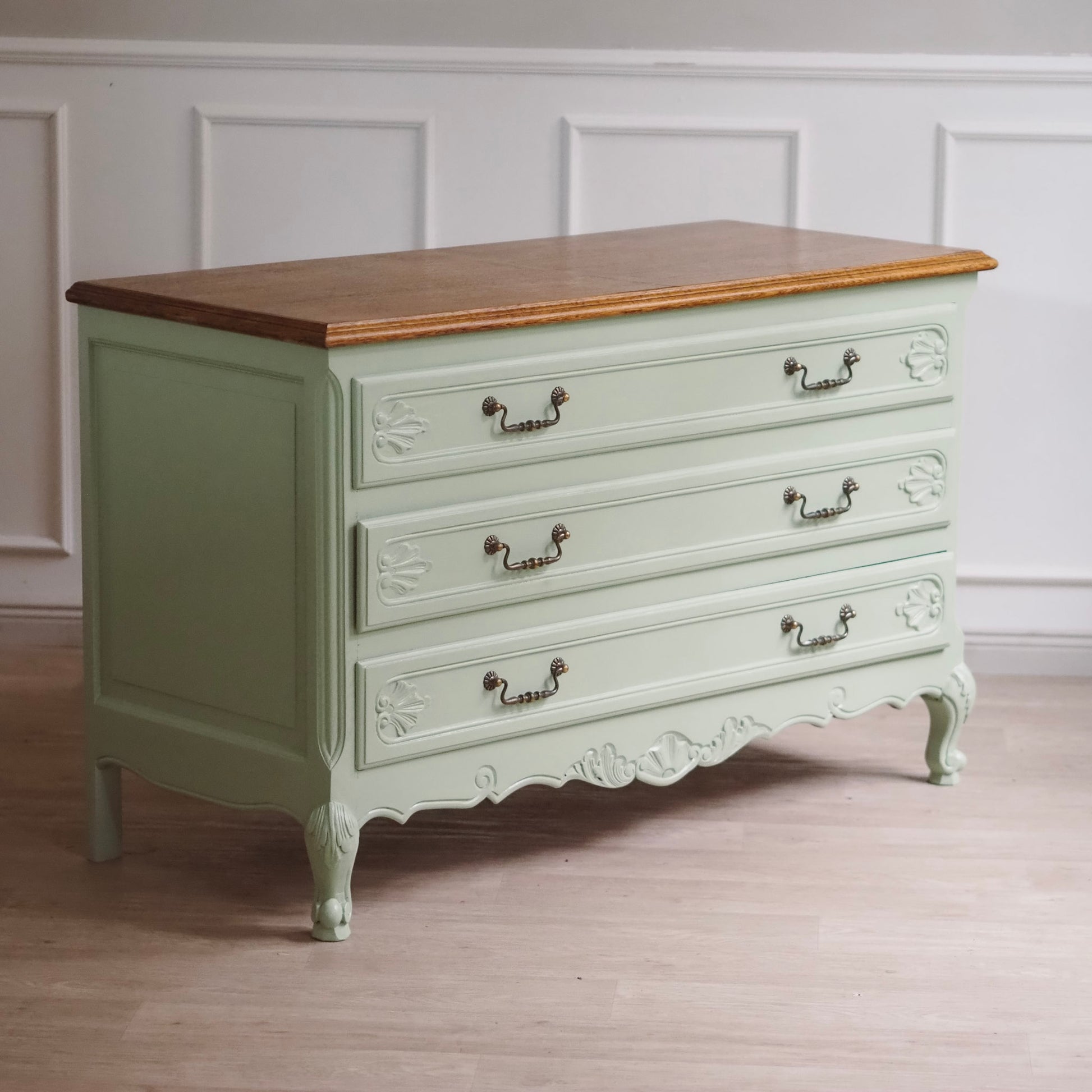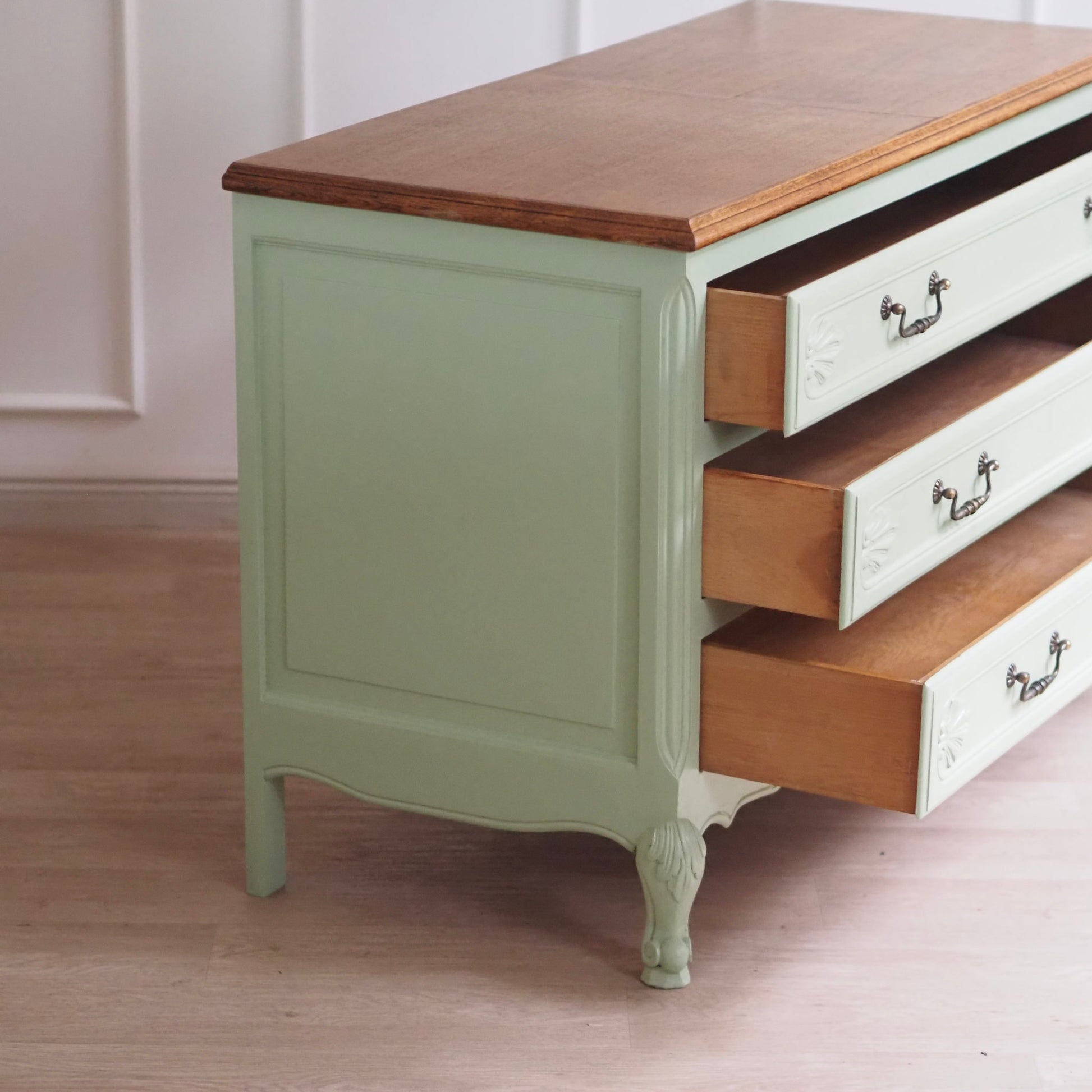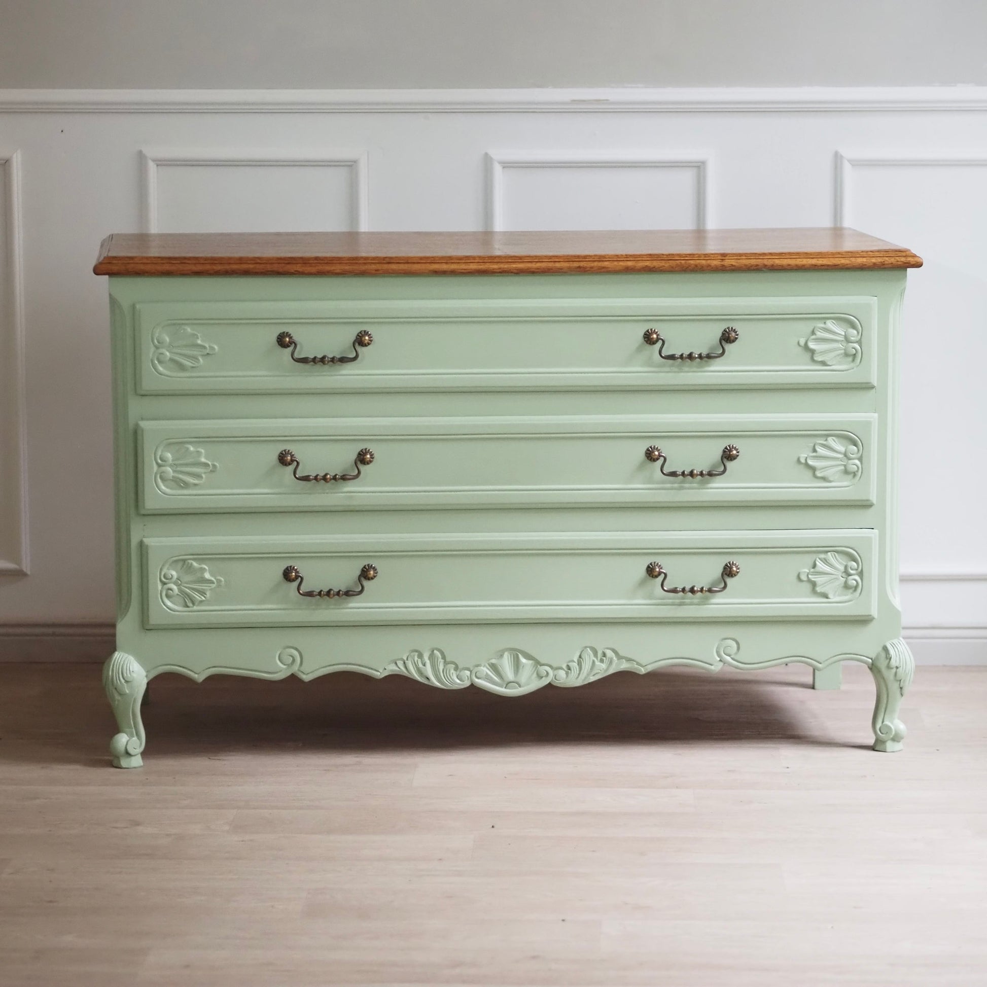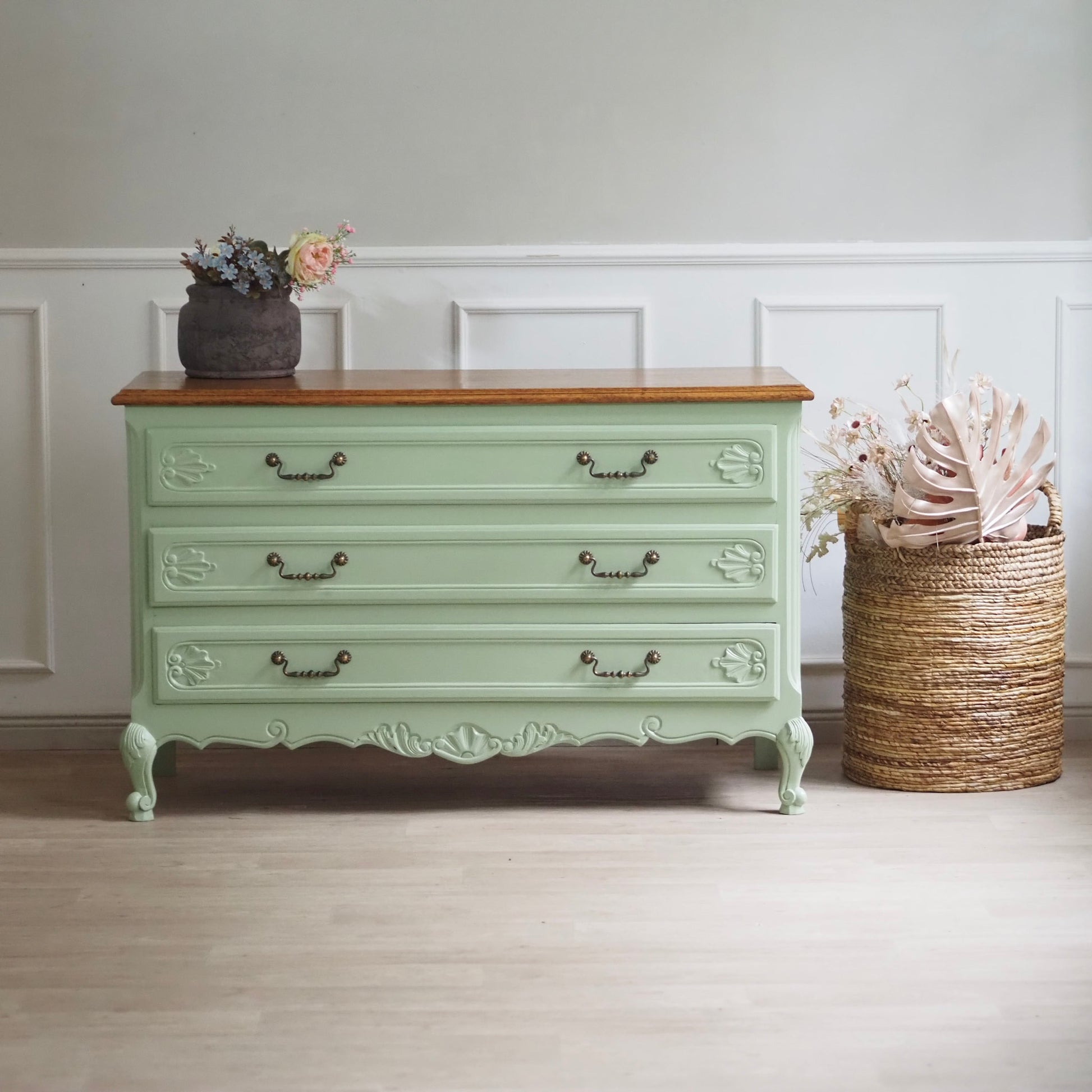 Diese charmante Landhaus Kommode wurde handmade umgestaltet. Sie besticht durch ihren sanften Farbton in mintgrün, die geschwungenen Linien und filigranen Schnitzereien. Die stilvolle Kombination aus sanftem Grünton und naturbelassener Holzplatte sorgt für einen eleganten und warmen Wohnstil. 3 breite Schubladen mit hängenden Messinggriffen sorgen für reichlich Stauraum. Ein stilvolles Möbelstück, welches sich nach Aufbereitung in einem neuen mintgrünen Farbgewand wiederfindet und sich ideal in moderne Landhauskombinationen einfügt.
