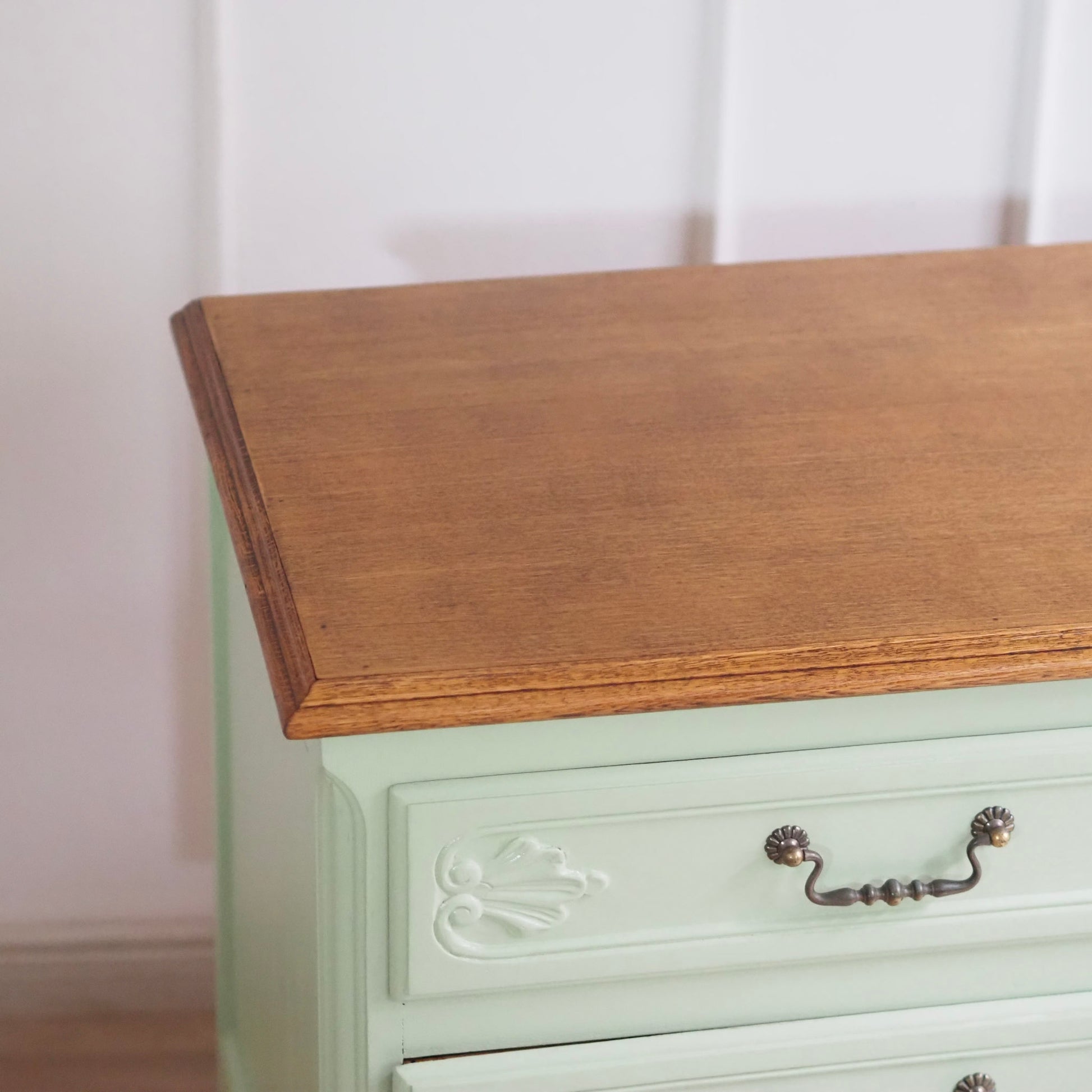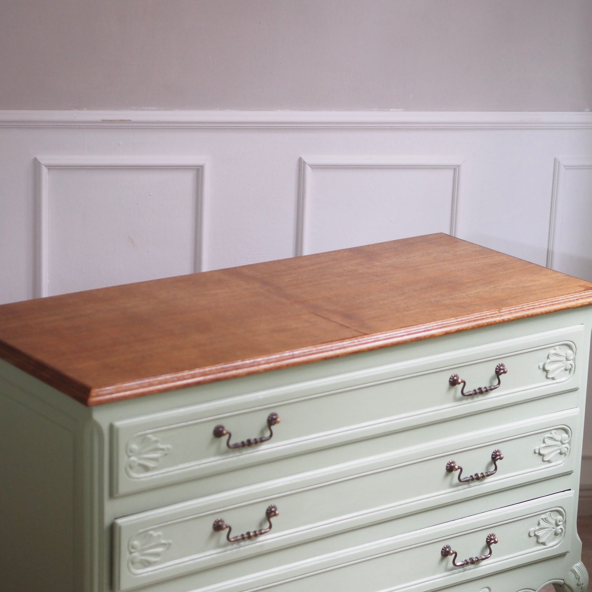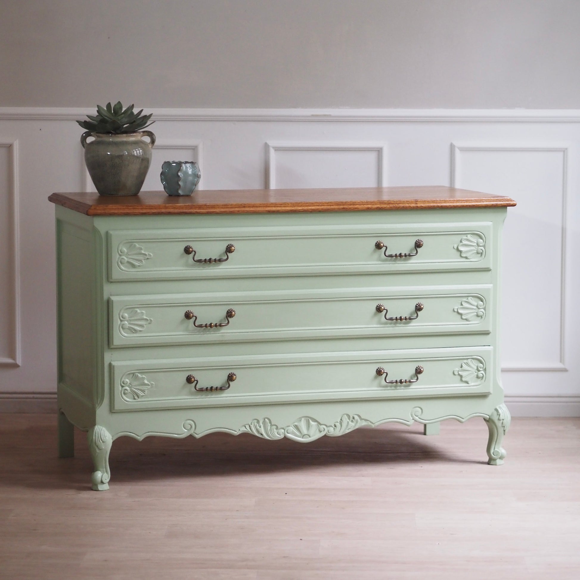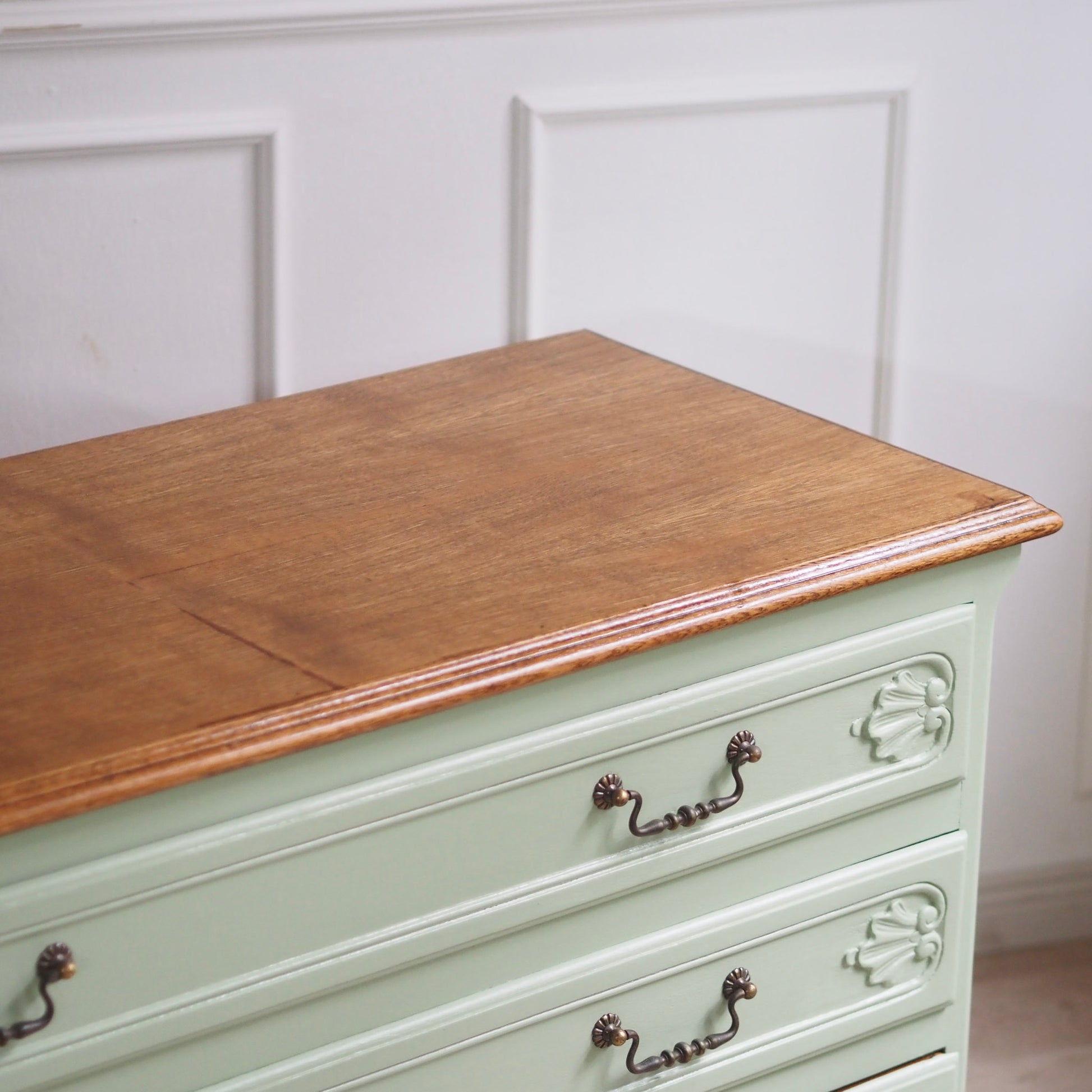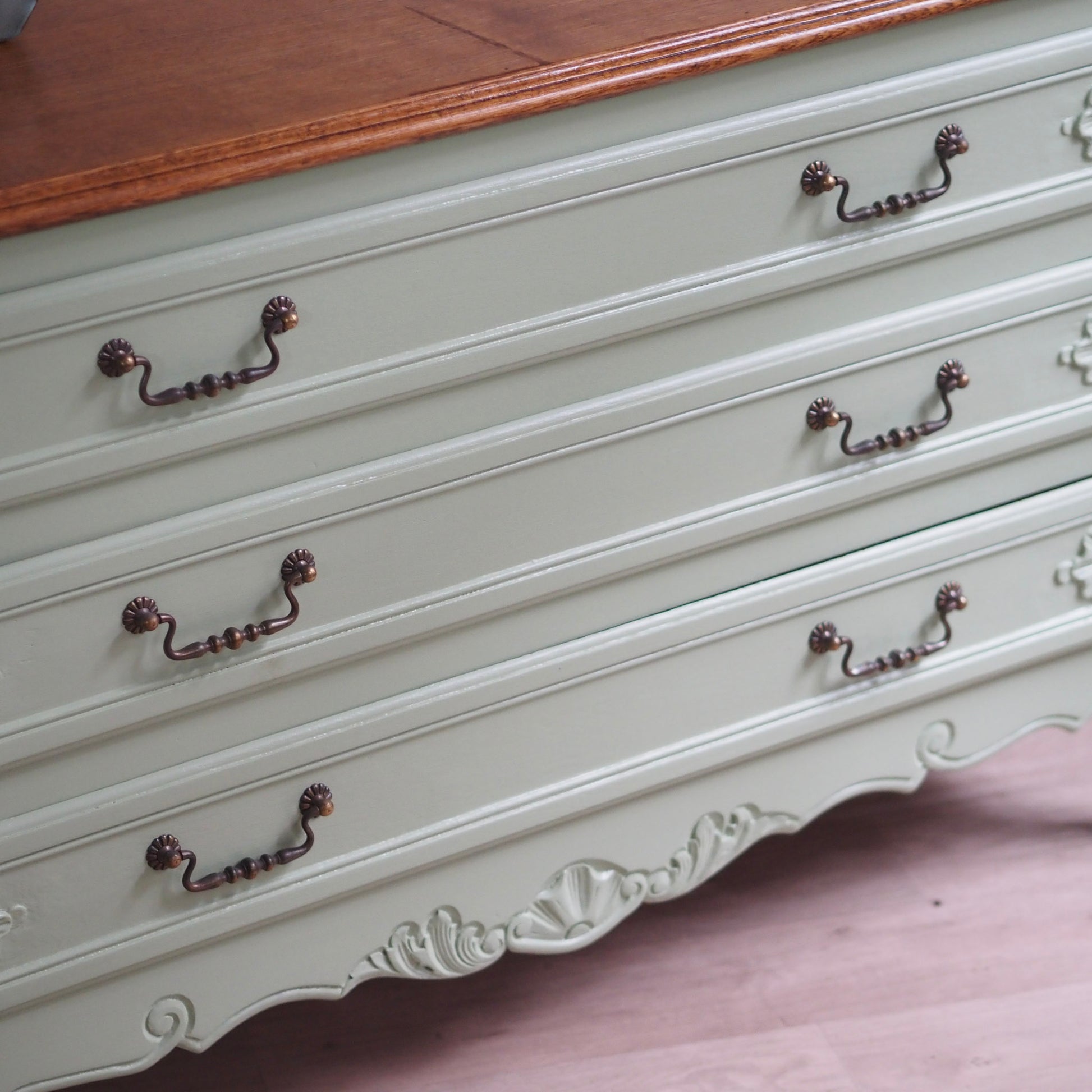 Diese charmante Landhaus Kommode wurde handmade umgestaltet. Sie besticht durch ihren sanften Farbton in mintgrün, die geschwungenen Linien und filigranen Schnitzereien. Die stilvolle Kombination aus sanftem Grünton und naturbelassener Holzplatte sorgt für einen eleganten und warmen Wohnstil. 3 breite Schubladen mit hängenden Messinggriffen sorgen für reichlich Stauraum. Ein stilvolles Möbelstück, welches sich nach Aufbereitung in einem neuen mintgrünen Farbgewand wiederfindet und sich ideal in moderne Landhauskombinationen einfügt.