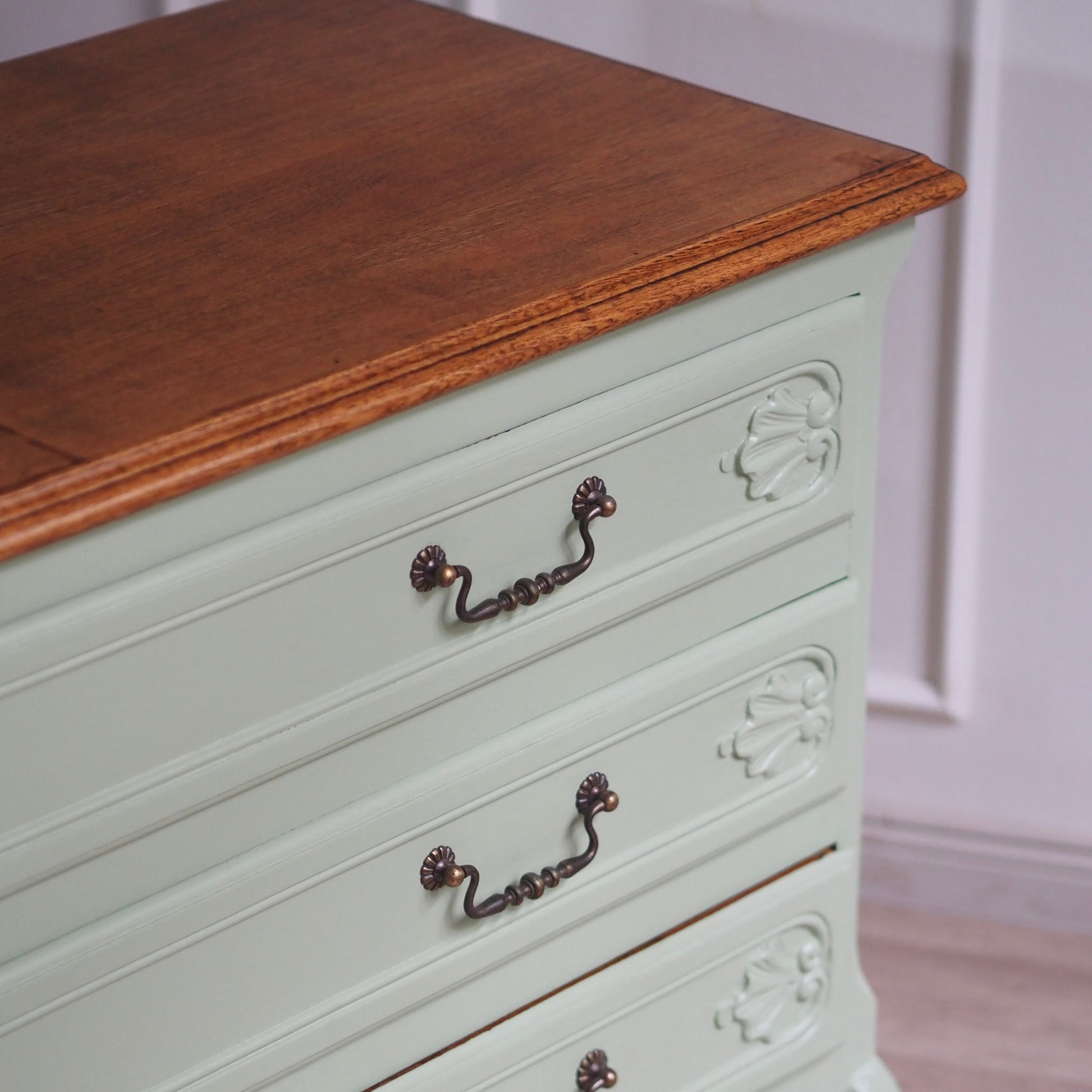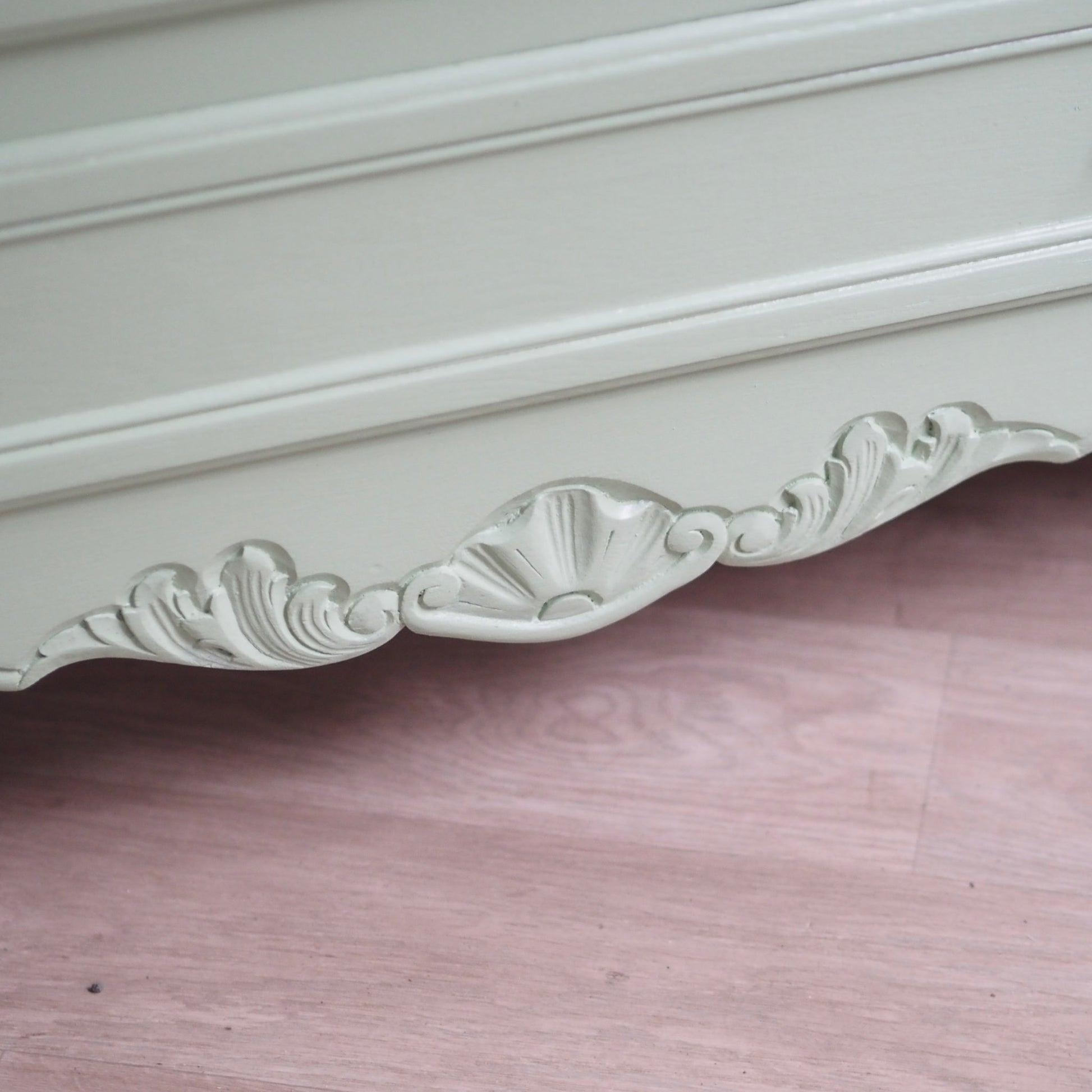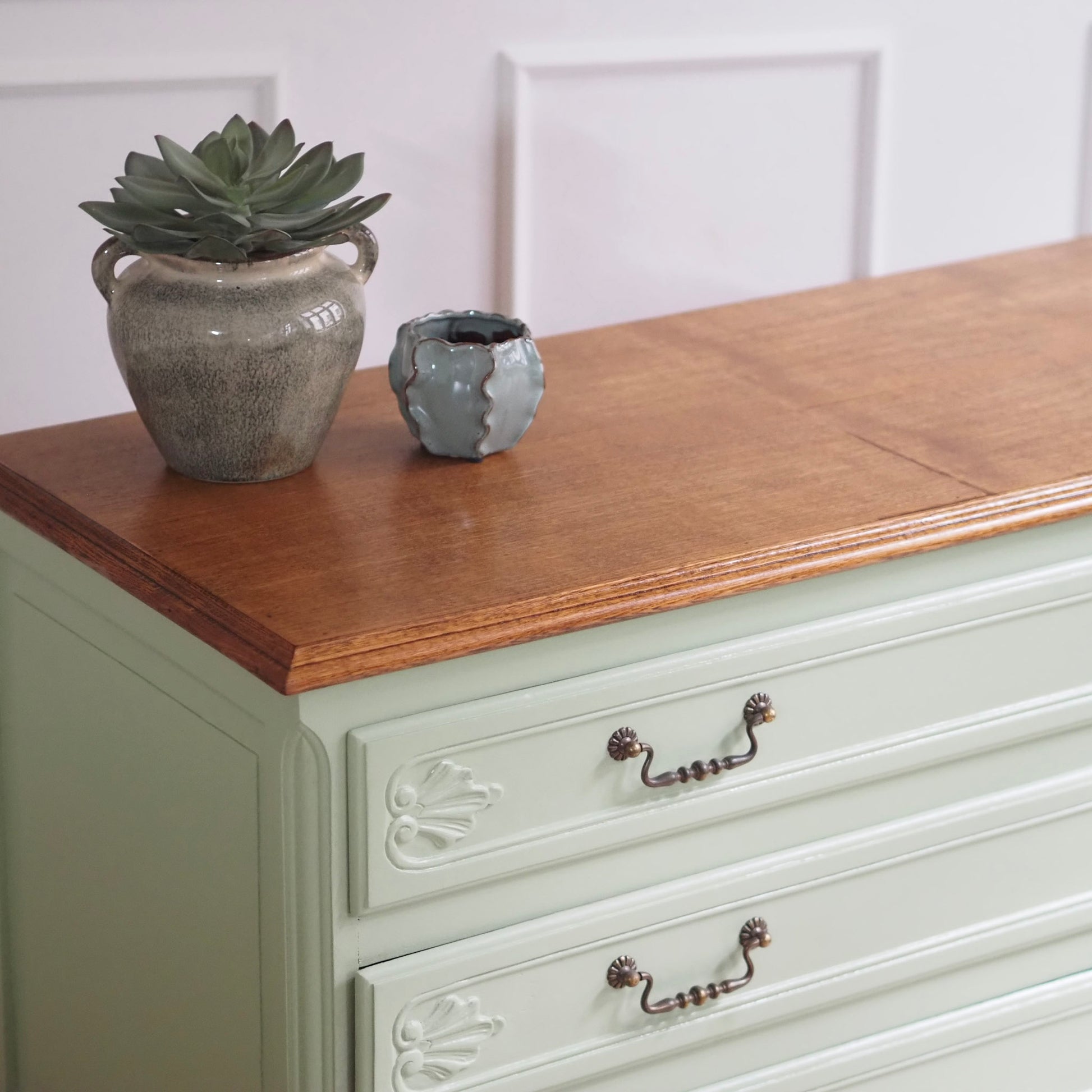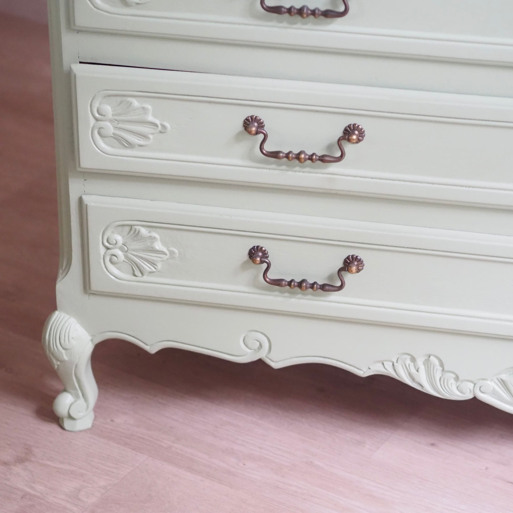 Diese charmante Landhaus Kommode wurde handmade umgestaltet. Sie besticht durch ihren sanften Farbton in mintgrün, die geschwungenen Linien und filigranen Schnitzereien. Die stilvolle Kombination aus sanftem Grünton und naturbelassener Holzplatte sorgt für einen eleganten und warmen Wohnstil. 3 breite Schubladen mit hängenden Messinggriffen sorgen für reichlich Stauraum. Ein stilvolles Möbelstück, welches sich nach Aufbereitung in einem neuen mintgrünen Farbgewand wiederfindet und sich ideal in moderne Landhauskombinationen einfügt.
