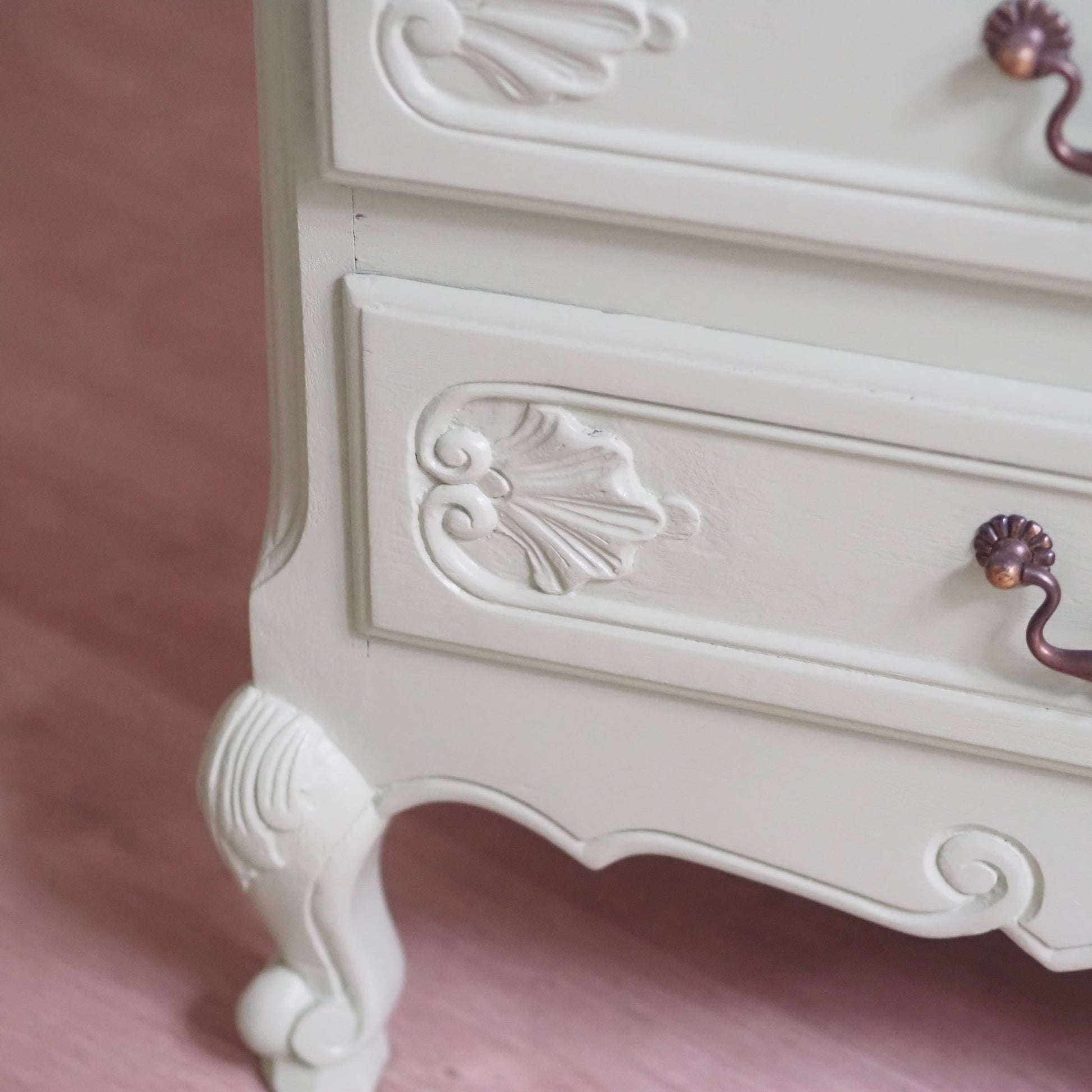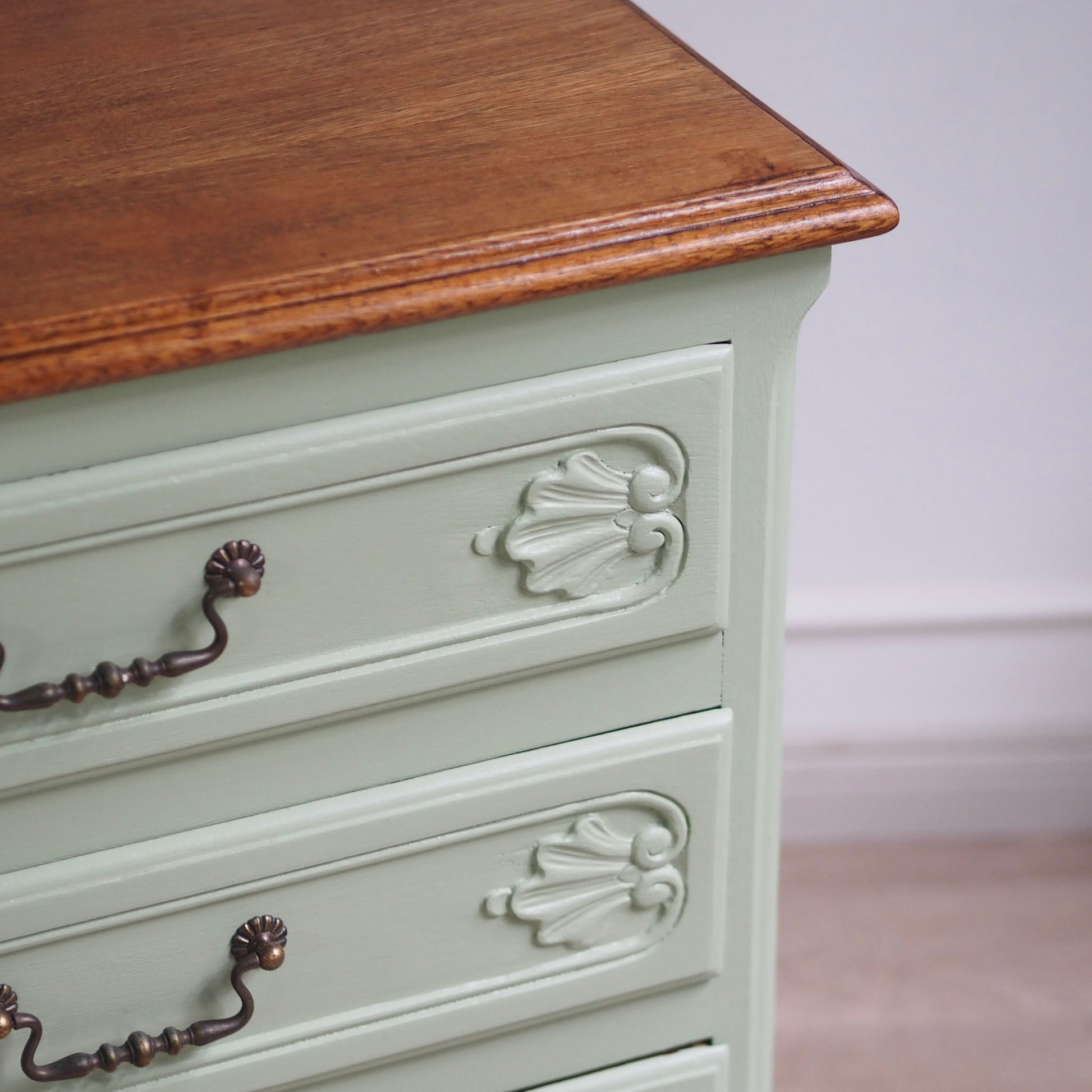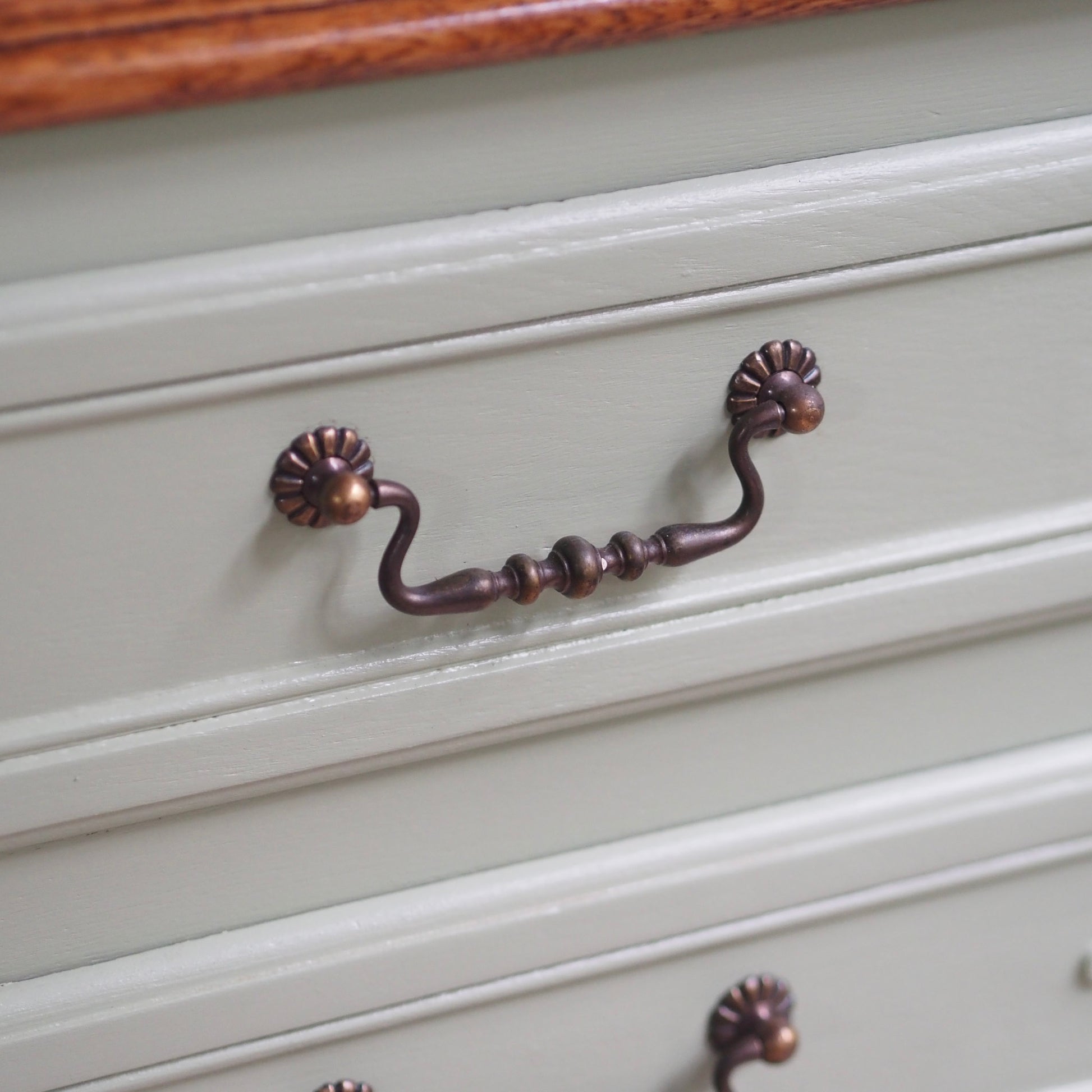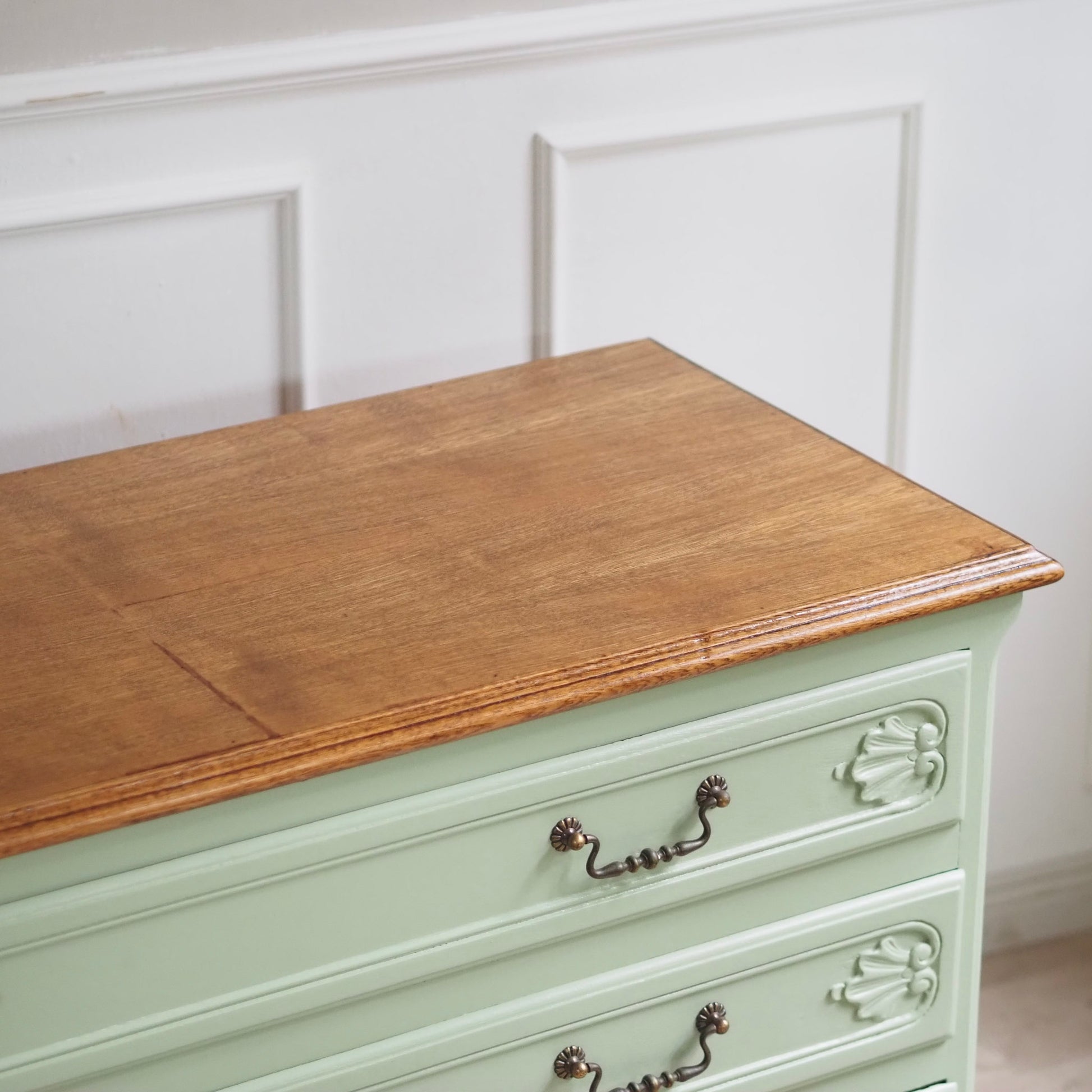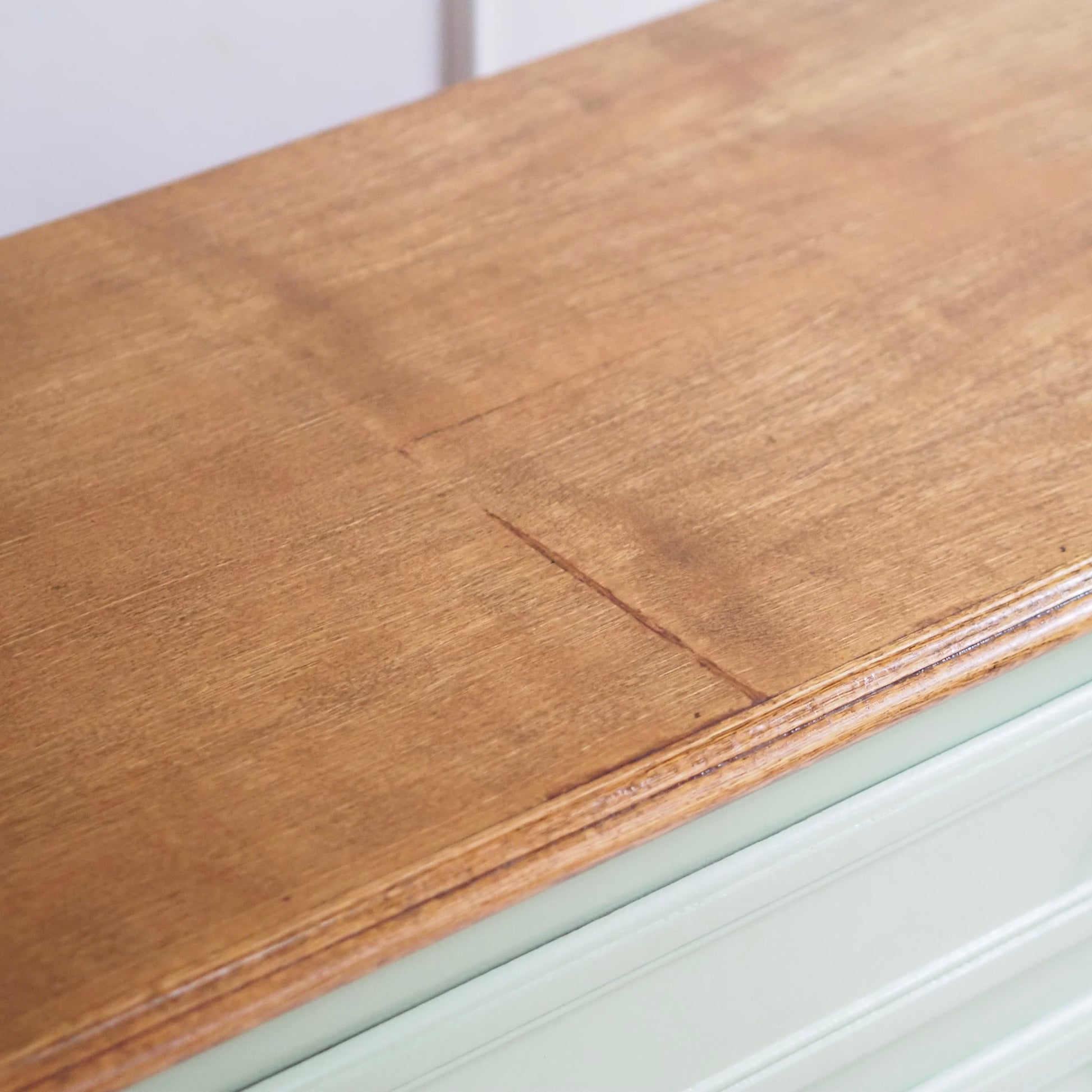 Diese charmante Landhaus Kommode wurde handmade umgestaltet. Sie besticht durch ihren sanften Farbton in mintgrün, die geschwungenen Linien und filigranen Schnitzereien. Die stilvolle Kombination aus sanftem Grünton und naturbelassener Holzplatte sorgt für einen eleganten und warmen Wohnstil. 3 breite Schubladen mit hängenden Messinggriffen sorgen für reichlich Stauraum. Ein stilvolles Möbelstück, welches sich nach Aufbereitung in einem neuen mintgrünen Farbgewand wiederfindet und sich ideal in moderne Landhauskombinationen einfügt.