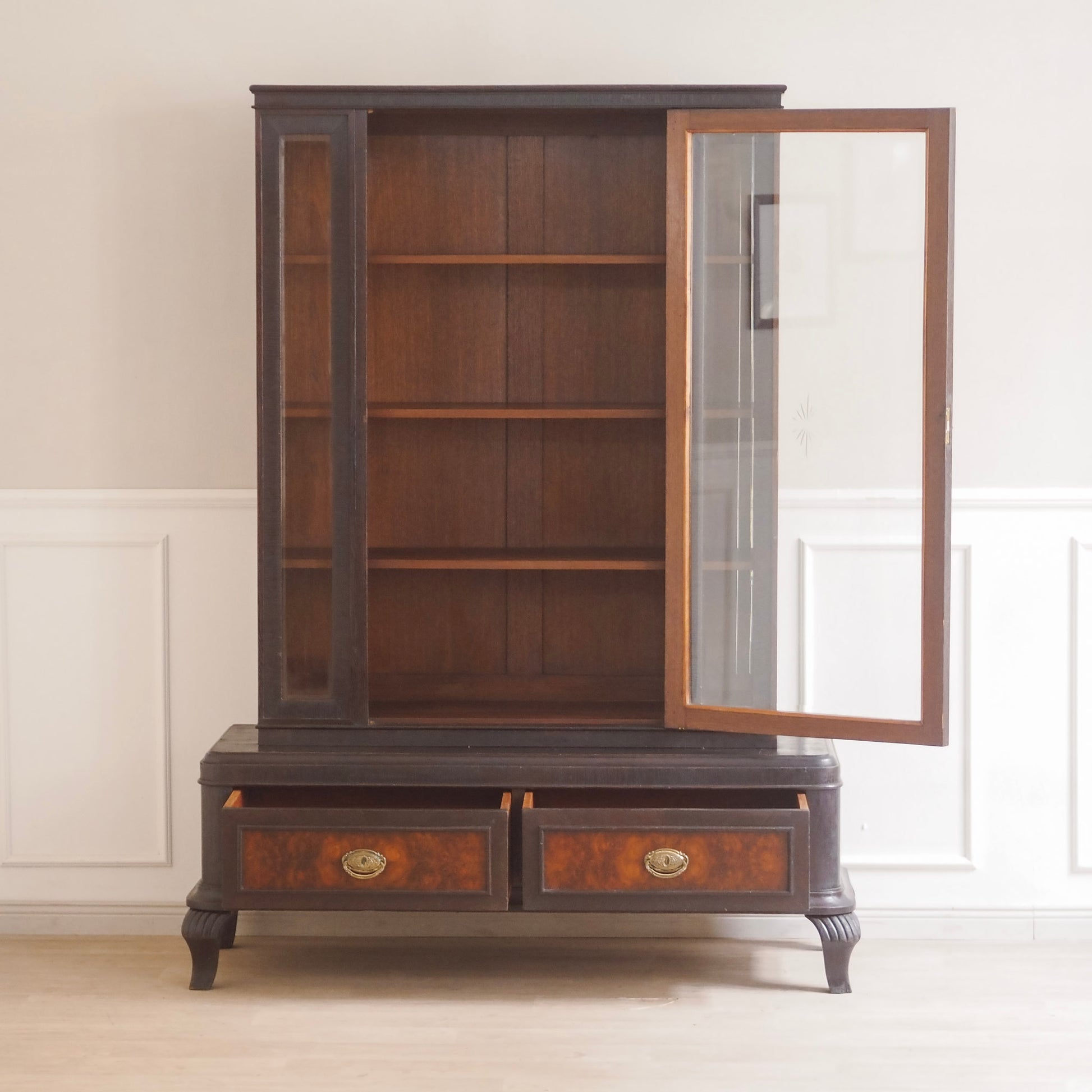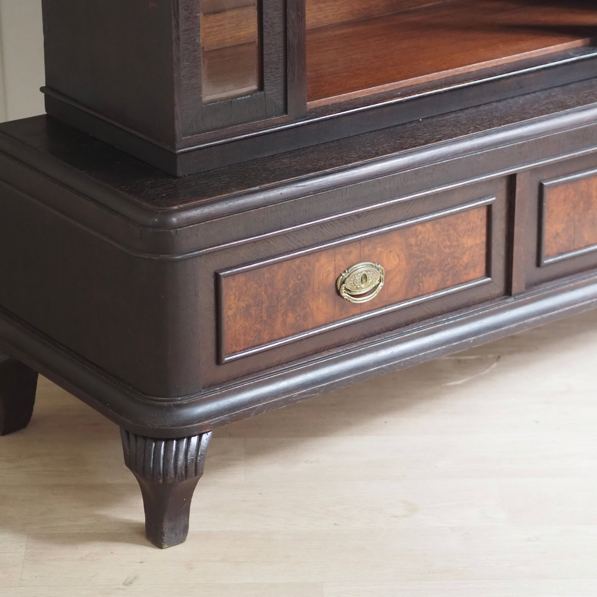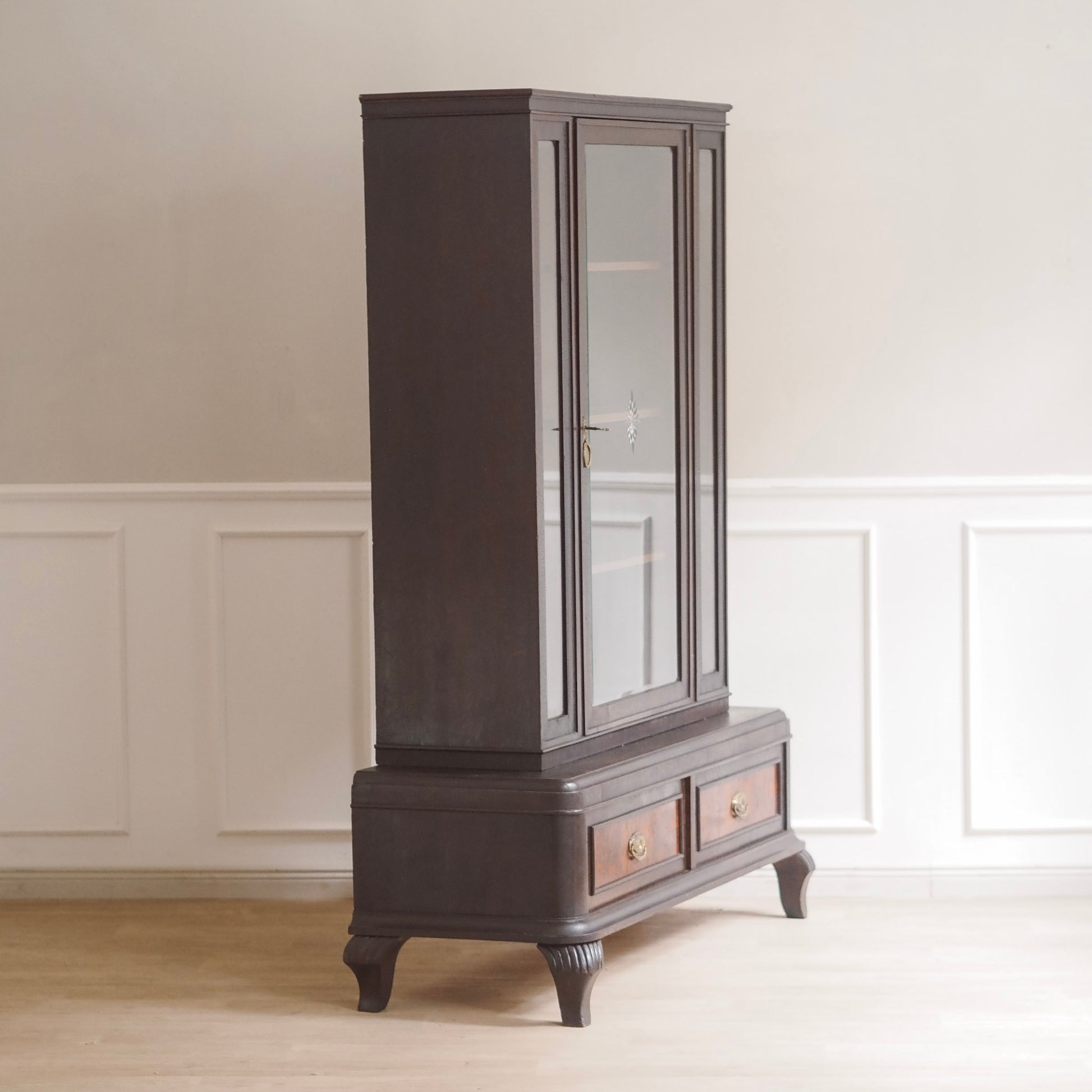 Diese beeindruckende Vitrine vereint klassische Eleganz mit stilvoller Handwerkskunst vergangener Jahrzehnte. Der dunkle Korpus wird durch feine Wurzelholzintarsien an den beiden unteren Schubladen kontrastreich akzentuiert. Die großzügige Glasfront mit originalem Facettenschliff – inklusive zartem Sternmotiv im mittleren Türbereich – ermöglicht eine stilvolle Präsentation von Geschirr, Sammlerstücken oder besonderen Dekoelementen.