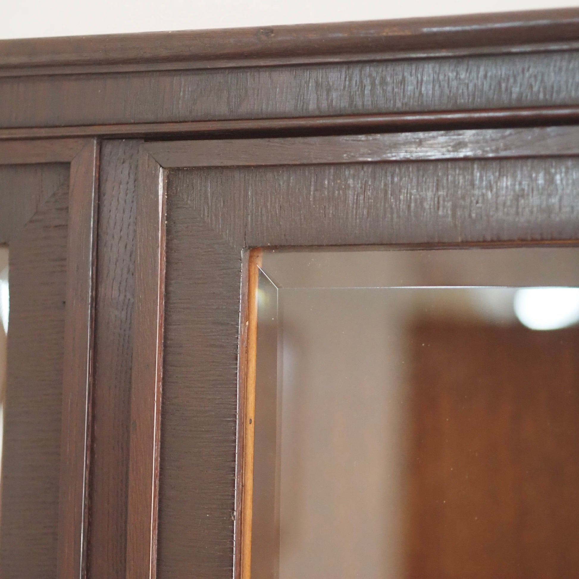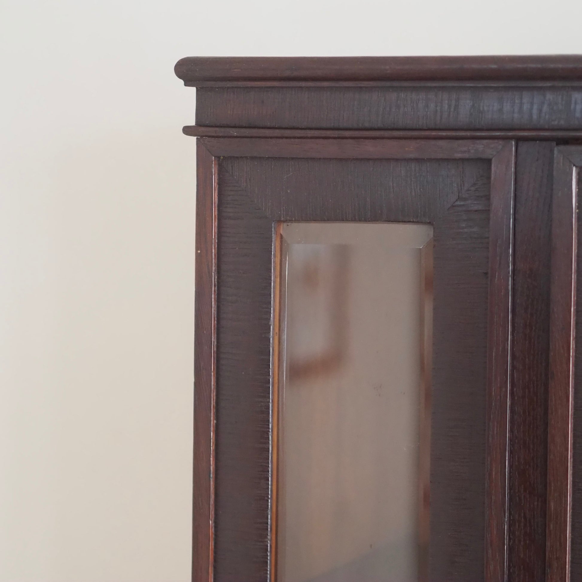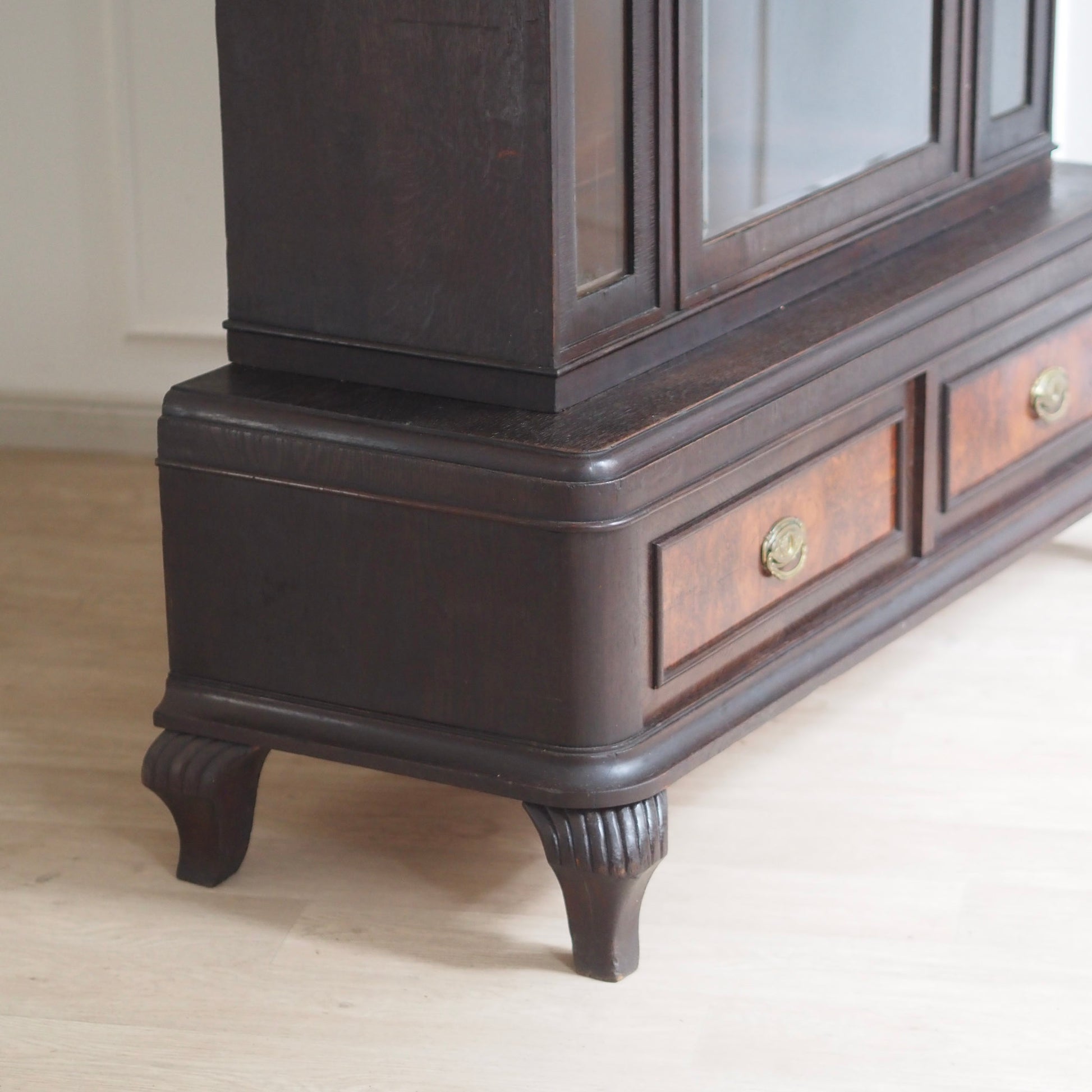 Diese beeindruckende Vitrine vereint klassische Eleganz mit stilvoller Handwerkskunst vergangener Jahrzehnte. Der dunkle Korpus wird durch feine Wurzelholzintarsien an den beiden unteren Schubladen kontrastreich akzentuiert. Die großzügige Glasfront mit originalem Facettenschliff – inklusive zartem Sternmotiv im mittleren Türbereich – ermöglicht eine stilvolle Präsentation von Geschirr, Sammlerstücken oder besonderen Dekoelementen.