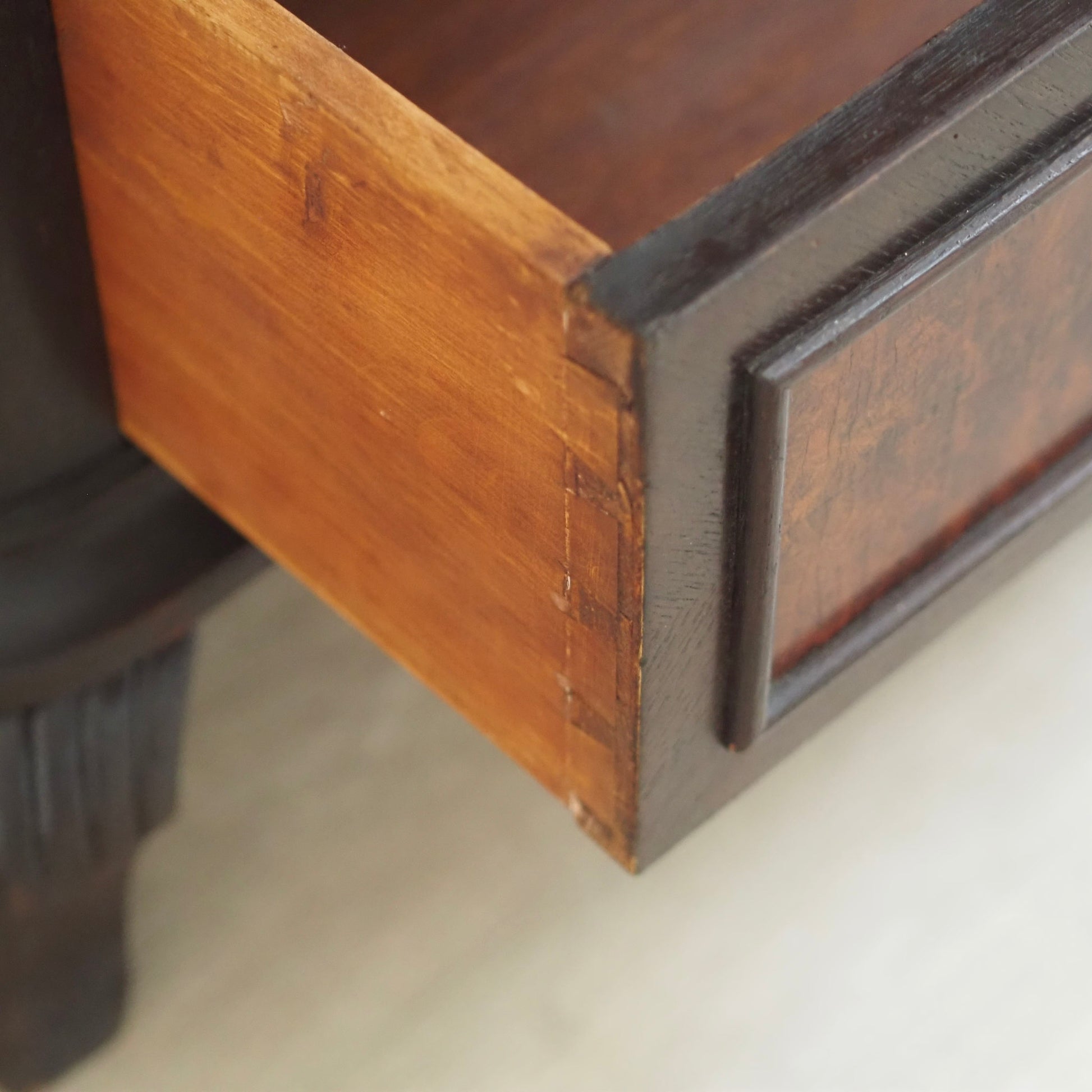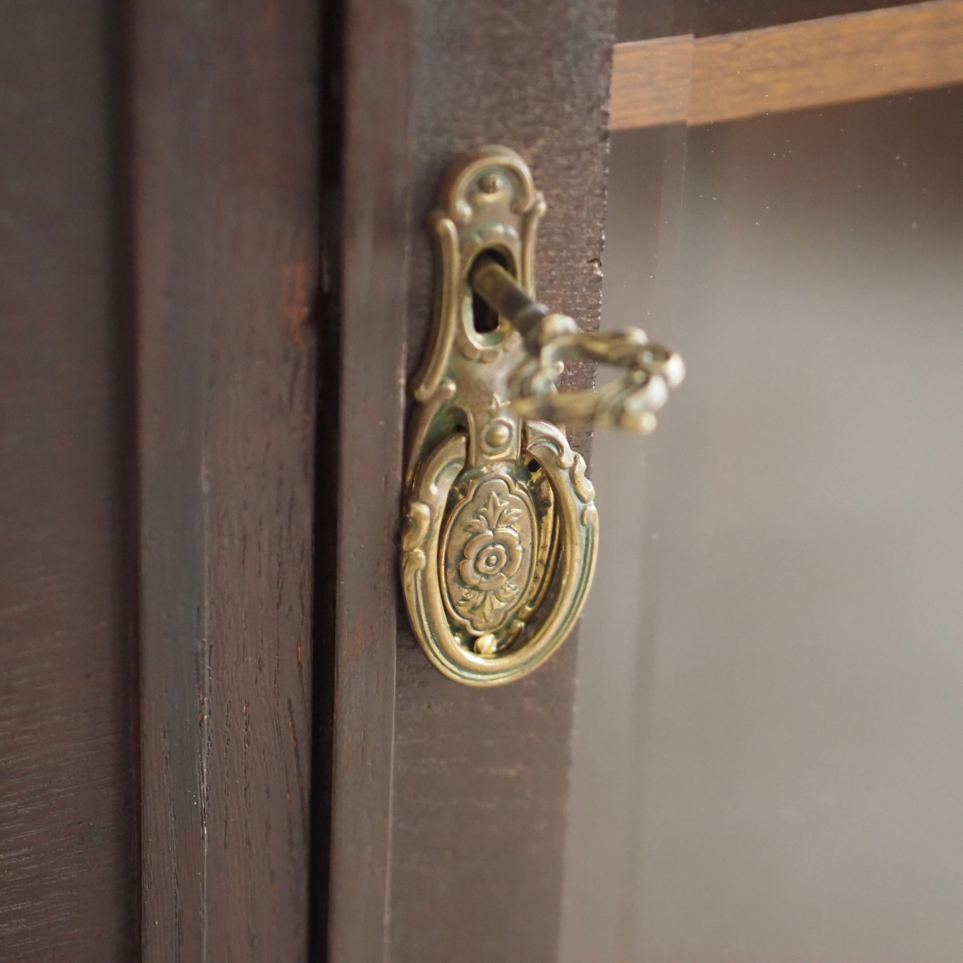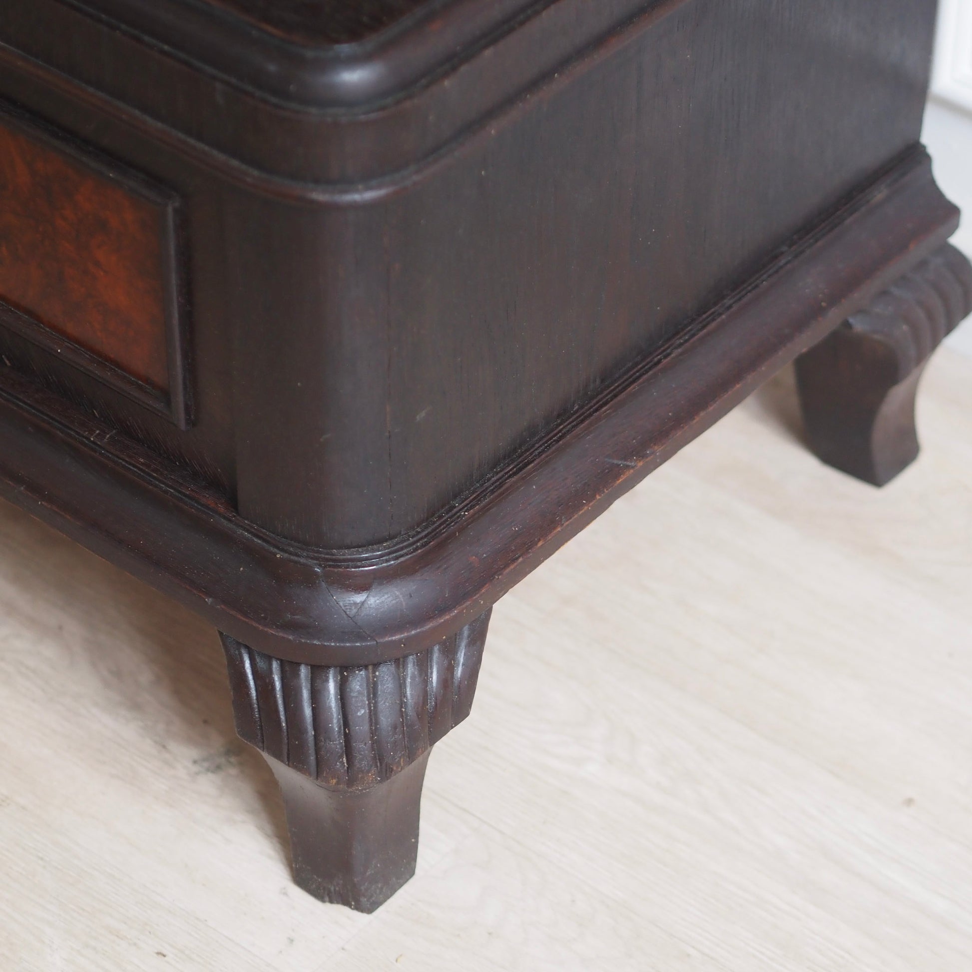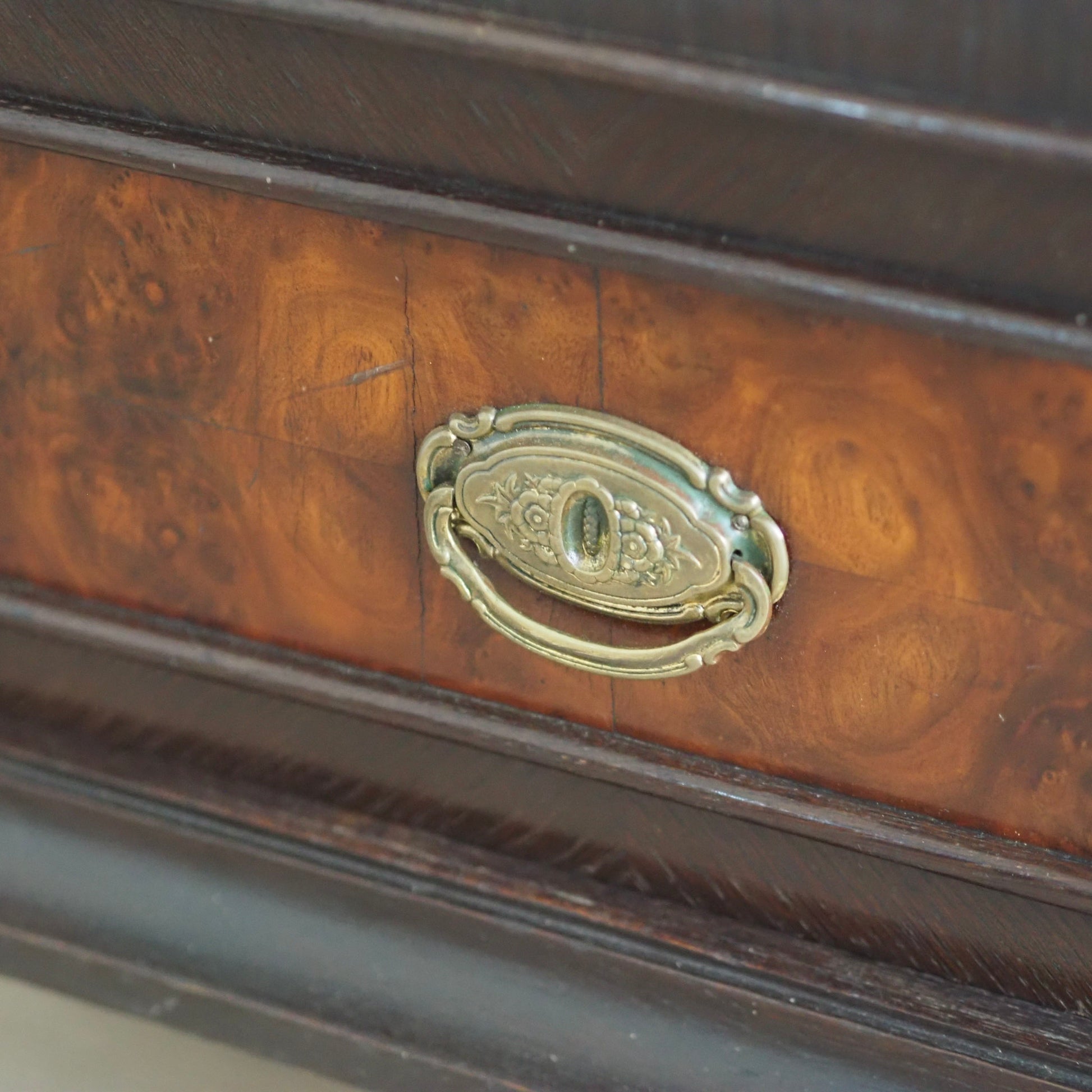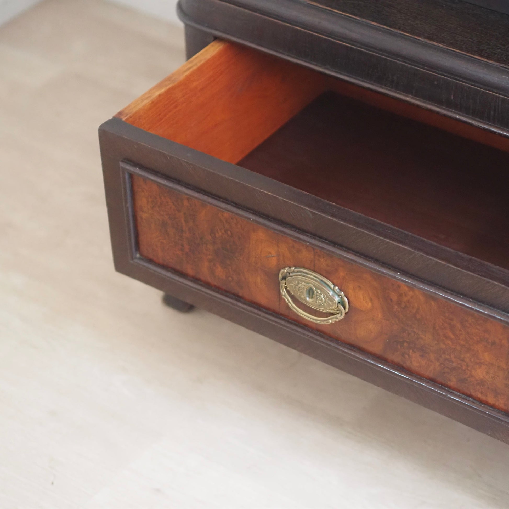 Material: Eichenholz, Nussbaumwurzelfurnier, Messing