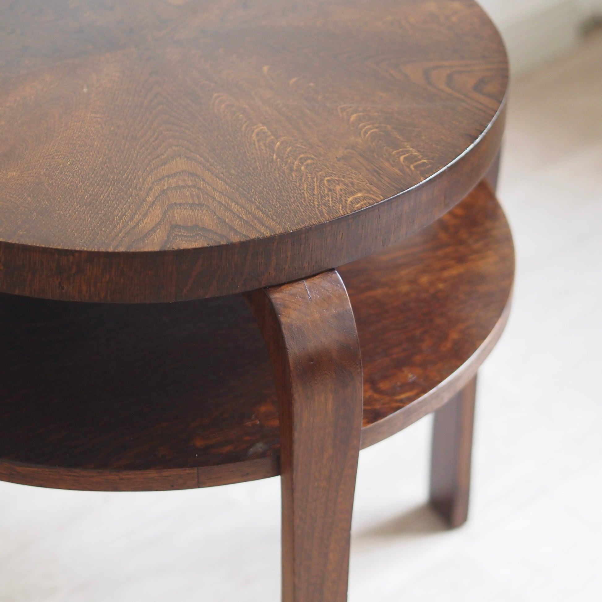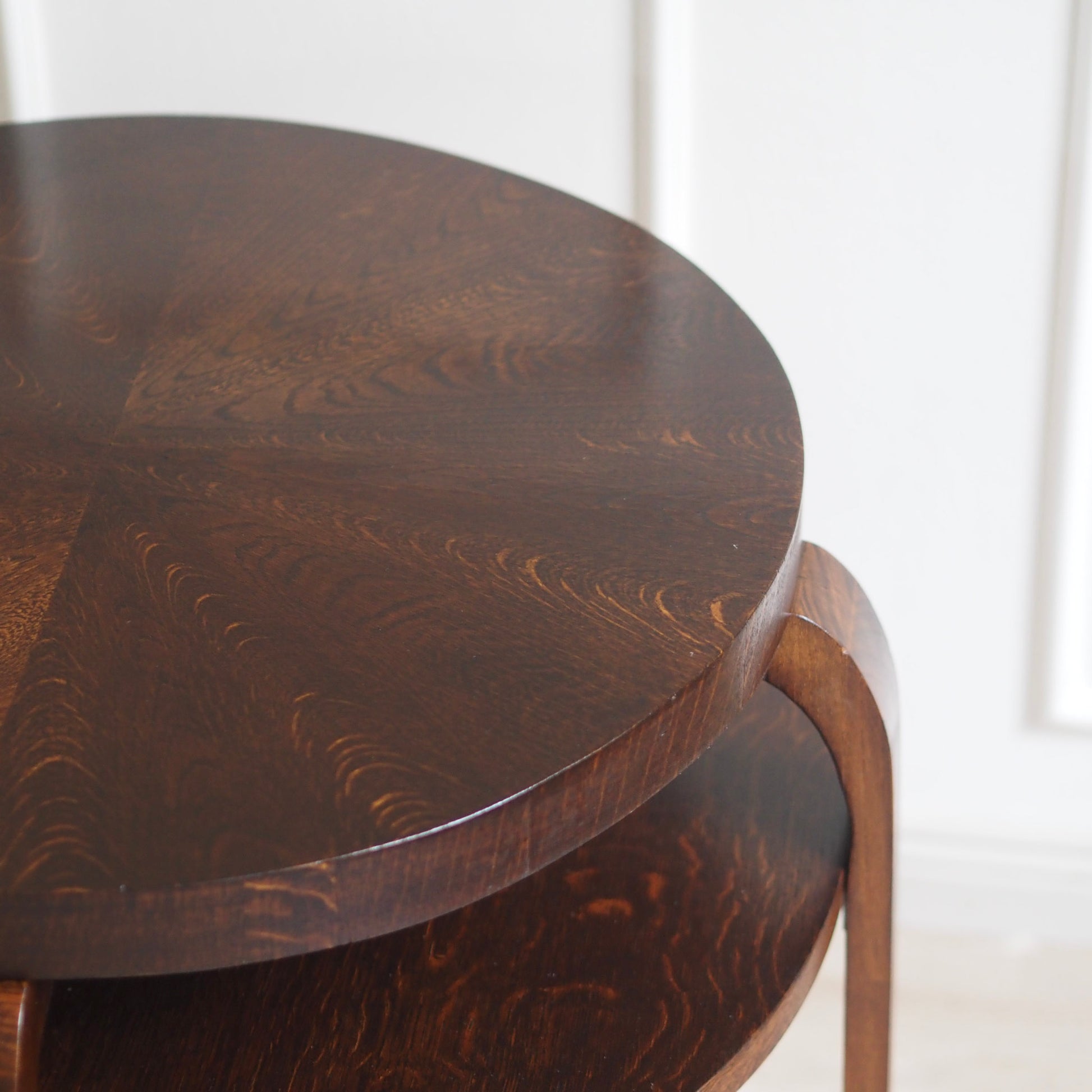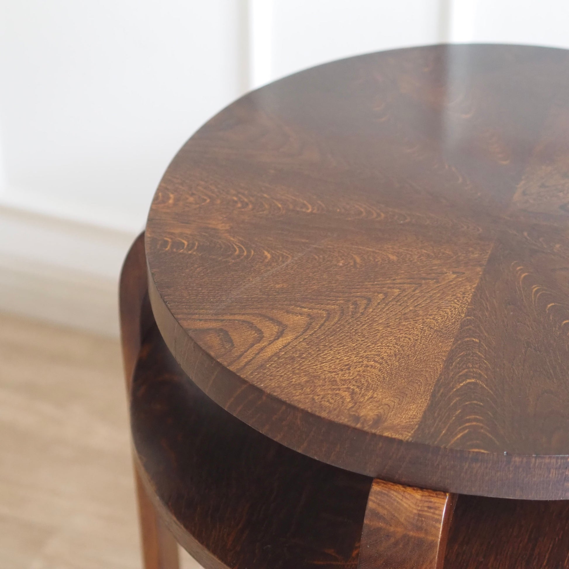 Dieser originale Beistelltisch aus den 1930er Jahren überzeugt durch seine elegante Silhouette und hochwertige Verarbeitung. Die runde Tischplatte ist mit einem edlen Eichenfurnier versehen, das in einem strahlenförmigen Muster verlegt wurde und dem Stück eine besonders dekorative Wirkung verleiht. Vier gebogene Beine aus Massivholz tragen den Sofatisch und unterstreichen die charakteristische Formensprache des Art-Déco. Die zusätzliche untere Ablage sorgt für praktische Funktionalität und eine ausgewogene Proportion.