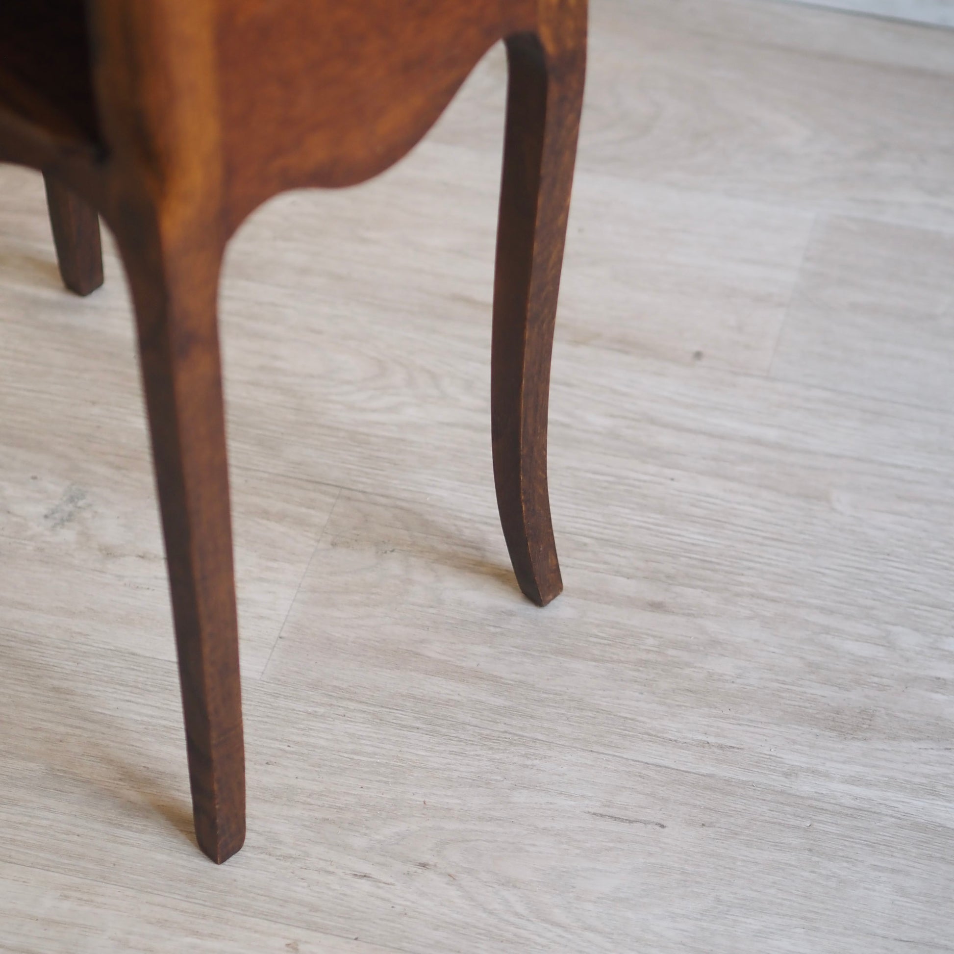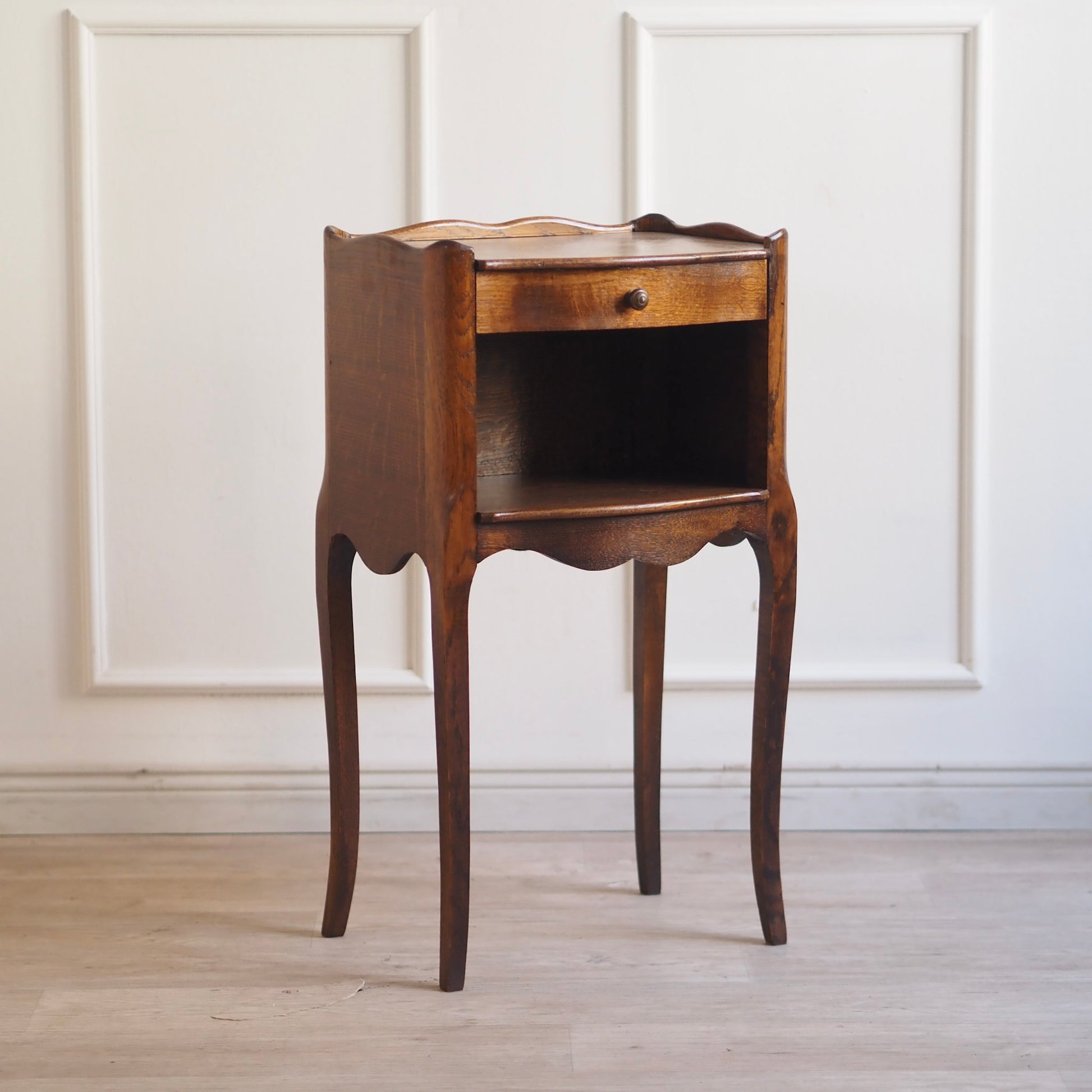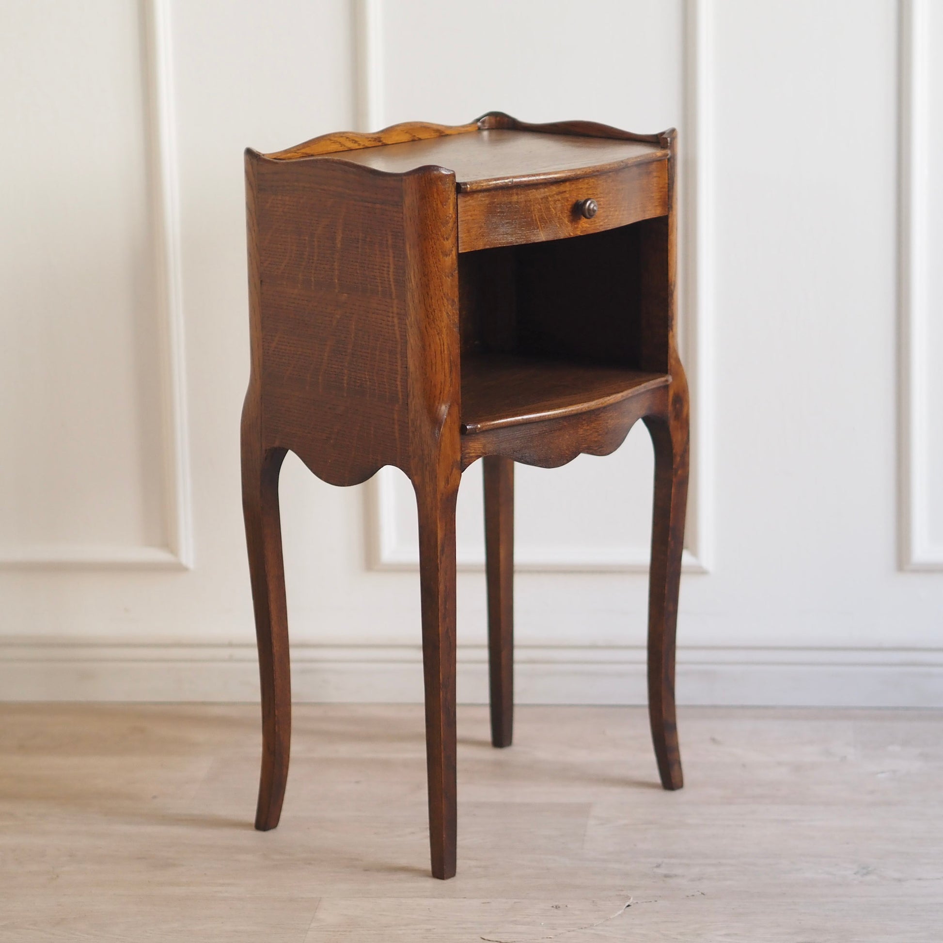 Französisches antikes Beistelltischchen oder Nachtschrank im französischen Stil – um 1930 gefertigt. Die geschwungene Formgebung mit zierlicher Galerie-Kante, elegantem Schwung an der Front sowie den leicht geschweiften Beinen verleiht dem Möbel ein leichtes und stilvolles Erscheinungsbild. Die Schublade läuft leicht und bietet gemeinsam mit dem offenen Fach darunter praktischen Stauraum für kleine Gegenstände. Vielseitig einsetzbar - ob im Schlaf-, Wohnzimmer oder im Flur als Blickfang.