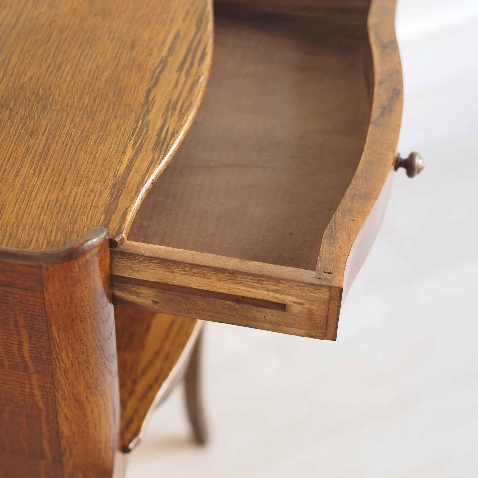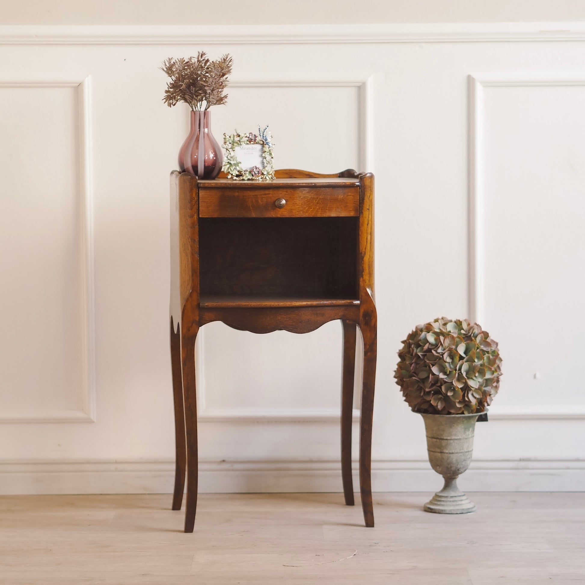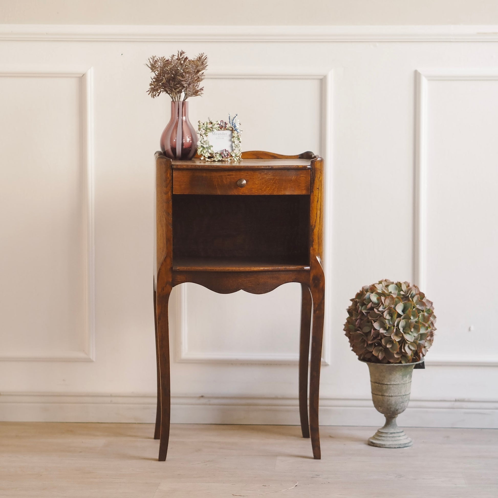 Französisches antikes Beistelltischchen oder Nachtschrank im französischen Stil – um 1930 gefertigt. Die geschwungene Formgebung mit zierlicher Galerie-Kante, elegantem Schwung an der Front sowie den leicht geschweiften Beinen verleiht dem Möbel ein leichtes und stilvolles Erscheinungsbild. Die Schublade läuft leicht und bietet gemeinsam mit dem offenen Fach darunter praktischen Stauraum für kleine Gegenstände. Vielseitig einsetzbar - ob im Schlaf-, Wohnzimmer oder im Flur als Blickfang.
