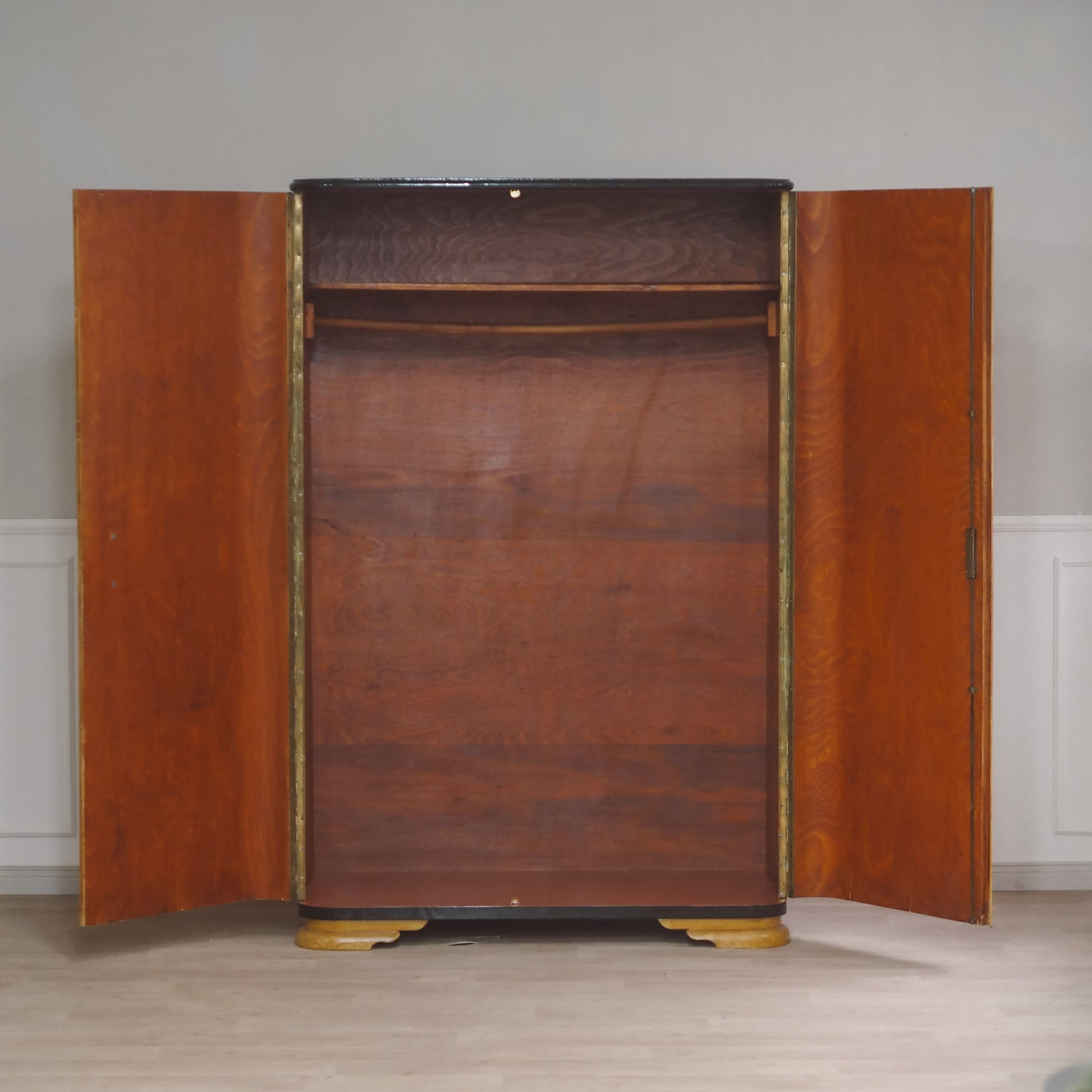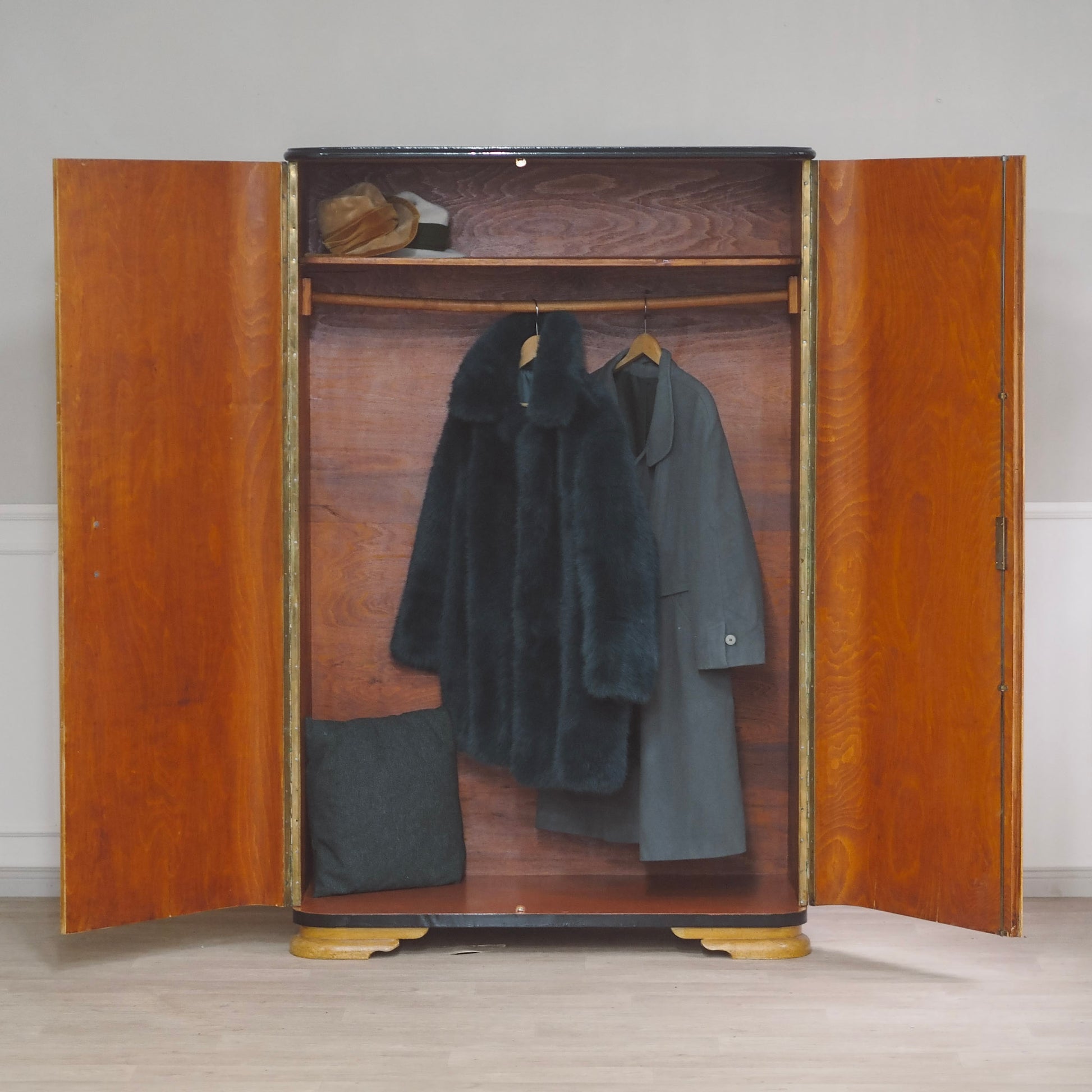 Der zweitürige Schrank besticht durch sein leicht glänzendes "Furnierbild" und die sanft geschwungene Formgebung - leicht gerundete Kanten und das minimalistische Design sowie die abgestuften Sockelfüße - spiegeln das zeittypische Design wider. Innen bietet er eine praktische Aufteilung mit Kleiderstange und Hutablage.