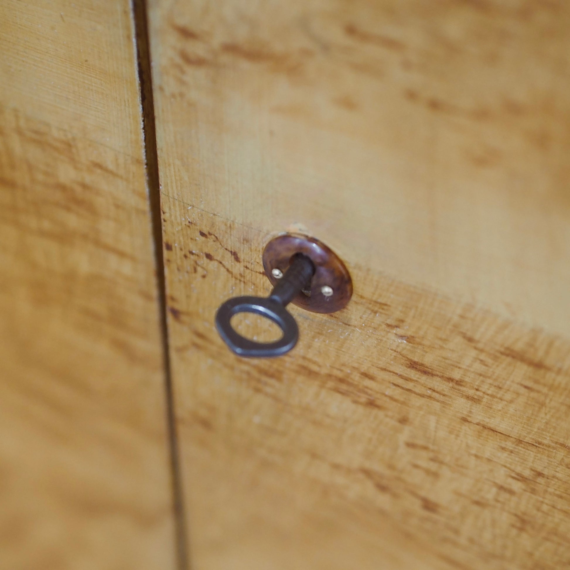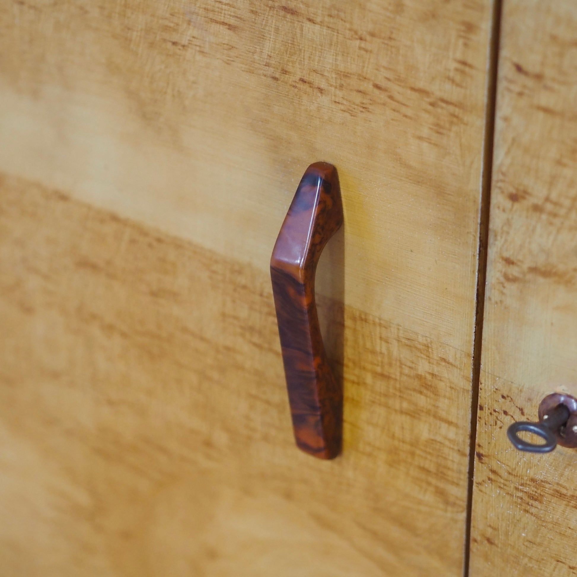 Material: Buche, Massives Weichholz mit handgemalter Maserung in Bierlasur-Technik, originaler Bakelit Griff und Beschlag