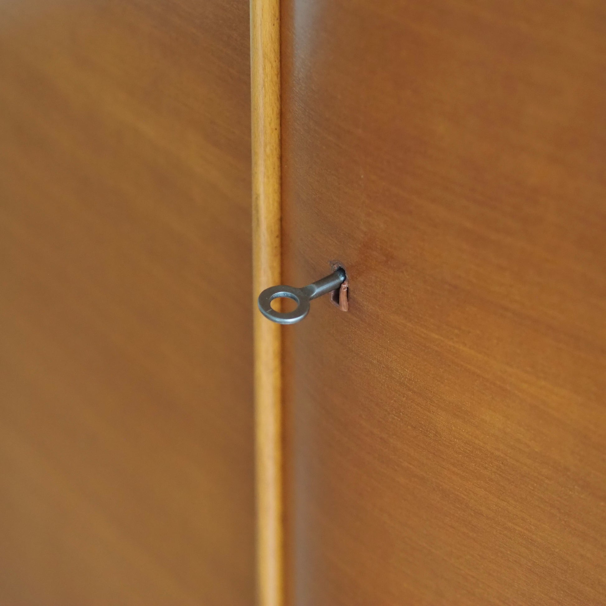 Der Schrank befindet sich in einem sehr guten Zustand. Es sind minimale, altersbedingte Gebrauchsspuren vorhanden, die den Vintage-Charakter des Möbels unterstreichen. Die Türen und Scharniere funktionieren einwandfrei, und das Innere ist sauber und gut erhalten.