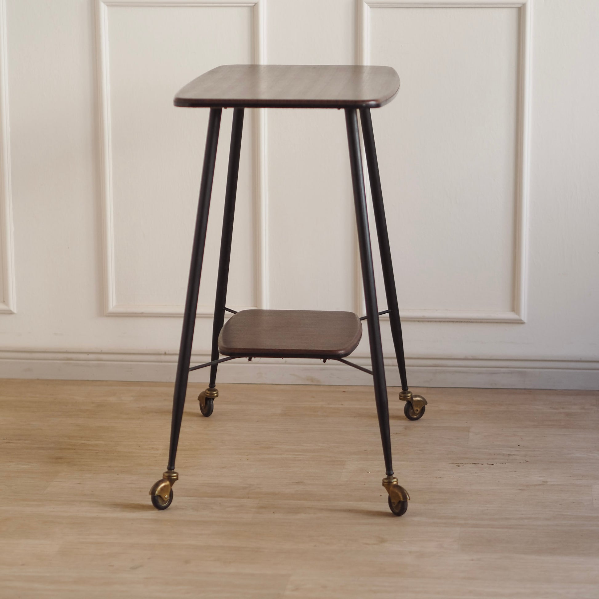 Stylischer Rolltisch/Trolley im typischen Design der 1950er Jahre, ideal als Beistelltisch oder Servierwagen. Das reduzierte Gestell aus schwarz lackiertem Metall mit abgespreizten Beinen trägt zwei folierte Ablageflächen in warmer Nussbaumoptik.