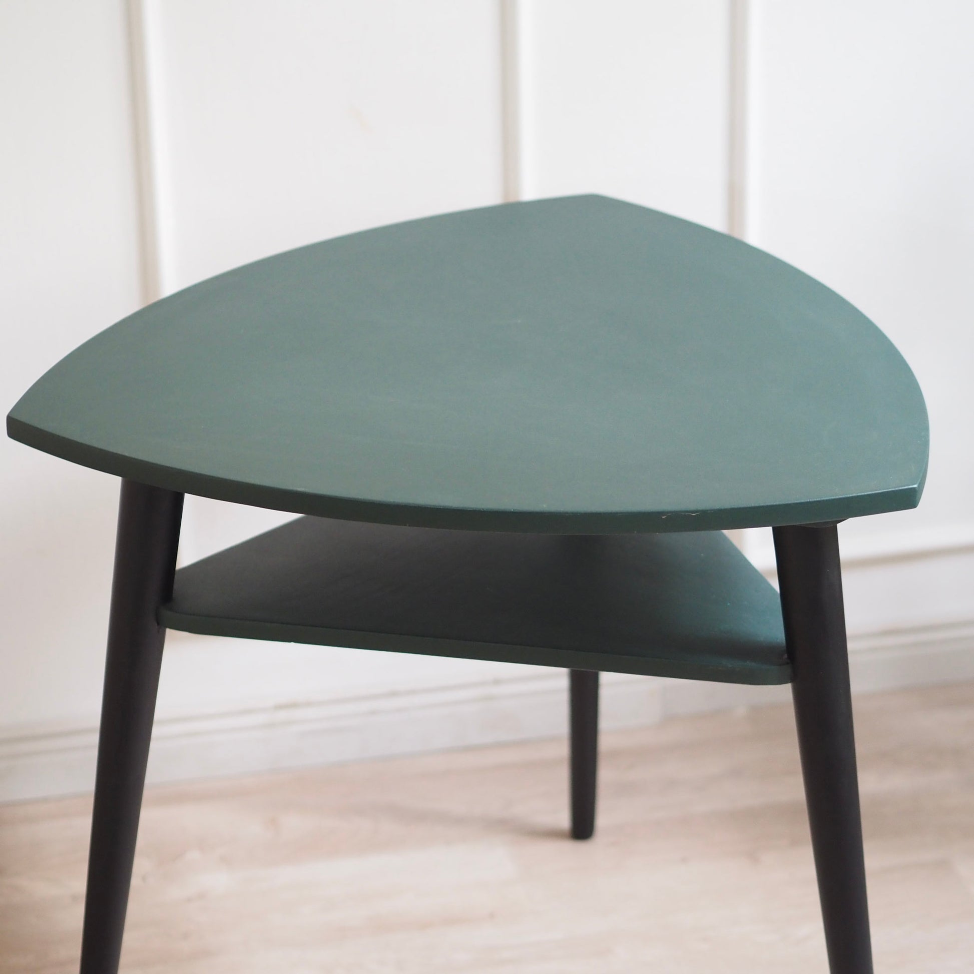 Außergewöhnlicher Vintage Beistelltisch im Mid Century Design mit dreieckiger Form und Ablage. Die grüne Tischplatte in matter Optik sorgt für einen stilvollen Kontrast zu den schwarzen Beinen. Vielseitig stellbar und kombinierbar im Raum.