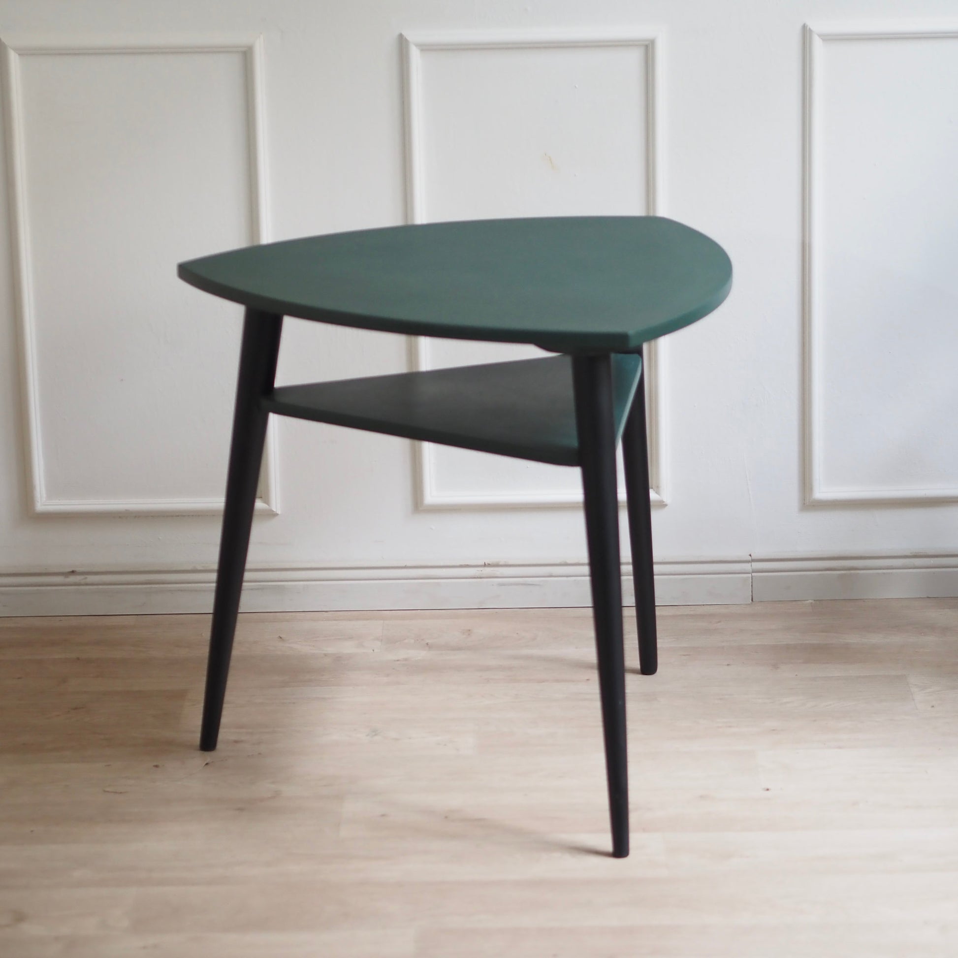 EPOCHE 1960 - Dreieckiger Mid Century Tisch in Grün Schwarz mit Ablage, Skandinavisch