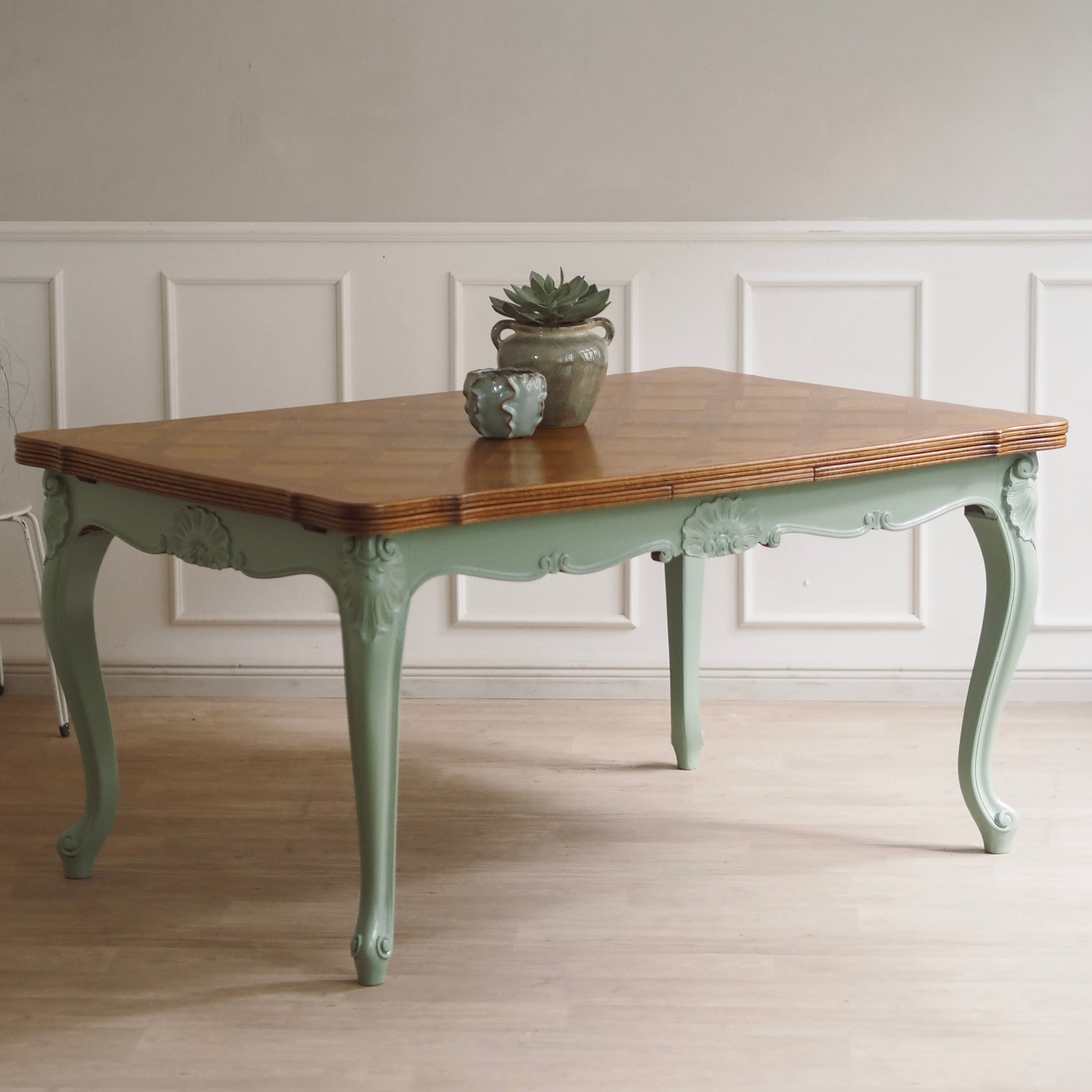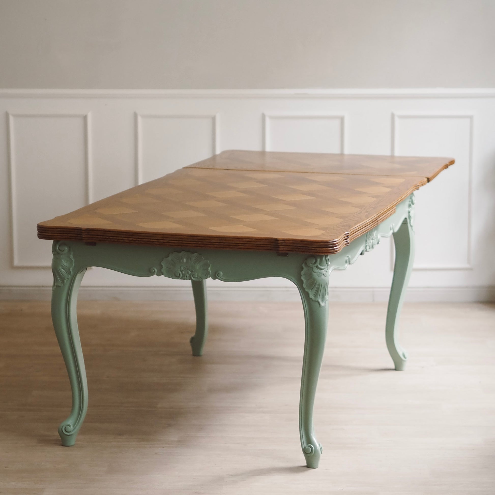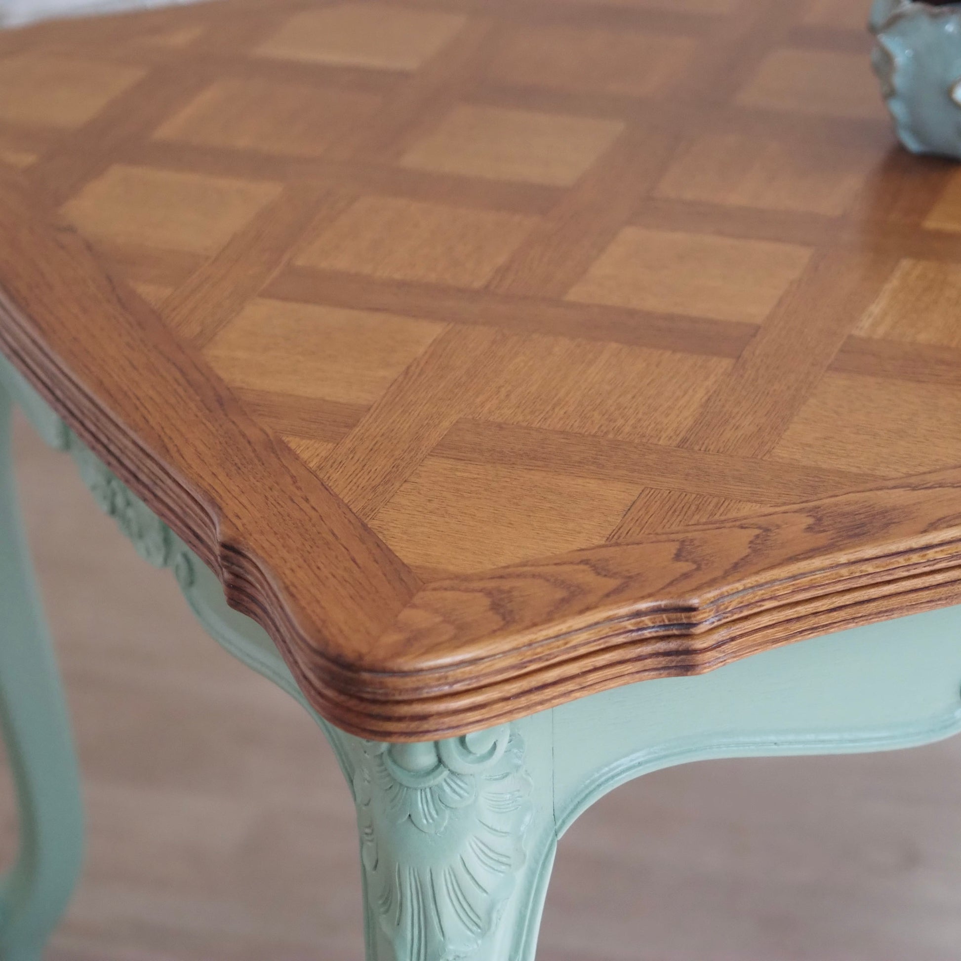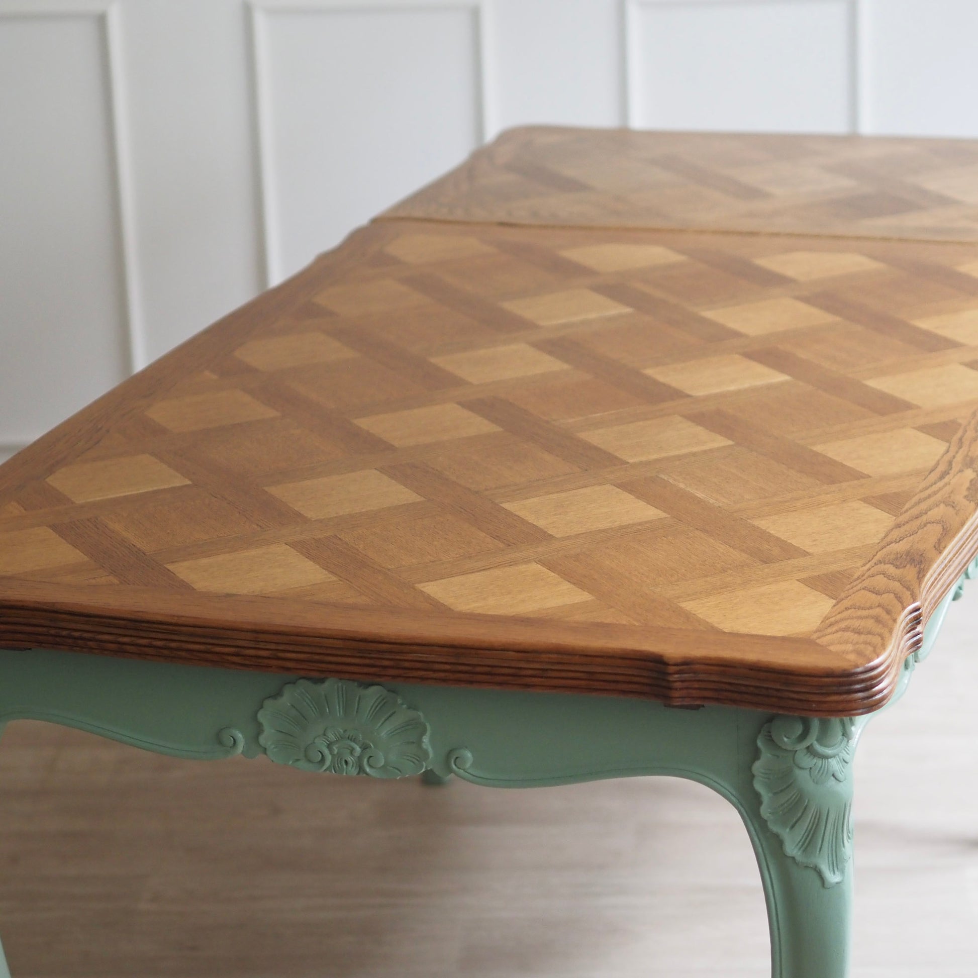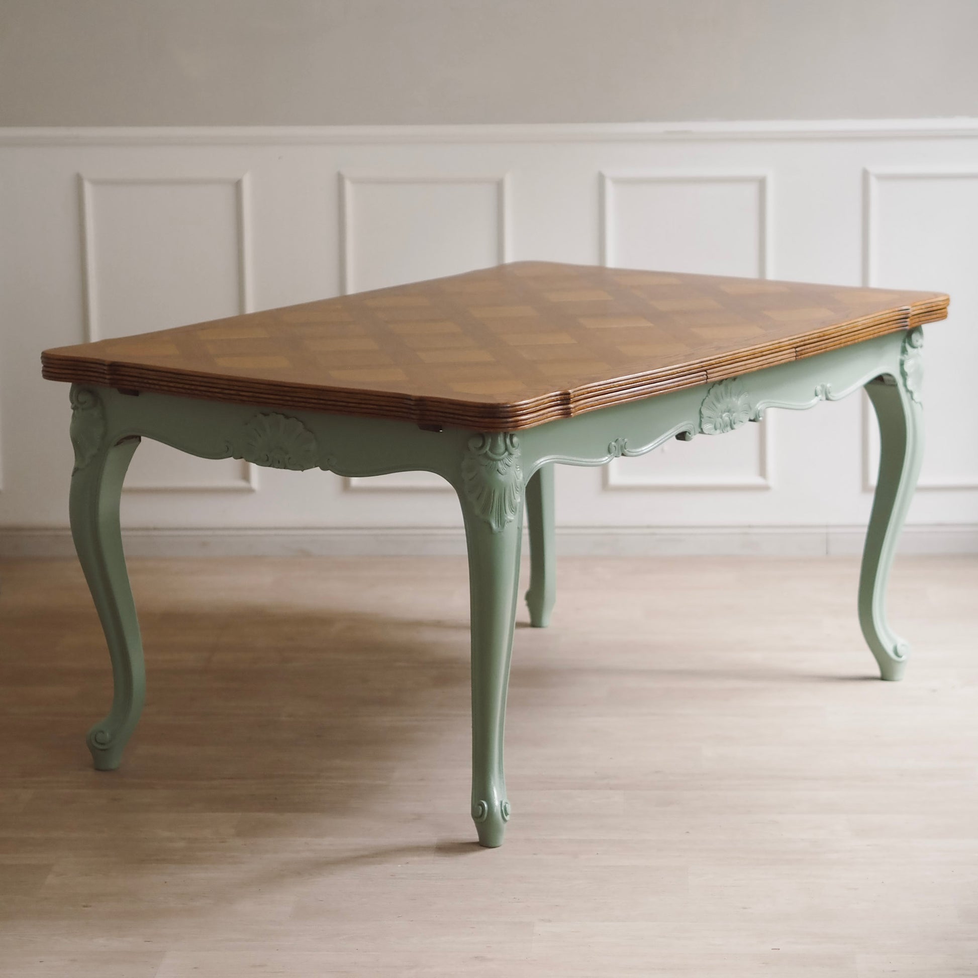 EPOCHE 1920 - Französischer Landhaus Esstisch in mintgrün mit heller Intarsienplatte