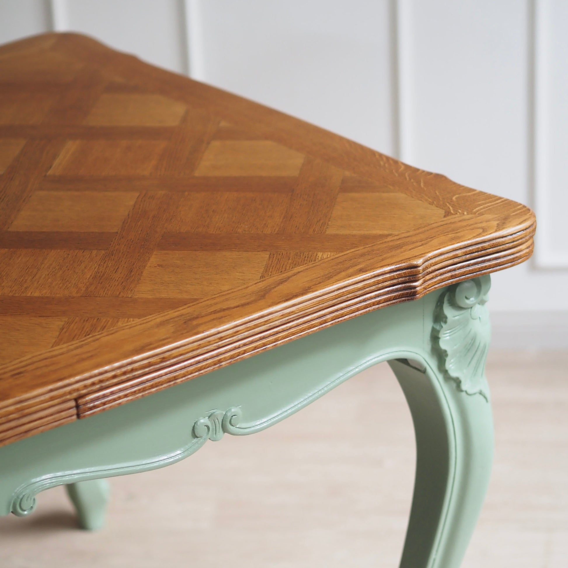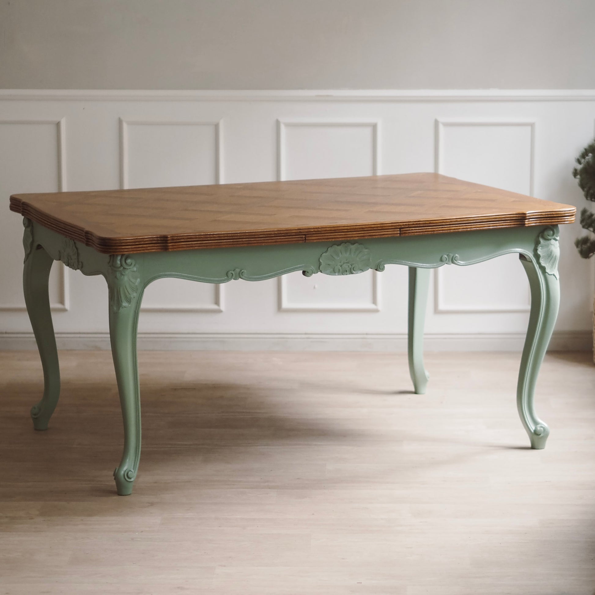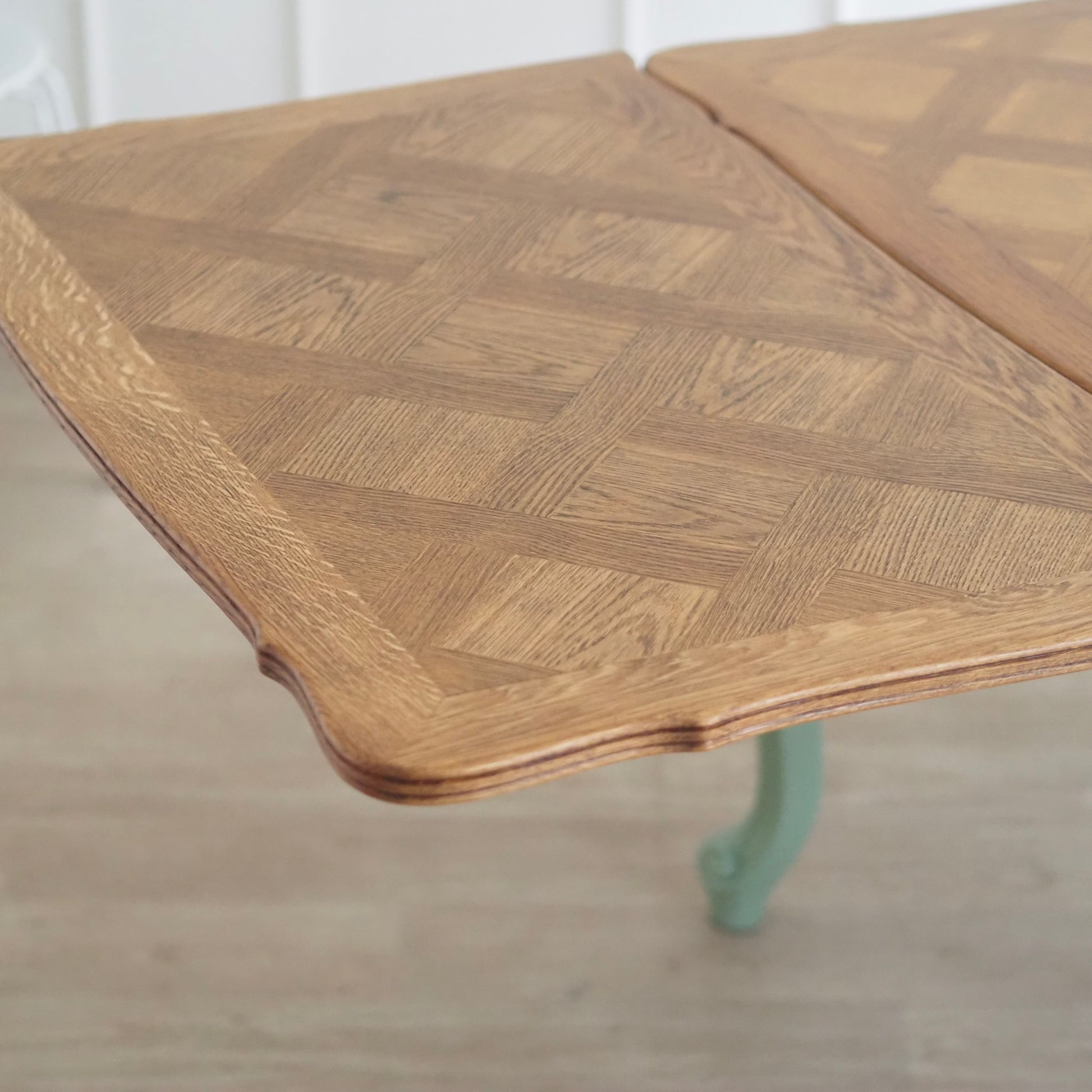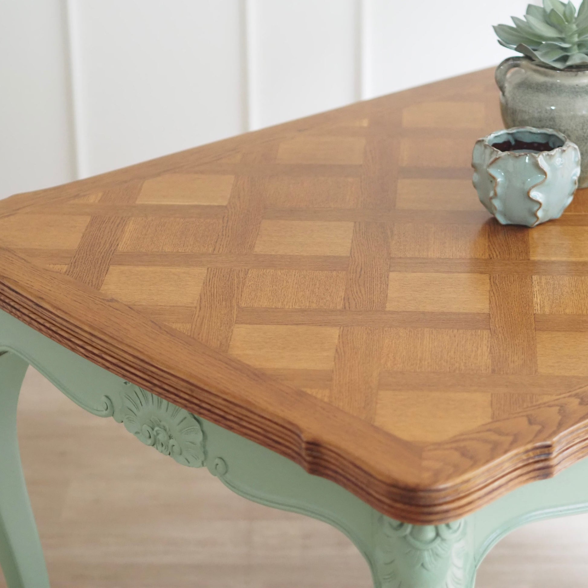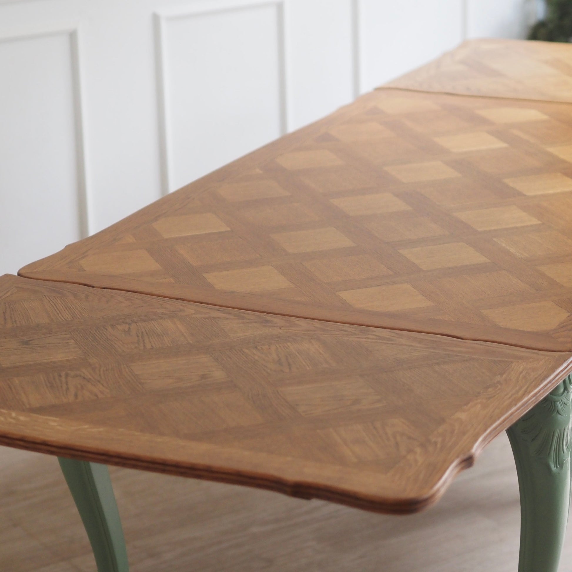 EPOCHE 1920 - Französischer Landhaus Esstisch in mintgrün mit heller Intarsienplatte