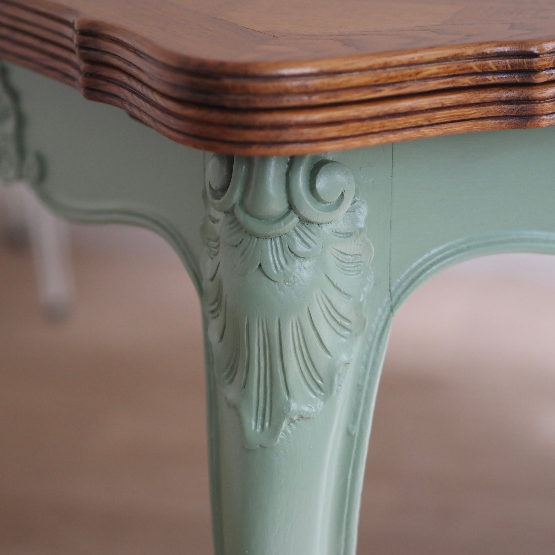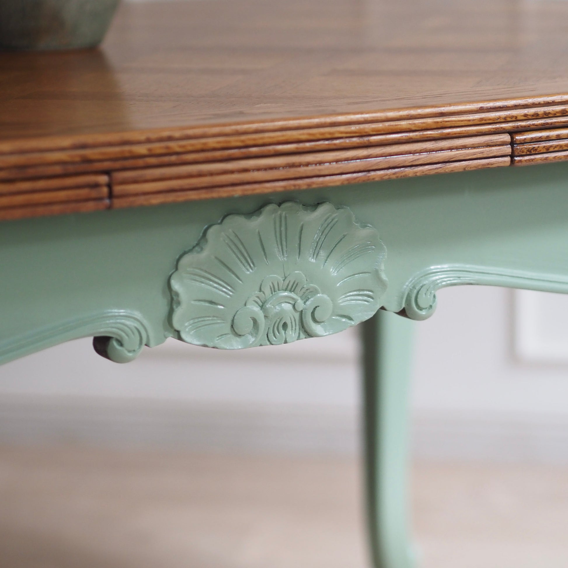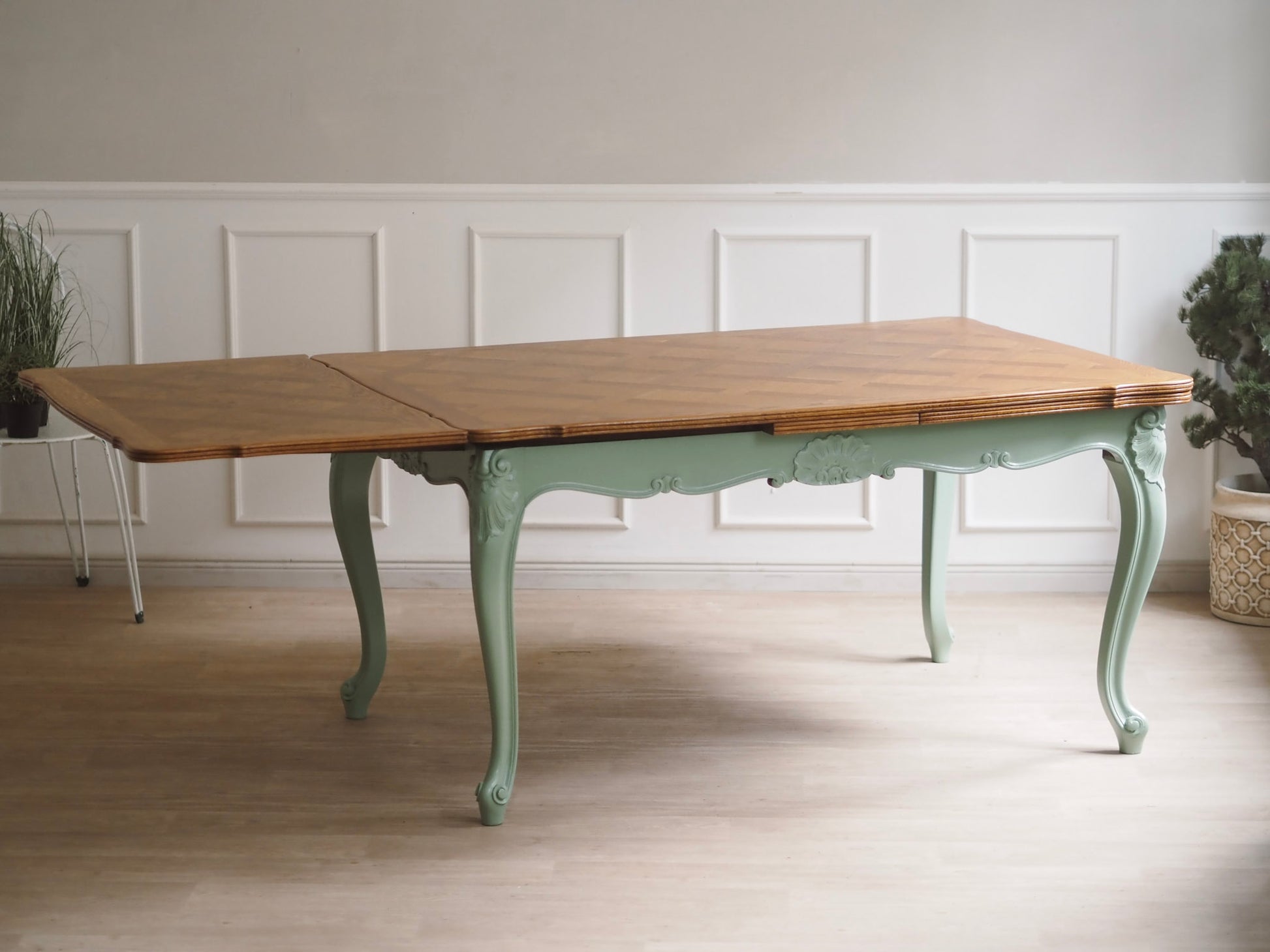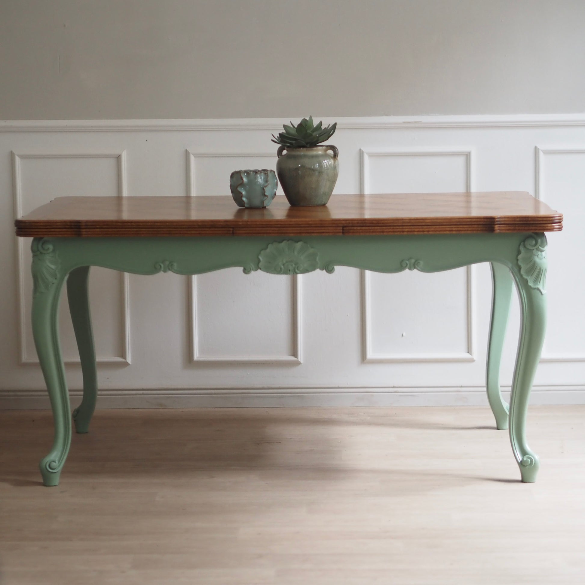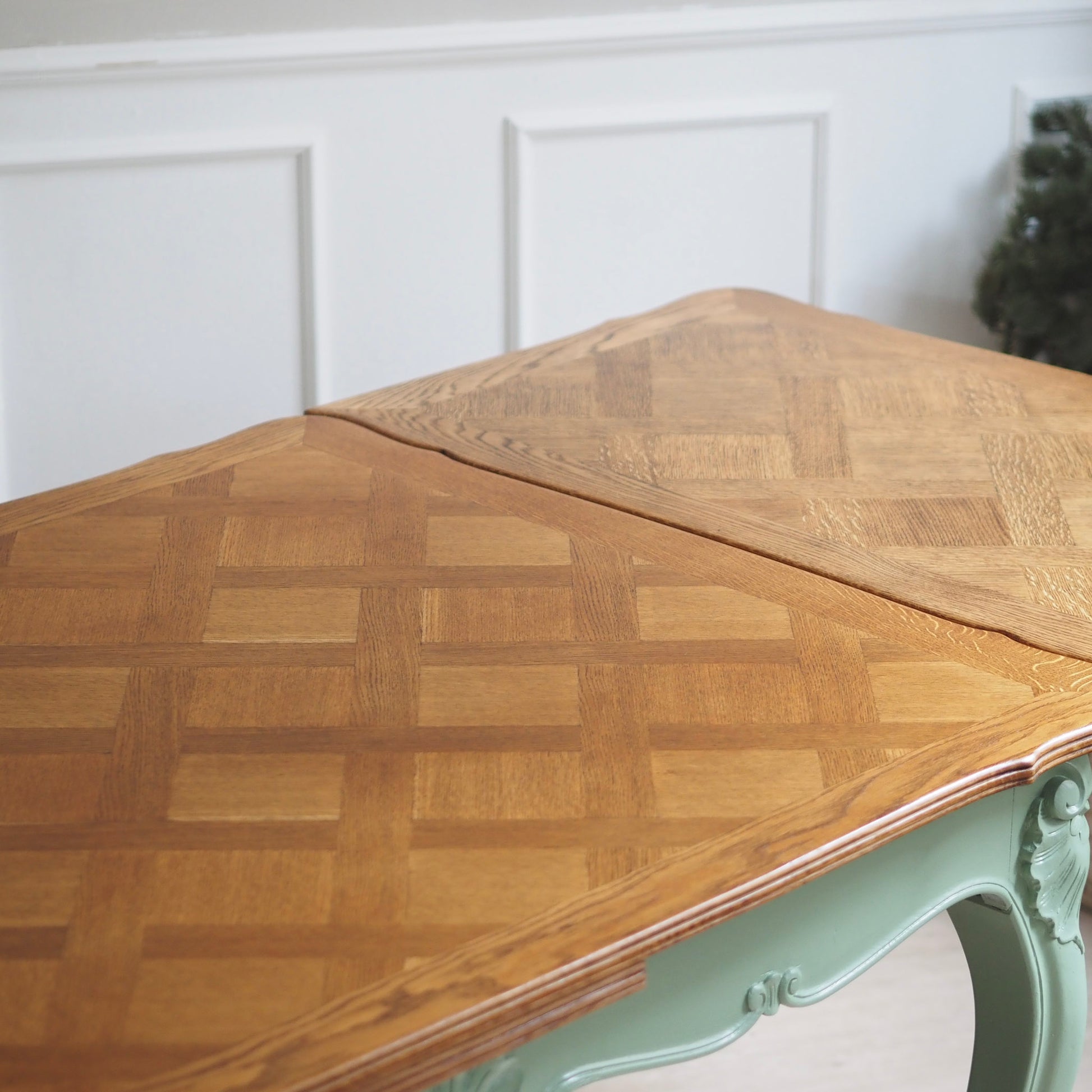 EPOCHE 1920 - Französischer Landhaus Esstisch in mintgrün mit heller Intarsienplatte