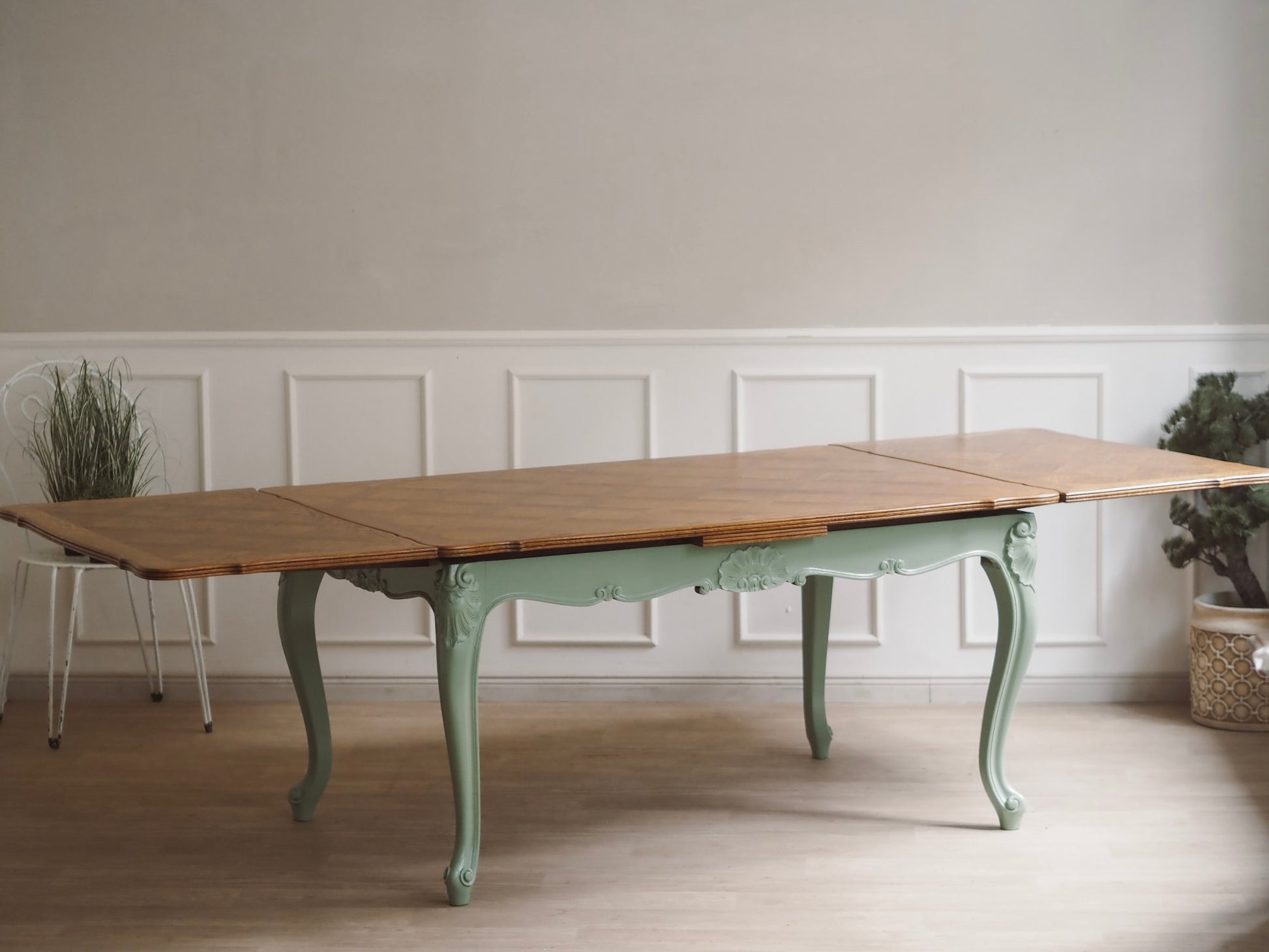 Wunderschöner und einzigartiger französischer Esstisch im Landhaus-Stil mit mintgrünen Beinen und einer kunstvollen Natur-Holzplatte. Ausziehbar auf beiden Seiten mit einer maximalen Länge von satten 263cm. Platz für bis zu 10 Personen. Einzigartig, komfortabel und sehr stabil (massives Eichenholz). Perfekt für stilvolle Essbereiche und Liebhaber von natürlichem und hellem Landhaus-Design. Ein Statement-Möbelstück für Individualisten!